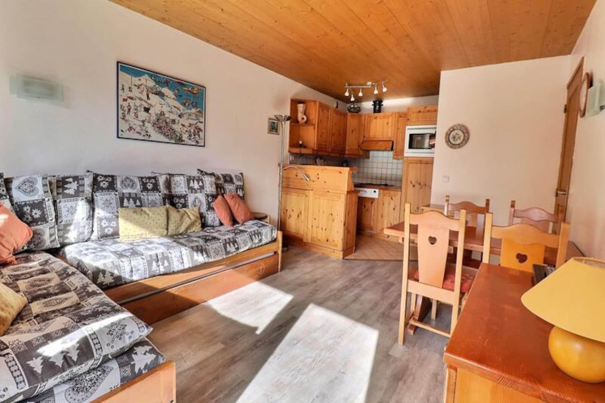 I hjertet af det fortryllende Méribel-Mottaret tilbyder denne charmerende lejlighed i Plein Soleil-residensen en perfekt alpin flugt. Forestil dig at vågne op til den friske bjergluft, træde ud på din sydvendte balkon og betragte de majestætiske tinder, der omgiver dig. Med sin uovertrufne ski-in, ski-out-beliggenhed kan du glide direkte fra skiboksene til de uberørte pister og fordybe dig i det verdensklasse skiområde Les Trois Vallées. Uanset om du er her for vintersport eller sommervandreture, placerer denne residens dig i centrum af det hele. \n\nLejligheden, der er bedømt med 3 stjerner og bærer det prestigefyldte Méribel-mærke, er omhyggeligt designet til op til fem gæster. Den hyggelige stue har en sovesofa til enkeltpersoner og et sæt udtrækssenge, mens det separate soveværelse har to komfortable enkeltsenge. Køkkenet er fuldt udstyret med moderne apparater, herunder en kombineret mikrobølgeovn, opvaskemaskine og kaffemaskine, hvilket gør det nemt at tilberede solide måltider efter en dag med eventyr. Et fladskærms-tv, gratis Wi-Fi i opholdsstuen og en vaskemaskine bidrager til bekvemmeligheden og sikrer et behageligt og stressfrit ophold. \n\nUd over lejligheden kan Plein Soleil prale af en førsteklasses beliggenhed nær butikker og faciliteter i hjertet af Mottaret. Chalets-svævebanen, kun få skridt væk, giver gratis og nem adgang til Hameau- og Laitelet-områderne fra tidlig morgen til sen aften. Uanset om du udforsker den pulserende landsby eller begiver dig ud på en spændende dag på pisterne, er alt hvad du behøver inden for rækkevidde. \n\nDette dejlige tilflugtssted kombinerer charme, komfort og en uovertruffen beliggenhed, hvilket gør det til det ideelle valg for familier, par eller venner, der søger en uforglemmelig alpin ferie. Lad magien i Méribel-Mottaret fange dig, mens du skaber minder for livet.