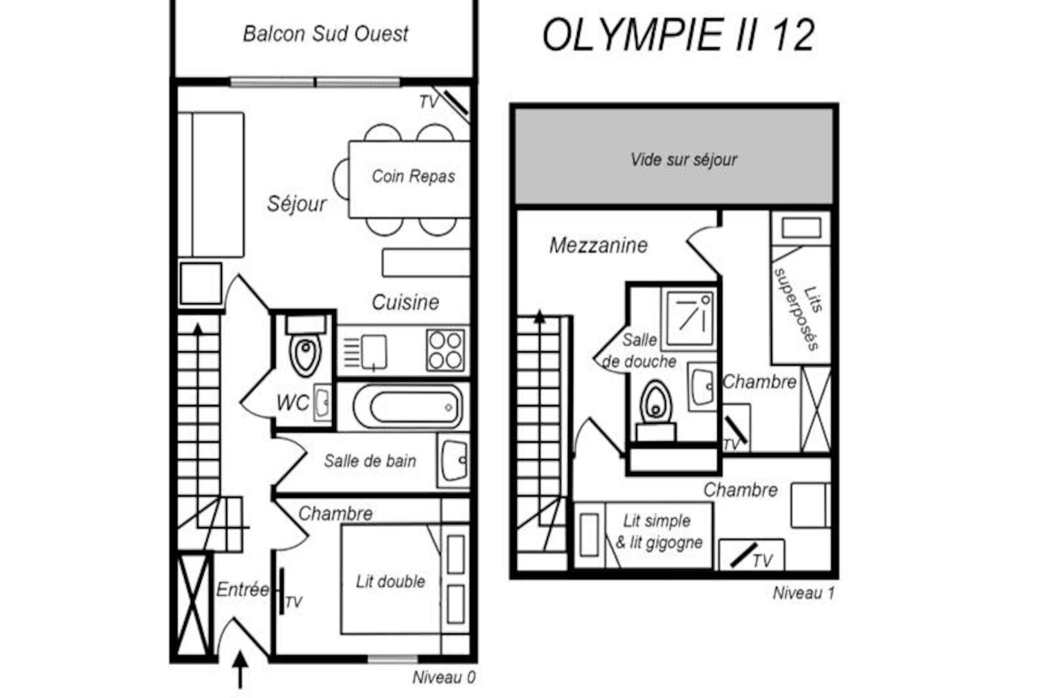 I udkanten af ??en fredfyldt alpin enklave tilbyder Olympie 2-residensen et roligt tilflugtssted kun få øjeblikke fra Méribels pister. Forestil dig at vågne op til den friske bjergluft og træde ud på din sydvestvendte balkon for at beundre den betagende udsigt over snedækkede tinder. Denne charmerende duplexlejlighed, der er bedømt med 3 stjerner, er omhyggeligt designet til at rumme op til seks gæster, hvilket gør den ideel til familier eller små grupper, der søger en hyggelig, men eventyrlig ferie i hjertet af de franske alper. \n\nIndenfor har lejligheden en varm og indbydende opholdsstue med en sovesofa, et fuldt udstyret køkken med moderne apparater såsom ovn, mikrobølgeovn, opvaskemaskine og keramiske kogeplader samt en spiseplads, der er perfekt til at dele måltider efter en dag på pisterne. Sovepladserne omfatter et soveværelse med dobbeltseng, et lille værelse med køjesenge og en hems med udtrækssenge, hvilket sikrer komfort og privatliv for alle. Lejligheden har også to badeværelser, det ene med bruser, og fire fladskærms-tv'er til underholdning. \n\nResidensens beliggenhed er en skiløbers drøm. En kort gåtur på 150 meter fører dig til en snedækket sti, der forbinder den blå piste, mens en gåtur på 300 meter bringer dig til den røde Aigle-piste og det primære afgangssted for skilifterne. Det nærliggende Châtelet-indkøbscenter, kun 400 meter væk, tilbyder nem adgang til butikker, restauranter og et busstoppested, så du kan udforske det bredere Méribel-område. \n\nUanset om du er her for at slentre gennem uberørte pister, vandre på naturskønne stier eller blot slappe af i den rolige alpine atmosfære, tilbyder Olympie 2 den perfekte blanding af komfort, bekvemmelighed og charme til en uforglemmelig bjergferie.