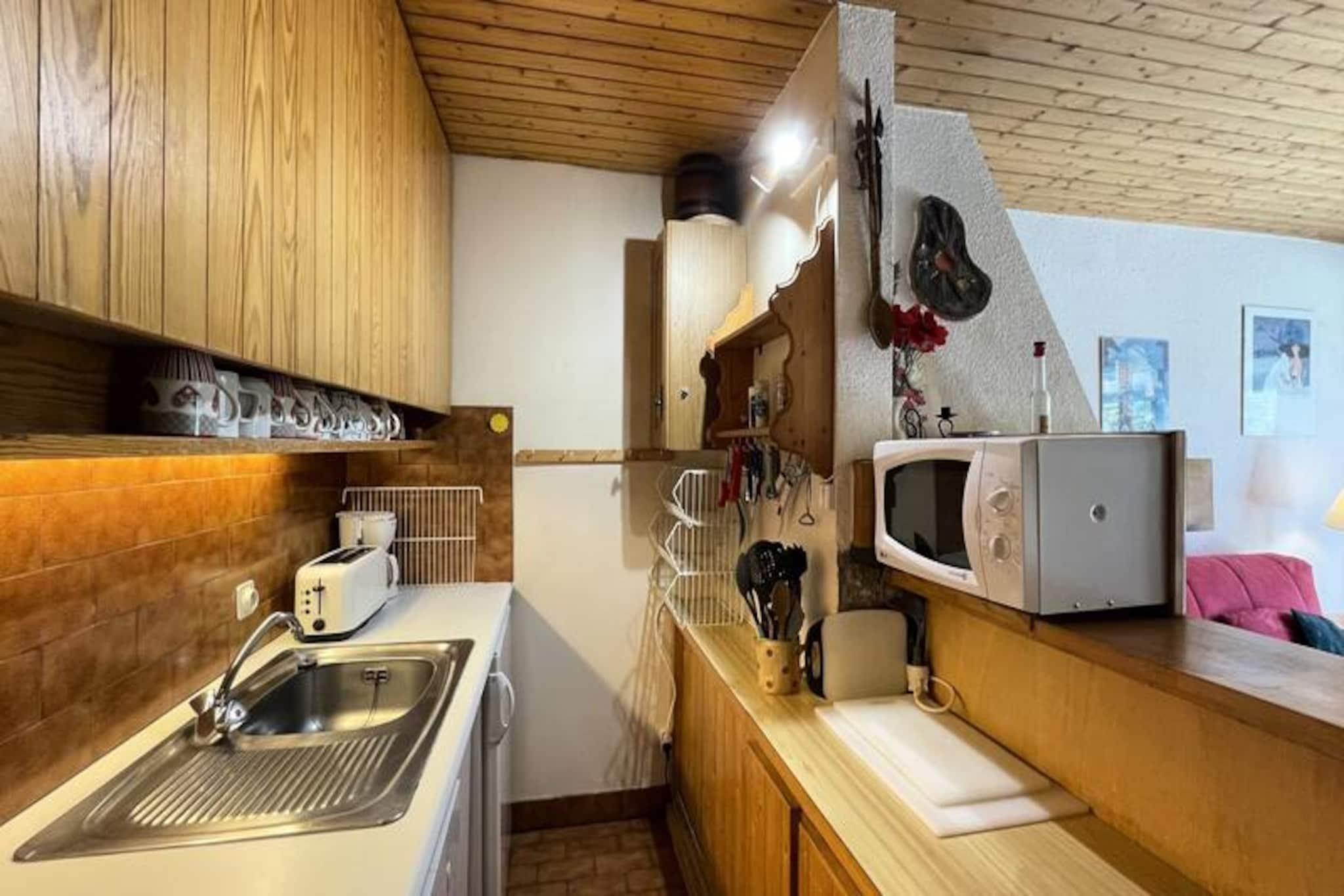 I hjertet af Méribel, langs den prestigefyldte Route des Chalets, tilbyder dette hyggelige alpine tilflugtssted en perfekt blanding af charme og bekvemmelighed til din næste bjergferie. Forestil dig at træde ud af din bolig og være kun få øjeblikke væk fra pisterne og de pulserende butikker på plateauet, alt imens du nyder den fredfyldte skønhed i de franske alper. Med sin vestvendte terrasse inviterer denne lejlighed dig til at slappe af og nyde de gyldne nuancer af den nedgående sol efter en dag med alpine eventyr. Denne 35 m² store lejlighed er omhyggeligt designet til at rumme op til fire gæster, hvilket gør den til et ideelt valg for par eller små familier. Stuen har en komfortabel dobbeltsovesofa, mens soveværelset tilbyder to enkeltsenge til en god nats søvn. Det åbne køkken er fuldt udstyret med moderne apparater, herunder elektrisk komfur, ovn, mikrobølgeovn, opvaskemaskine og køleskab/fryser, hvilket sikrer, at du har alt, hvad du behøver for at tilberede solide måltider. Et badeværelse med badekar og et separat toilet bidrager til bekvemmeligheden, mens et lille fjernsyn og et skiskab fuldender faciliteterne for et problemfrit ophold. Méribels charme ligger ikke kun i dens skiløb i verdensklasse, men også i dens pulserende afterski-scene og maleriske alpine omgivelser. Uanset om du er på pisterne, udforsker de lokale butikker eller blot slapper af på din terrasse med en varm drink, placerer denne bolig dig i hjertet af det hele. Kæledyr er velkomne, og yderligere tjenester som Wi-Fi-udlejning og nedsatte liftkort gør dit ophold endnu mere behageligt. Vælg denne dejlige lejlighed til en mindeværdig alpeferie, hvor komfort, bekvemmelighed og Méribels magi forenes for at skabe uforglemmelige øjeblikke.