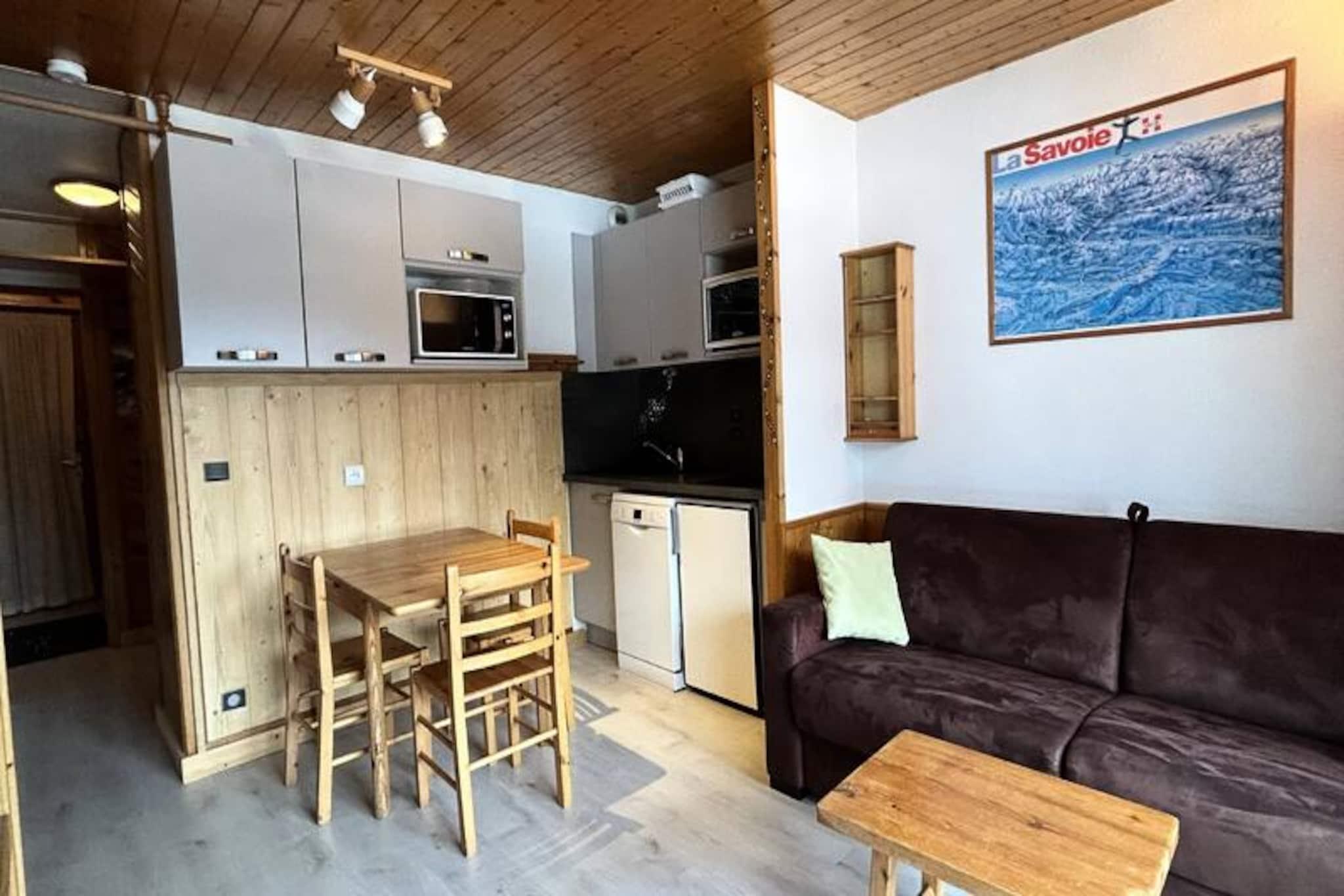 Højt over Tueda-søens glitrende vand og indrammet af den majestætiske Mont Vallon, tilbyder denne charmerende lejlighed i Méribel Mottaret et roligt alpint tilflugtssted med direkte adgang til Aigle-skibakken. Vågn op til en betagende udsigt og eventyrlyst, når du træder ud på balkonen og indånder den friske bjergluft. Uanset om du er her for vintersport eller sommervandreture, er denne bolig perfekt placeret til at fordybe dig i de franske alpers naturlige skønhed. \n\nIndenfor kombinerer lejligheden komfort og praktisk anvendelighed. Stuen har en hyggelig sovesofa og et tv, mens et separat soveområde har køjesenge for ekstra bekvemmelighed. Tekøkkenet er fuldt udstyret med moderne apparater såsom keramisk kogeplade, ovn, mikrobølgeovn, opvaskemaskine og mere, hvilket gør det nemt at tilberede solide måltider efter en dag med udforskning. Badeværelset tilbyder gennemtænkte detaljer som en håndklædetørrer, og det separate toilet sikrer privatliv. Yderligere faciliteter inkluderer et skiskab, elevatoradgang og en balkon, der inviterer dig til at slappe af med en fantastisk udsigt over alperne. Bemærk venligst, at kæledyr ikke er tilladt, og lejligheden er røgfri.\n\nResidensen Les Plattières ligger i Châtelet-kvarteret, et nyudviklet område forbundet med Méribel Mottarets feriestedscentrum og butikker via en bekvem kabelbane. Med direkte adgang til ESF-skiskolens mødested er denne beliggenhed ideel for både familier og skientusiaster. I de varmere måneder forvandles området til et paradis for vandrere og naturelskere med stier, der fører til Tueda-søen og videre.\n\nUanset om du søger spændende skiløjper, rolige gåture ved søen eller blot et hyggeligt sted at slappe af, tilbyder denne lejlighed den perfekte base for en uforglemmelig alpin flugt.