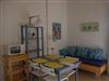 It features a living room with open kitchenette, two bedrooms, a bathroom and a terrace. The living room has a dining table with chairs and a sofa bed for one person (size 1.20m x 1.90m). The kitchen includes a fridge, freezer, gas cooker, coffee machine and kettle. The two bedrooms have a double bed (1.60m x 1.90m) and two separate single beds (0.80m x 1.90m/0.70m x 1.90m). The bathroom has a shower, toilet and sink. There is electric heating in the bathroom and living room.