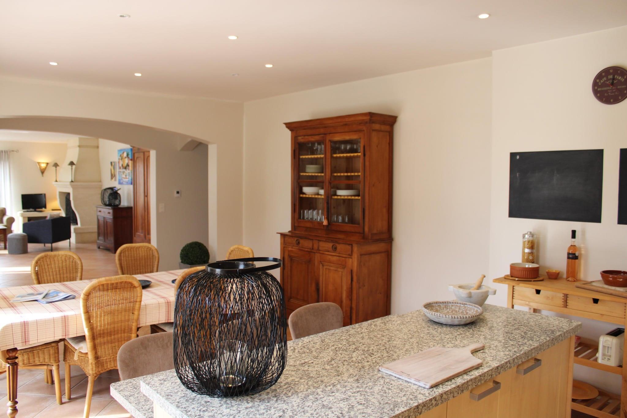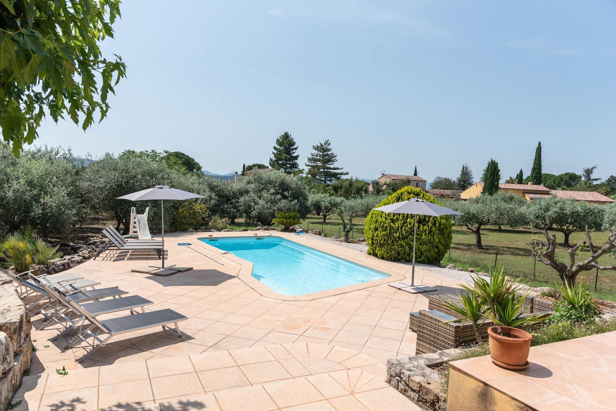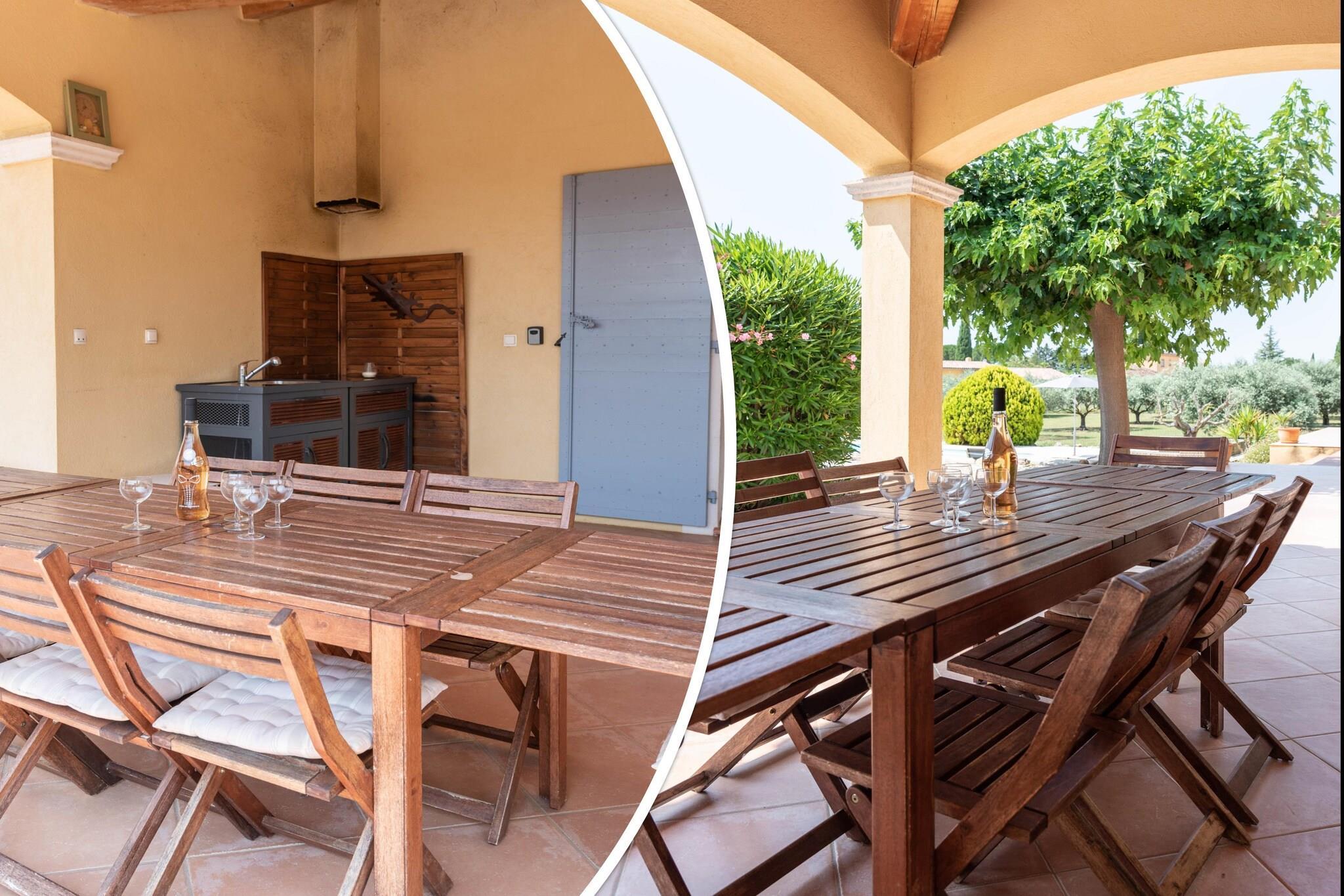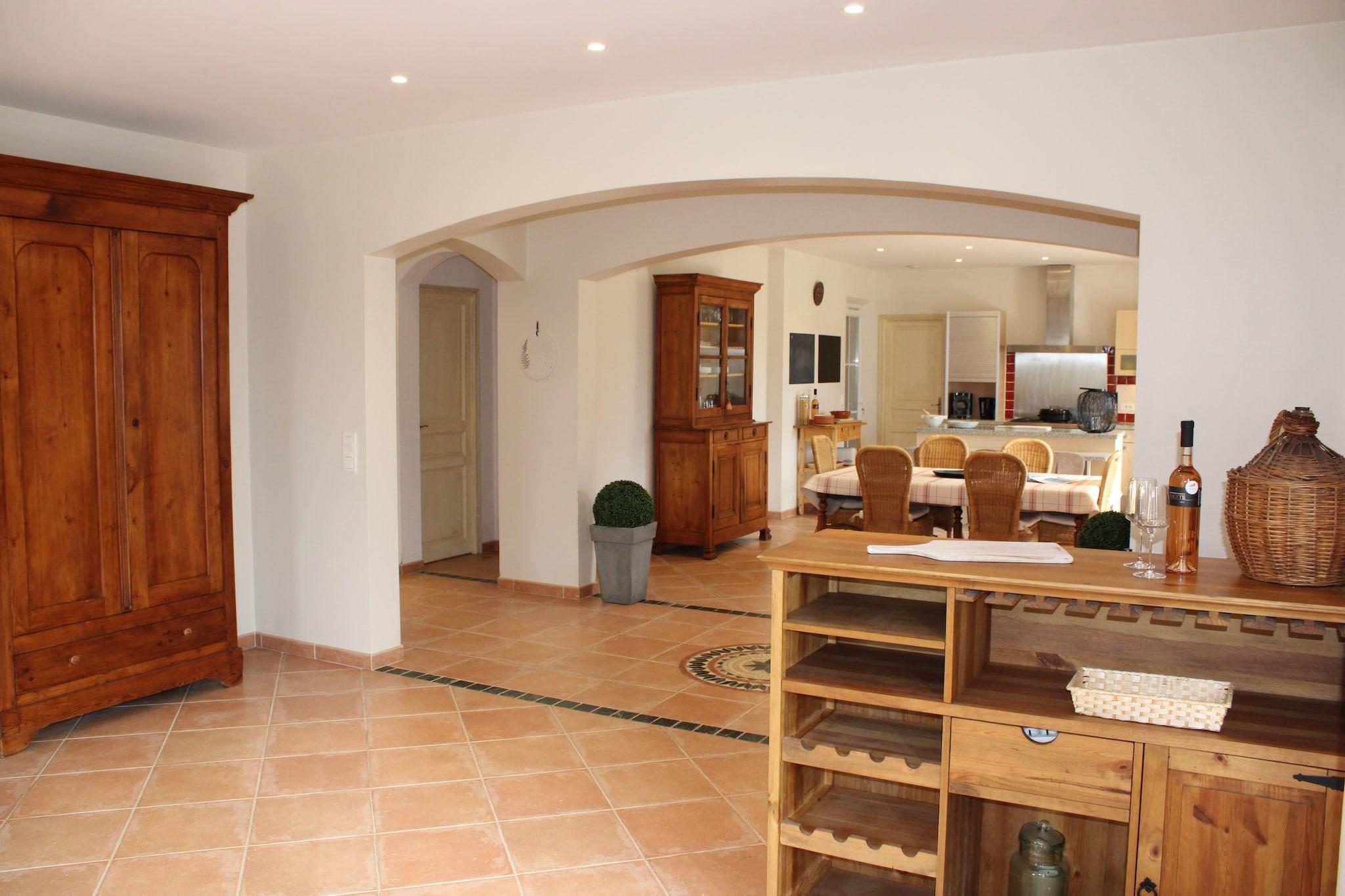 Bastide le Colombier er en smuk provencalsk bastide på en privat ejendom på 2000 m², omgivet af gamle oliventræer og med smuk udsigt og masser af privatliv. Du når frem til bastiden via indkørslen gennem olivenlunden. Her er rigelig parkering til flere biler. Til børnene er der et børnehus og en rutsjebane i haven. Der er cirka 5 minutters gang til centrum af Les Arcs, hvor du finder bager, slagter og forskellige terrasser og restauranter. Hyper Marche of Les Arcs (meget stort supermarked) ligger 5 minutters kørsel derfra. Regionen er hjemsted for adskillige vinslotte og de berømte provencalske markeder. Tirsdag morgen marked i Lorgues kan varmt anbefales! Strandene i Fréjus og St. Tropez ligger 35 km væk, og byerne Nice, Cannes, Toulon/Hyers kan alle nås inden for 1 time. Både stue og spisestue og køkken har store terrassedøre, der fører til terrasser og haven. Stuen har et dejligt opholdsområde med pejs og WiFi er tilgængeligt. Det luksuriøse åbne køkken støder op til spisestuen og er fuldt udstyret. Huset opvarmes og køles gennem gulvet (gennemsnitligt 25 grader) og soveværelserne er forsynet med masser af atmosfære og komfort. Fra første sal har du en smuk udsigt over haven og swimmingpoolen. Den dejlige private swimmingpool har brede trappetrin, hvor du kan slappe af sammen med en drink efter eget valg. Rundt om poolen finder du masser af liggestole, parasoller og et havemøbelsæt. Det store platantræ nær poolen giver den nødvendige skygge på varme sommerdage. Under den overdækkede terrasse ved siden af ??køkkenet er der et stort spisebord til 8 personer og et udekøkken med en elektrisk plancha.