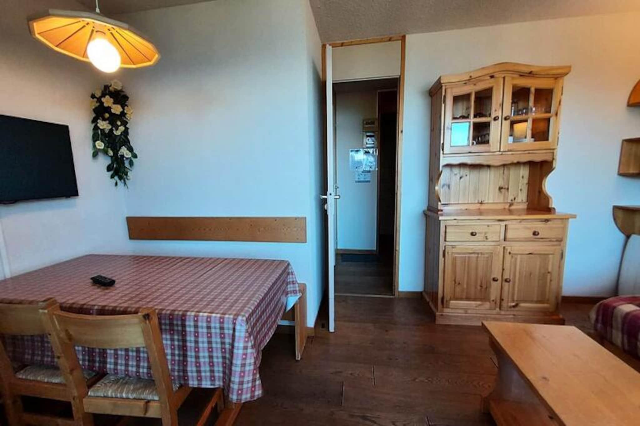 Denne charmerende toværelses lejlighed, der ligger højt oppe i det naturskønne Le Mottet-distrikt i Valmorel, tilbyder et hyggeligt tilflugtssted for både skientusiaster og familier. Med direkte adgang til pisterne og ESF-skiskolen kun få skridt væk, er hvert øjeblik af din alpine ferie fyldt med bekvemmelighed og eventyr. Den gågadebegrænsede landsby sikrer en fredelig atmosfære, mens panoramaudsigten fra den nordvendte balkon giver dig mulighed for at nyde dalens skønhed nedenfor. Uanset om du er her for at grave dig gennem frisk puddersne eller blot slappe af i de fredfyldte bjergomgivelser, er denne lejlighed din port til uforglemmelige minder. \n\nIndvendigt er lejligheden omhyggeligt designet til at rumme op til fem gæster. Soveværelset har en køjeseng og en enkeltseng, mens stuen tilbyder en komfortabel sovesofa til to. Et separat køkken tilbyder alt det nødvendige til at tilberede solide måltider efter en dag på pisterne. Lejligheden er ikke-ryger og byder kæledyr velkommen mod et lille tillæg, hvilket sikrer, at alle i din familie føler sig hjemme. Selvom Wi-Fi ikke er inkluderet, gør den varme atmosfære og den praktiske indretning den til en ideel base for afslapning og kontakt med dine kære. \n\nDen \