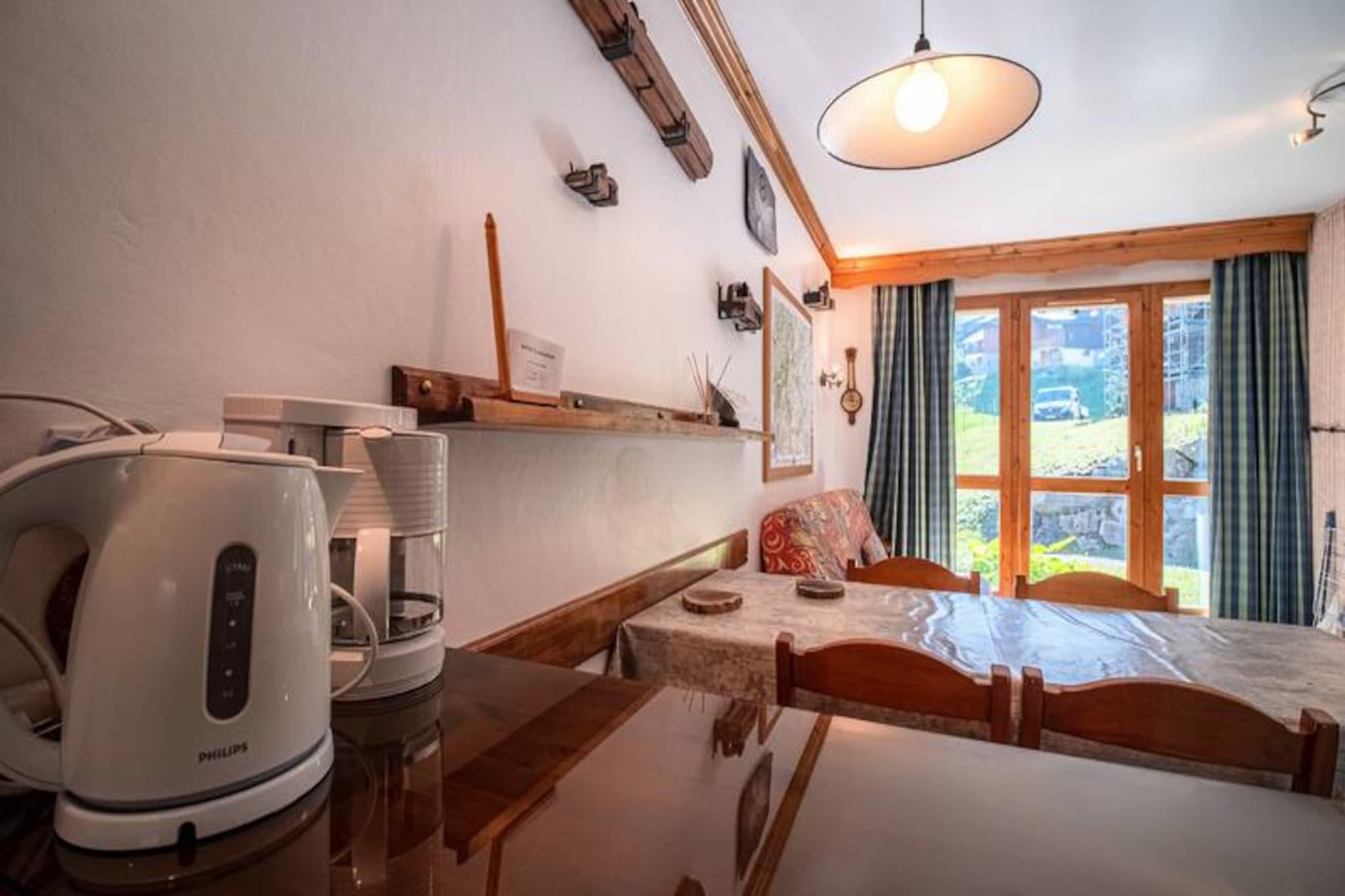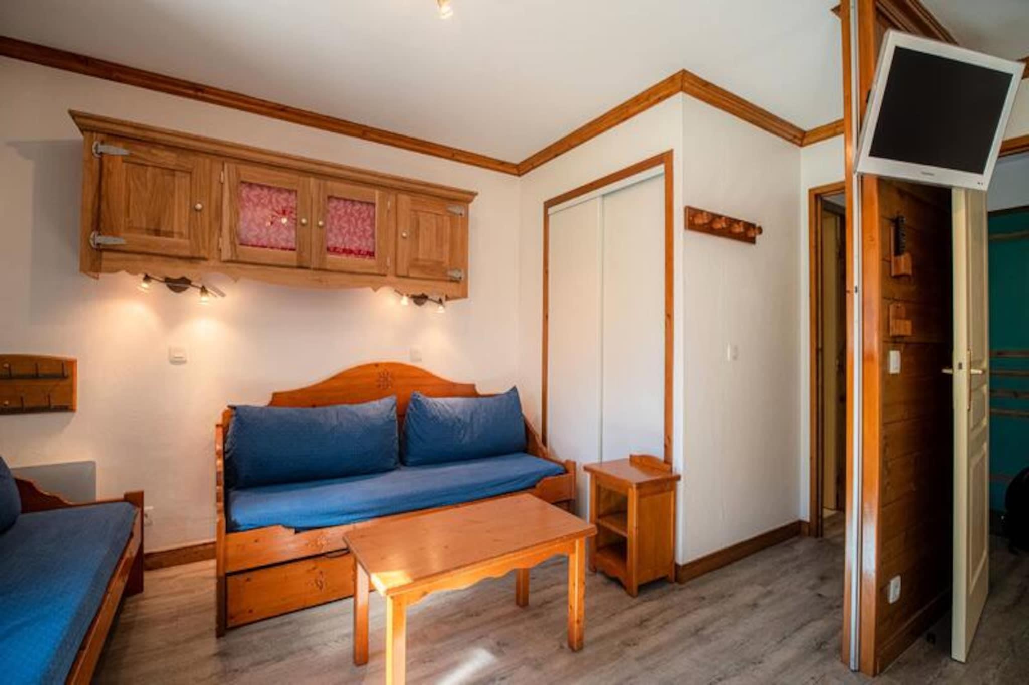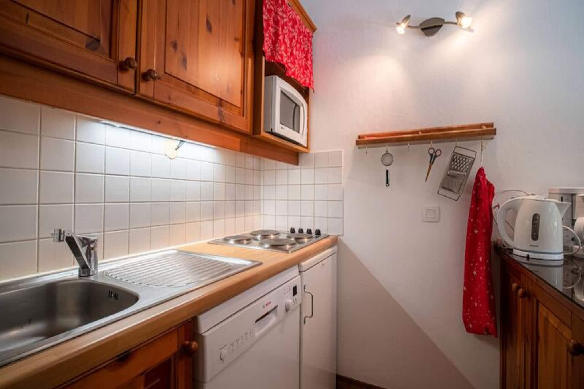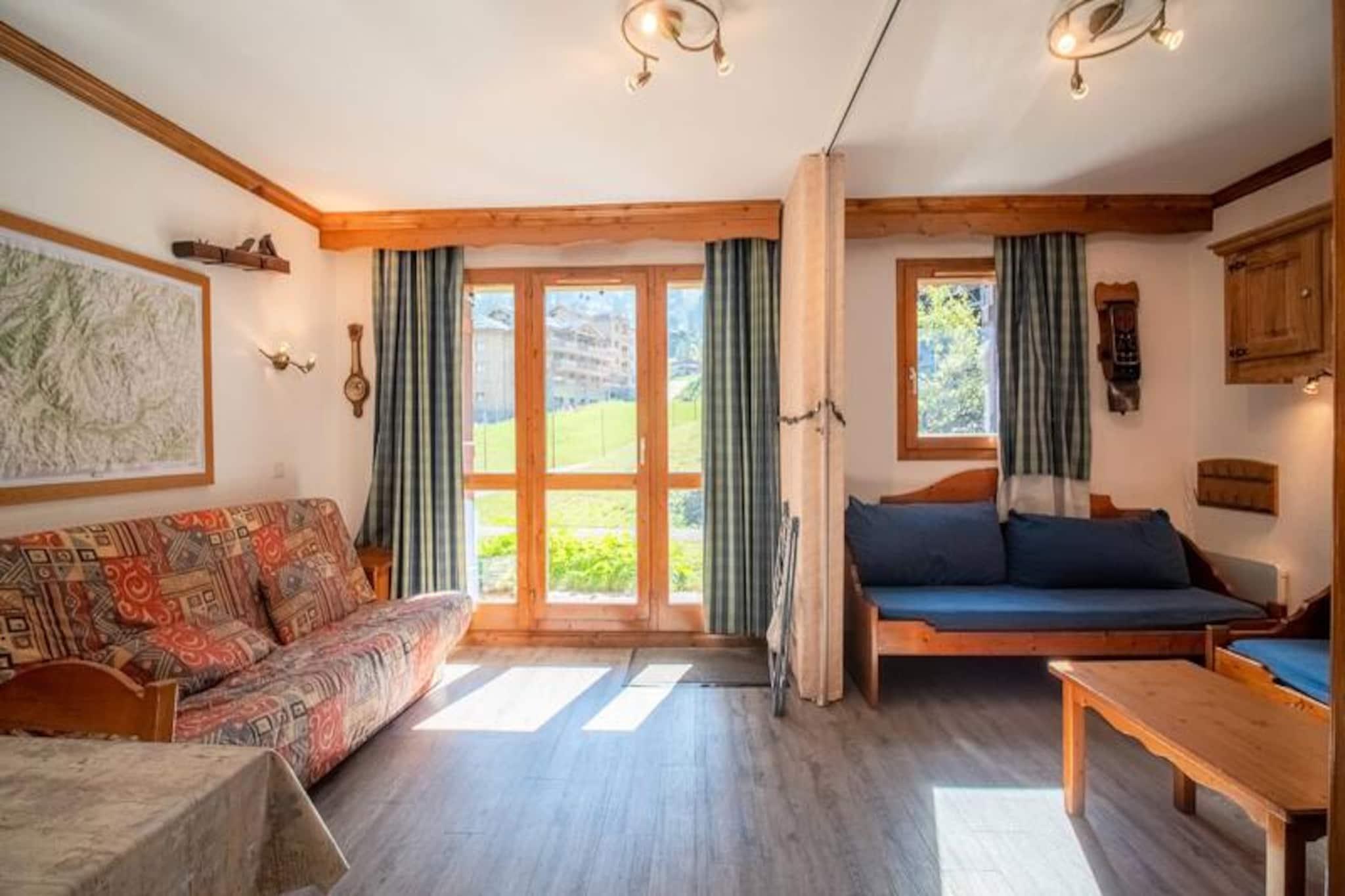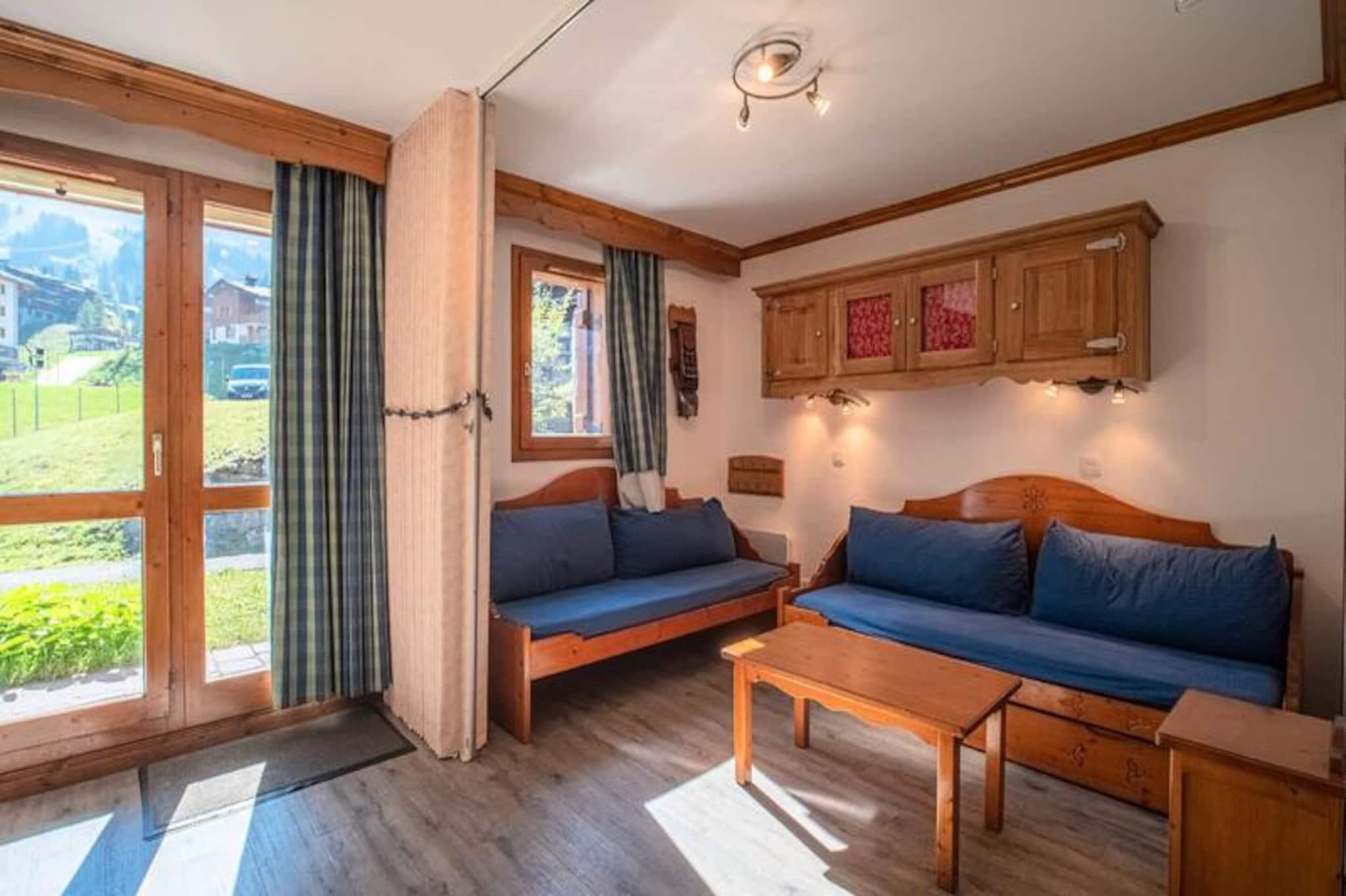 Træd ind i charmen ved de franske alper med denne hyggelige studiolejlighed, perfekt beliggende i hjertet af feriestedet. Kun 200 meter fra skiløjperne og lifterne, og en kort gåtur fra det pulserende feriestedscentrum, tilbyder dette tilflugtssted i stueetagen den ideelle base for dine alpine eventyr. Uanset om du er her for at kæmpe dig gennem frisk puddersne eller nyde den livlige afterskiing-scene, lover hvert øjeblik uforglemmelige minder. Den sydvendte terrasse inviterer dig til at nyde den betagende udsigt over pisterne, en perfekt baggrund for din morgenkaffe eller aftenafslapning. \n\nIndenfor er den 32 m² store lejlighed omhyggeligt designet til at maksimere komfort og funktionalitet. Det åbne køkken er fuldt udstyret med moderne apparater, herunder opvaskemaskine, keramisk kogeplade, mikrobølgeovn og endda et fonduesæt til en ægte alpin spiseoplevelse. Spiseområdet har komfortabel plads til op til fem gæster, mens stuen smart kan opdeles i to separate soveområder. Med en udtrækssovesofa, en enkelt sovesofa og en større sovesofa kan lejligheden nemt rumme op til fem gæster. Et tv bidrager til den hyggelige atmosfære, mens badeværelset og det separate toilet sikrer bekvemmelighed for alle.\n\nResidensen\