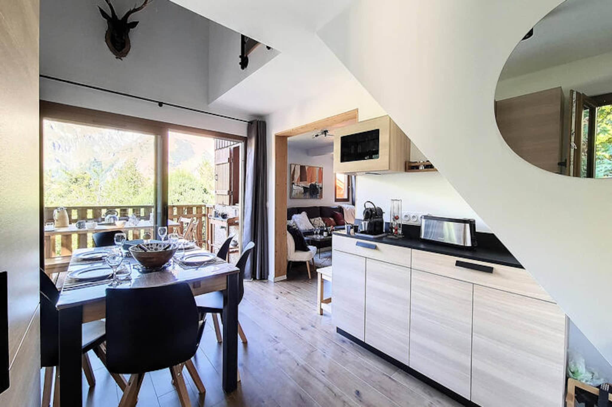 Midt i den fredfyldte charme i Villarencel i Saint-Martin de Belleville tilbyder Chalet Mabé et roligt tilflugtssted omgivet af betagende alpin skønhed. Kun fem minutters gang fra landsbyens centrum og skiliften kombinerer dette chalet bekvemmelighed med fredelige, skovklædte omgivelser, der indbyder til afslapning. Fra den sydvestvendte terrasse kan du nyde den enestående udsigt over Encombres-dalen og den majestætiske Cochet-top, hvilket skaber en uforglemmelig kulisse for din ferie. Uanset om du er her for at stå på ski på de berømte pister eller blot slappe af i naturen, er dette chalet din port til de franske alpers vidundere. \n\nChalet Mabé strækker sig over 87 kvadratmeter og har komfortabel plads til op til seks gæster i sine gennemtænkt designede rum. Stueetagen har en hyggelig stue med brændeovn, tv og dvd-afspiller, perfekt til aftener tilbragt indendørs. Det fuldt udstyrede køkken inkluderer moderne apparater såsom induktionskogeplader, ovn, køleskab, fryser, mikrobølgeovn og en Nespresso-kaffemaskine, hvilket sikrer, at du har alt, hvad du behøver til hjemmelavede måltider. Hvert af de tre soveværelser med eget badeværelse tilbyder privatliv og komfort med faciliteter som bruseniche, håndklædevarmere og rigelig opbevaringsplads. Yderligere faciliteter inkluderer en støvletørrer, skiboks og WiFi-adgang, hvilket gør dit ophold så problemfrit som muligt. \n\nSaint-Martin de Belleville er en perle i skiområdet Les Trois Vallées og tilbyder skiløb i verdensklasse og en charmerende landsbyatmosfære. Ud over pisterne kan du udforske de lokale butikker, restauranter og kulturelle vartegn, eller begive dig ud på de omkringliggende stier for vandreture og sneskovandring. Chaletens Gold Snowflake-kvalitetsmærke garanterer en høj standard af komfort og elegance, hvilket gør det til det perfekte valg for familier, par eller venner, der søger en mindeværdig alpin flugt. Lad Chalet Mabé være dit fristed i bjergene, hvor hvert øjeblik er fyldt med magien fra de franske alper.