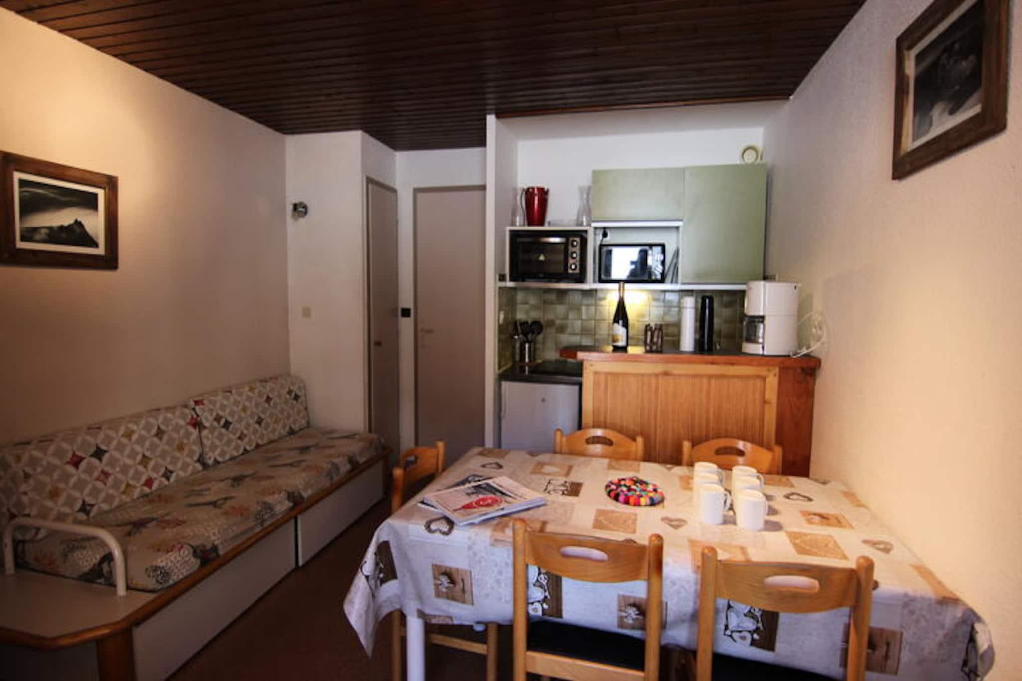 Højt over det pulserende hjerte af Val Thorens, i det fredfyldte Slalom-distrikt, ligger dit perfekte alpine tilflugtssted. Denne charmerende lejlighed i Le Schuss-residensen tilbyder en fredelig oase midt i spændingen ved Europas højest beliggende skisportssted. Forestil dig at vågne op til den friske bjergluft, træde ud på din østvendte balkon og nyde den betagende udsigt over snedækkede tinder, der strækker sig så langt øjet rækker. Uanset om du er her for spændende vintersport eller sommerlige alpine eventyr, sætter denne ejendom scenen for uforglemmelige minder. \n\nLejligheden er designet med komfort og funktionalitet i tankerne og har plads til op til seks gæster. Den hyggelige stue har to enkeltsofaer og et tv, hvilket skaber et indbydende rum at slappe af efter en dag på pisterne. Det veludstyrede tekøkken inkluderer ovn, mikrobølgeovn, keramisk kogeplade, køleskab og opvaskemaskine, så du nemt kan tilberede solide måltider. En dobbeltseng i soveværelset og køjesenge i hytten giver afslappende soveforhold for familier eller vennegrupper. Badeværelset har badekar og håndvask, mens et separat toilet gør dit ophold mere bekvemt. \n\nBeliggende kun 50 meter fra den nærmeste piste, vil du nyde ubesværet adgang til skiløb i verdensklasse. Det nærliggende Péclet indkøbscenter tilbyder alt hvad du behøver, fra lokale butikker og restauranter til skiliftens billetkontor. For ekstra bekvemmelighed er der mulighed for at leje en garage og parkere slalom, og skiudstyr kan lejes hos Skiset Goitschel Sport, kun 150 meter væk. \n\nUanset om du søger spændende skidage, rolige aftener eller den pulserende energi i Val Thorens, tilbyder denne lejlighed den perfekte base for din alpine flugt. Lad magien i de franske alper fortrylle dig, mens du skaber varige minder på denne exceptionelle beliggenhed.