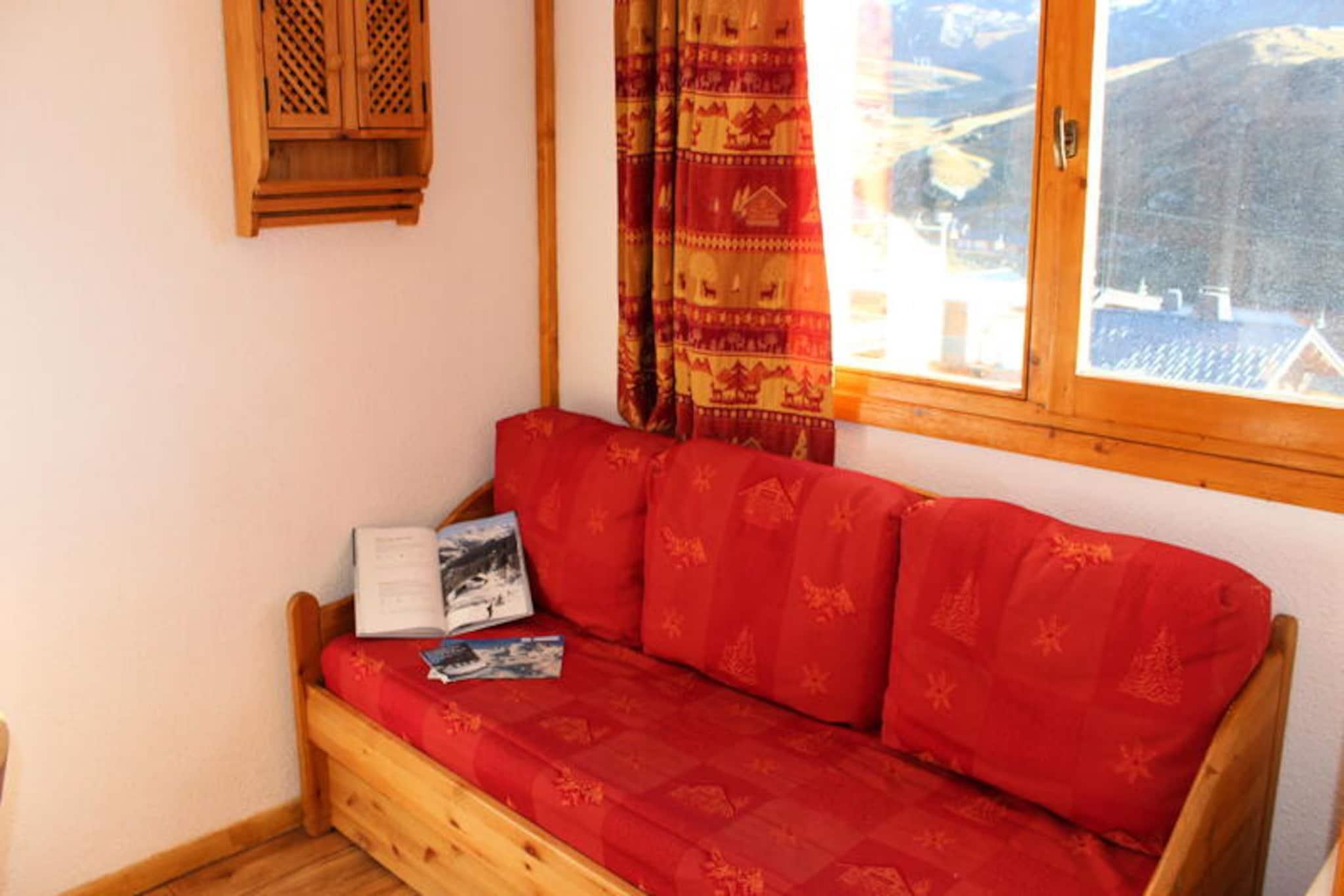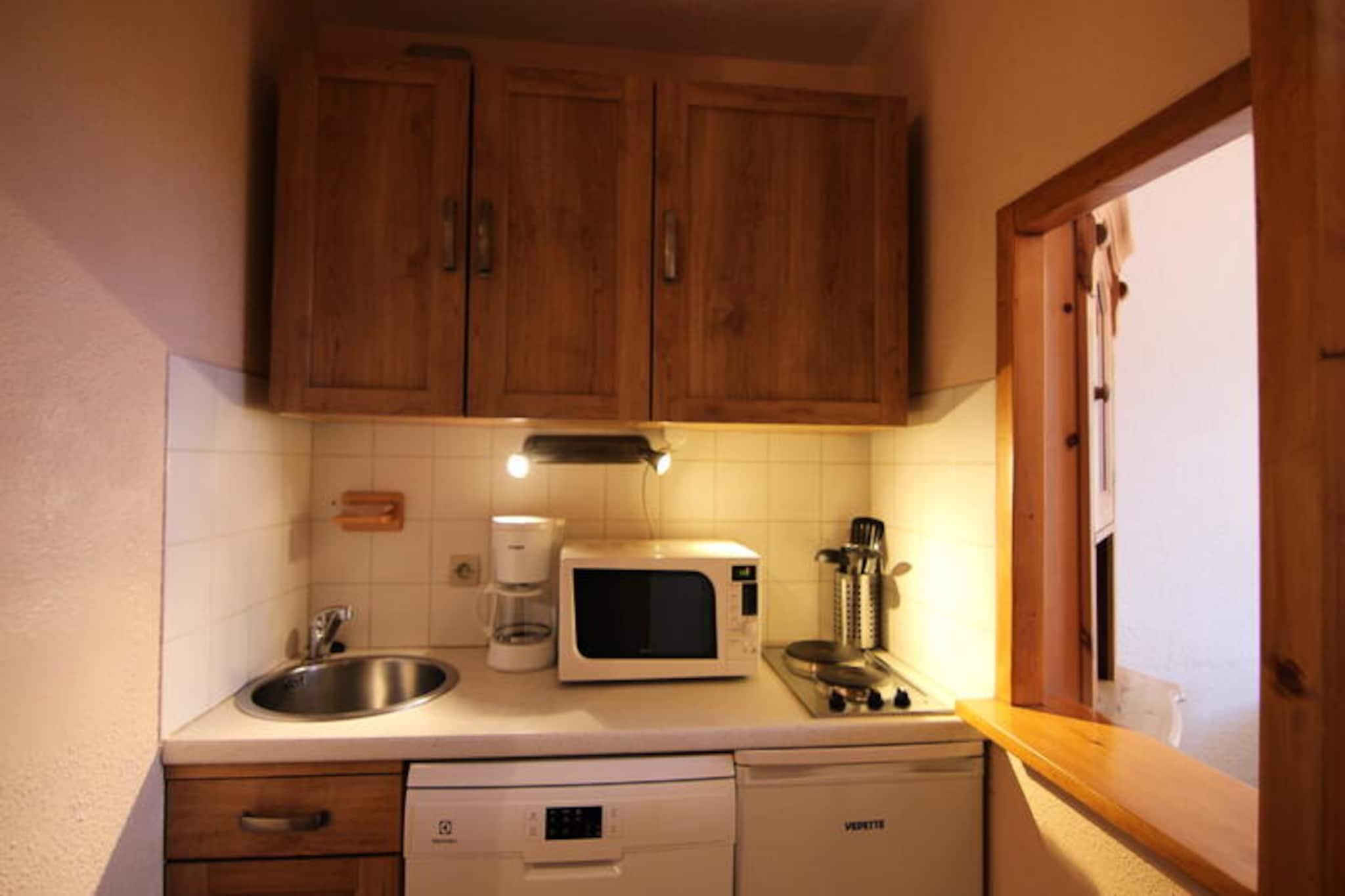 Ved indgangen til det pulserende Arolles-distrikt tilbyder denne hyggelige toværelseslejlighed det perfekte alpine tilflugtssted for op til fire gæster. Med sin sydvendte balkon kan du nyde solens varme, mens du nyder udsigten over det omkringliggende bjerglandskab. Uanset om du er her for et vinterskieventyr eller en sommerferie, er denne bolig ideelt placeret til at få mest muligt ud af din tid i Alperne. \n\nLejligheden har et veludstyret tekøkken med en kombineret mikrobølgeovn/grill, køleskab, elektrisk kogeplade og opvaskemaskine, hvilket gør det nemt at tilberede måltider efter en dag med udforskning. Stuen tilbyder et indbydende sted at slappe af, komplet med et tv, spiseplads og en komfortabel sofa. Sovepladserne omfatter et rummeligt soveværelse med en stor dobbeltseng og en hyggelig kabine med køjesenge, adskilt af en skydedør for ekstra privatliv. Badeværelset har badekar og håndvask, med et separat toilet for nemheds skyld. \n\nDenne ejendom ligger kun 30 meter fra pisterne og er en drøm for skientusiaster. Den nærliggende Skiset-butik i Altineige-residensen, kun 100 meter væk, sikrer, at du er fuldt udstyret til dine alpine eventyr. Caron Sportscenter og resortets indkøbscenter ligger også inden for rækkevidde og tilbyder en række aktiviteter og faciliteter, der vil forbedre dit ophold. \n\nUanset om du er tiltrukket af spændingen ved pisterne, charmen i Arolles-distriktet eller bekvemmeligheden ved nærliggende faciliteter, er denne lejlighed din indgang til en uforglemmelig bjergferie. Lad Joker-residensen være dit hjem væk fra hjemmet i hjertet af de franske alper.