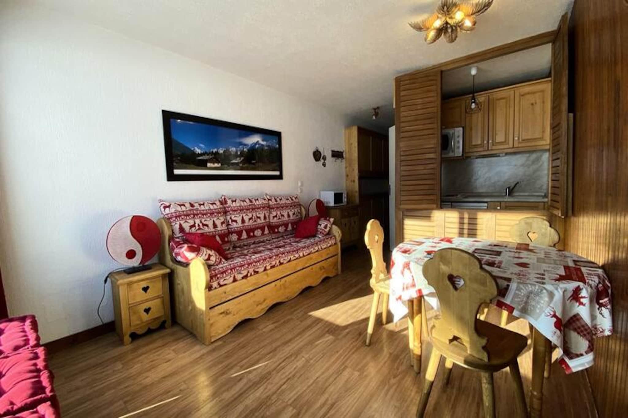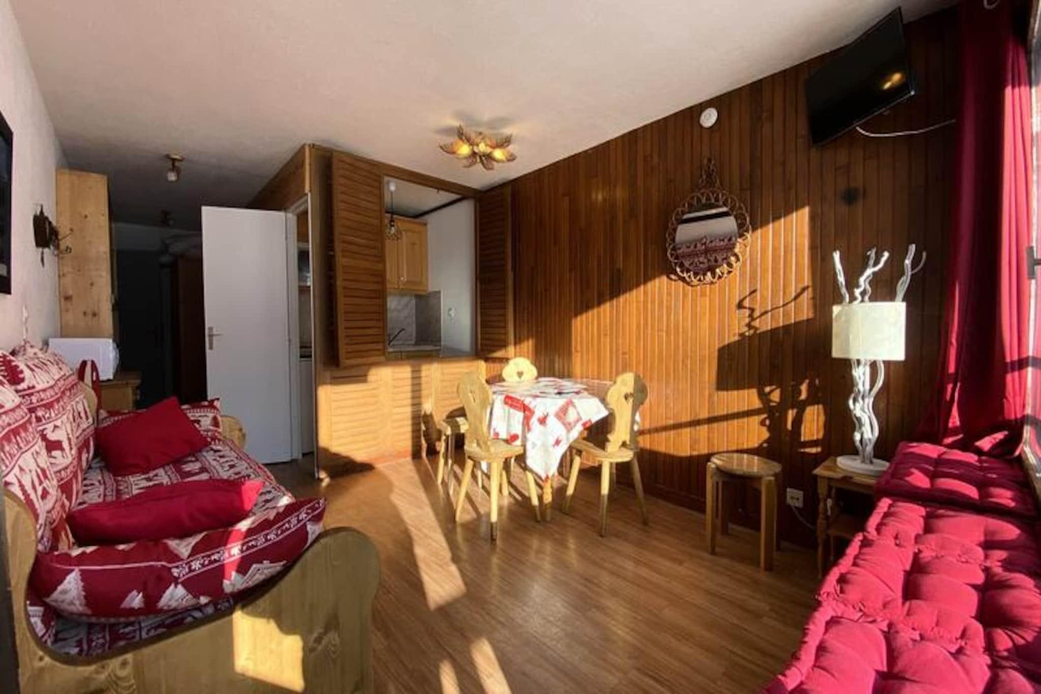 Højt over de livlige gader i Val Thorens tilbyder LE ROC DE PECLET-residensen et roligt alpint tilflugtssted med direkte adgang til pisterne. Forestil dig at vågne op til den friske bjergluft og træde ud på de snedækkede stier kun få øjeblikke fra din dør. Dette charmerende studio, der ligger på første sal, inviterer dig til at opleve roen i de franske alper, samtidig med at det er bekvemt tæt på Péclet-indkøbscentret, hvor du kan finde alle dine fornødenheder og afterski-oplevelser. Dets sydøstlige orientering sikrer masser af naturligt lys, hvilket skaber en varm og indbydende atmosfære hele dagen. \n\nStudioet er designet til op til fire gæster og har en praktisk indretning med køjesenge i entréen og en udtrækssovesofa i stuen. Det kompakte, men veludstyrede køkken har ovn, køleskab, opvaskemaskine og komfur, hvilket gør det nemt at tilberede solide måltider efter en dag på pisterne. Badeværelset huser både toilet og bruser, hvilket sikrer bekvemmelighed og funktionalitet. Der er omhyggeligt anbragt skibokse ved indgangen til residensen, så du nemt kan opbevare dit udstyr. \n\nResidensens beliggenhed er ideel for skientusiaster og tilbyder ubesværet adgang til de berømte pister i Val Thorens. Udover skiløb kan området prale af en betagende udsigt, livlige afterski-muligheder og et udvalg af butikker og restauranter inden for gåafstand. Uanset om du udforsker de nærliggende stier eller forkæler dig selv med lokal mad, vil charmen i denne alpine landsby helt sikkert betage dig. \n\nLE ROC DE PECLET er perfekt til par eller små familier, der søger en hyggelig og praktisk base. Det kombinerer glæderne ved bjerglivet med bekvemmeligheden ved en førsteklasses beliggenhed. Lad Alpernes skønhed inspirere dit næste eventyr i disse fredelige, men livlige omgivelser.