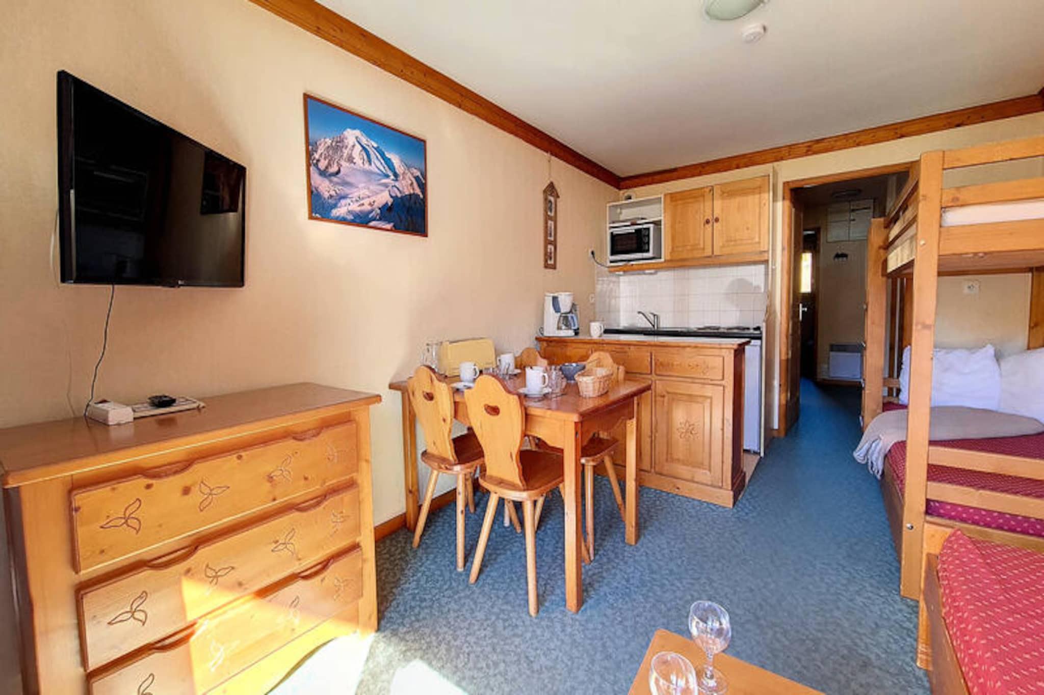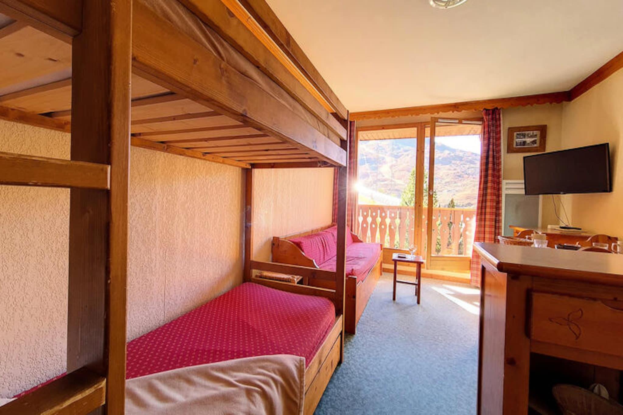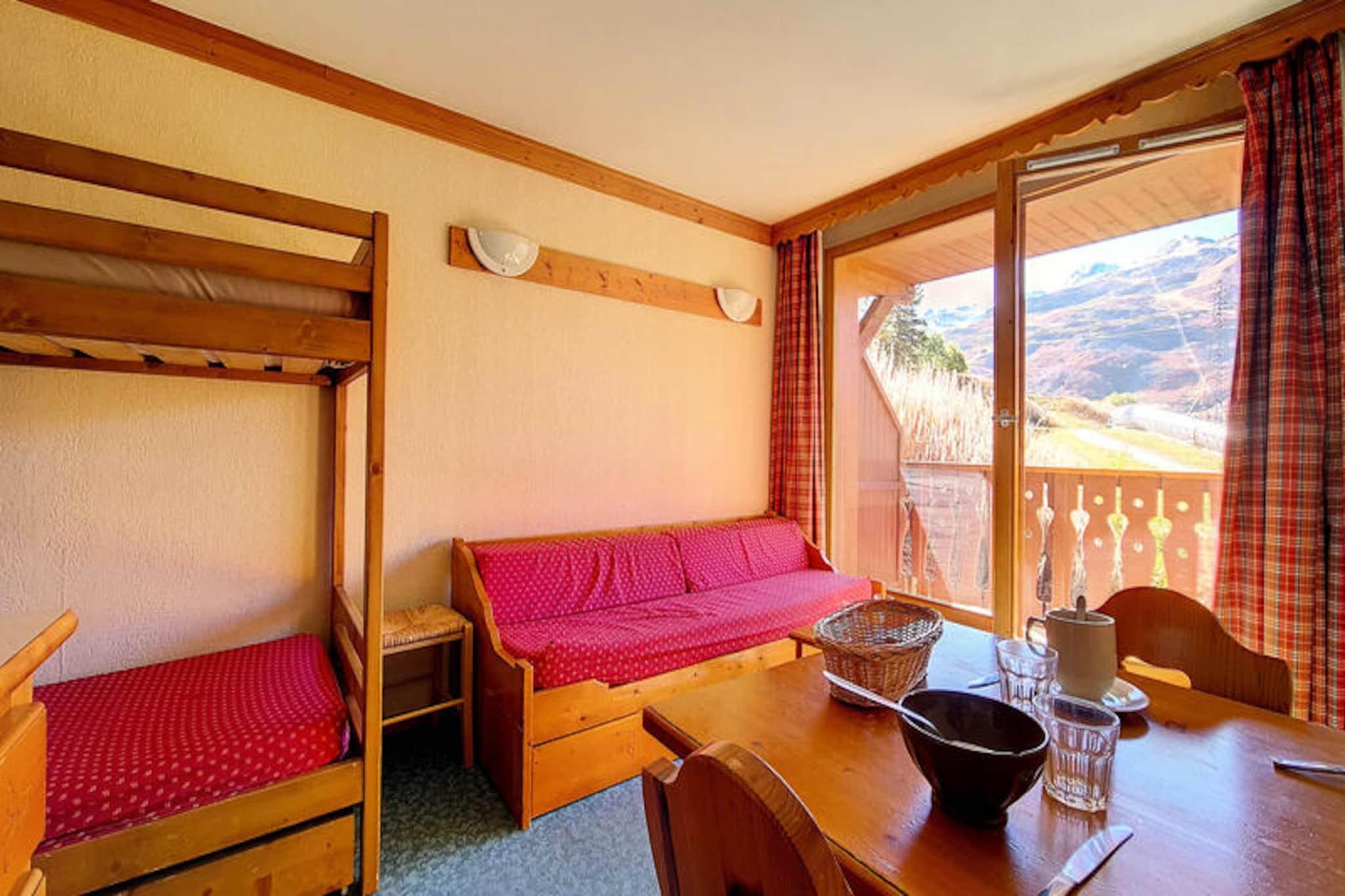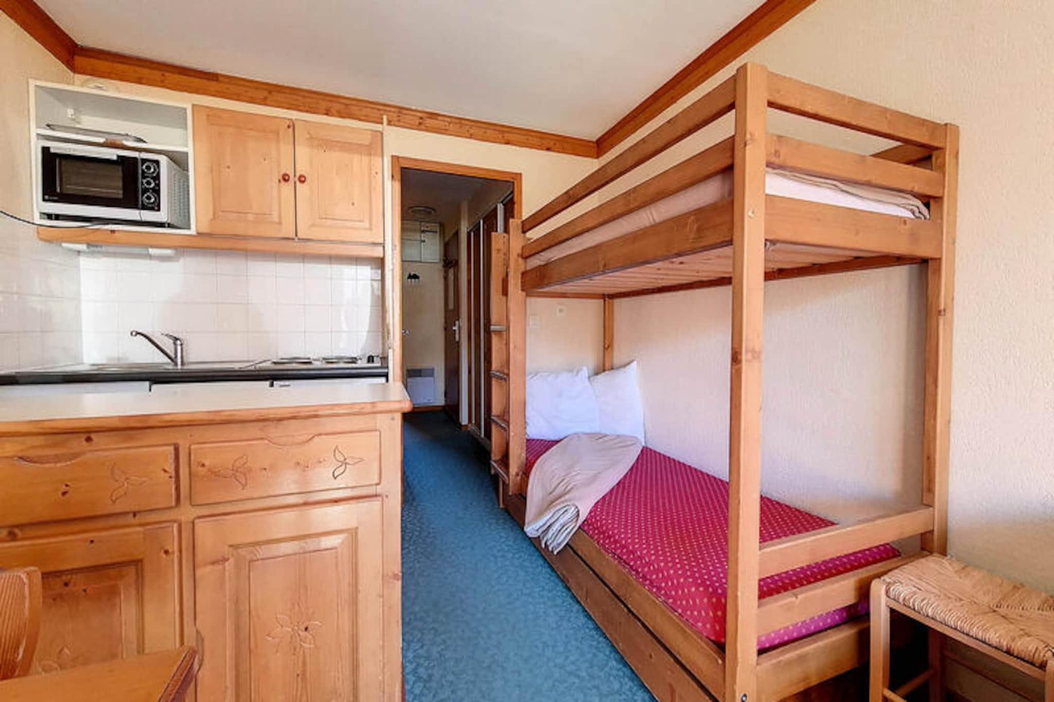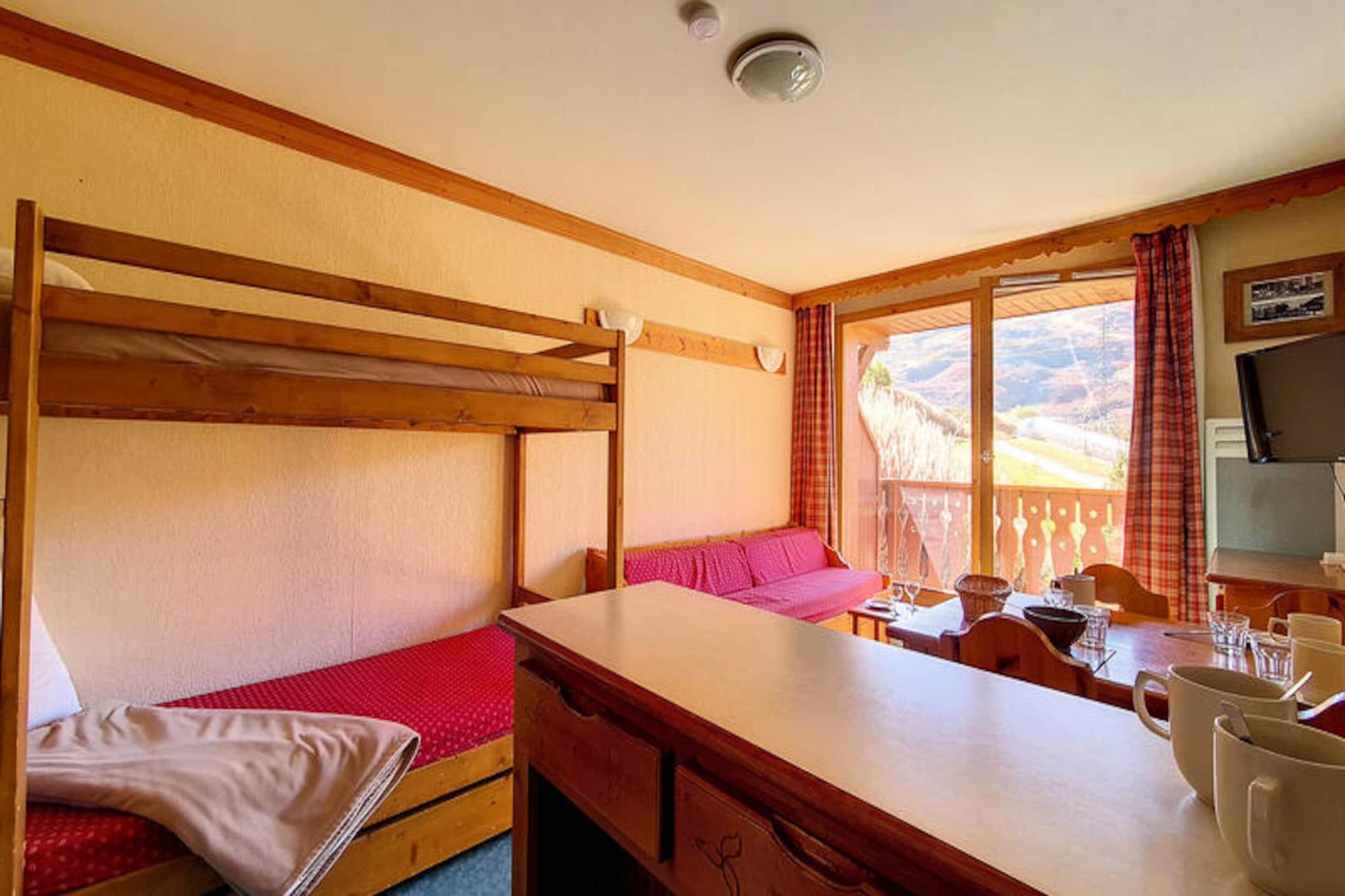 Højt over de glitrende skråninger i Les Menuires inviterer denne hyggelige alpine lejlighed dig til at opleve magien i de franske alper i Bruyères-distriktet. Med skilifter og pister kun få skridt væk begynder din vinterferie i det øjeblik, du træder udenfor. Nyd varmen fra den sydvestvendte balkon, mens solen går ned over de snedækkede tinder og skaber en rolig kulisse for dit bjergophold. Uanset om du er her for at cykle gennem puddersne eller bare slappe af, tilbyder denne charmerende bolig den perfekte base for dine eventyr. \n\nIndenfor er lejligheden omhyggeligt designet til at rumme op til fire gæster. Stuen har en enkelt sovesofa og en udtræksseng, mens soveværelset har to komfortable enkeltsenge. Et fuldt udstyret køkken med elektrisk kogeplade, ovn, opvaskemaskine og essentielle apparater gør det nemt at tilberede solide måltider efter en dag på pisterne. Badeværelset har et badekar til afslappende bad, og et separat toilet øger bekvemmeligheden. Med tæppebelagte gulve og en varm atmosfære føles rummet indbydende og hjemligt. \n\nBruyères-distriktet er fyldt med faciliteter, der vil forbedre dit ophold. Fra restauranter og butikker til en biograf, vandland, wellnesscenter og skiskole, er alt hvad du behøver inden for gåafstand. Familier vil sætte pris på kælkebanen og legepladsen, mens eventyrere kan udforske de nærliggende stier og pister. Adgang til boligen er nem, med parkering til rådighed ved Balcons des Bruyères. \n\nUanset om du søger spændende skidage eller rolige aftener under den alpine himmel, kombinerer denne lejlighed komfort, bekvemmelighed og betagende natur for en uforglemmelig ferie i Les Menuires.