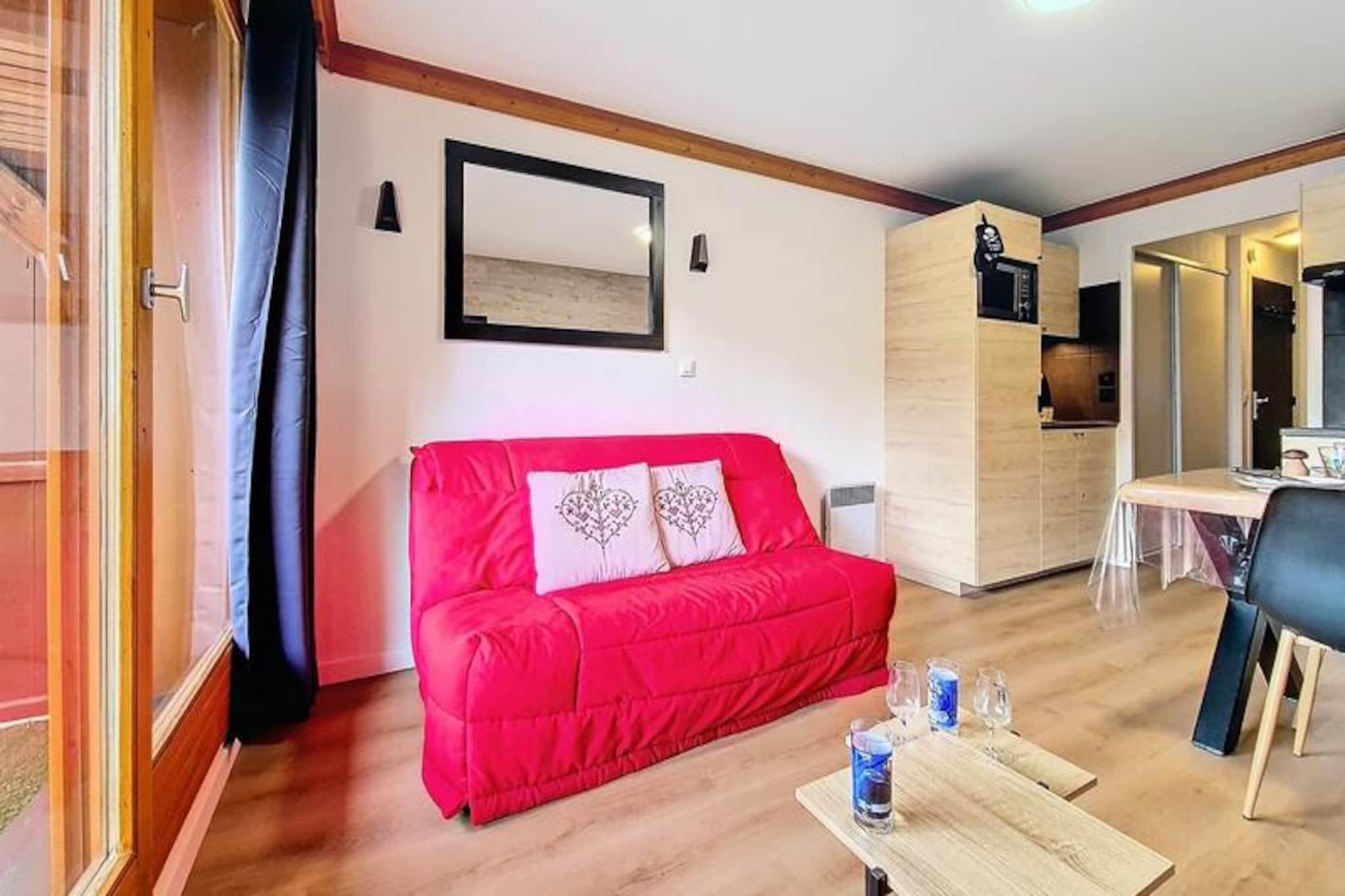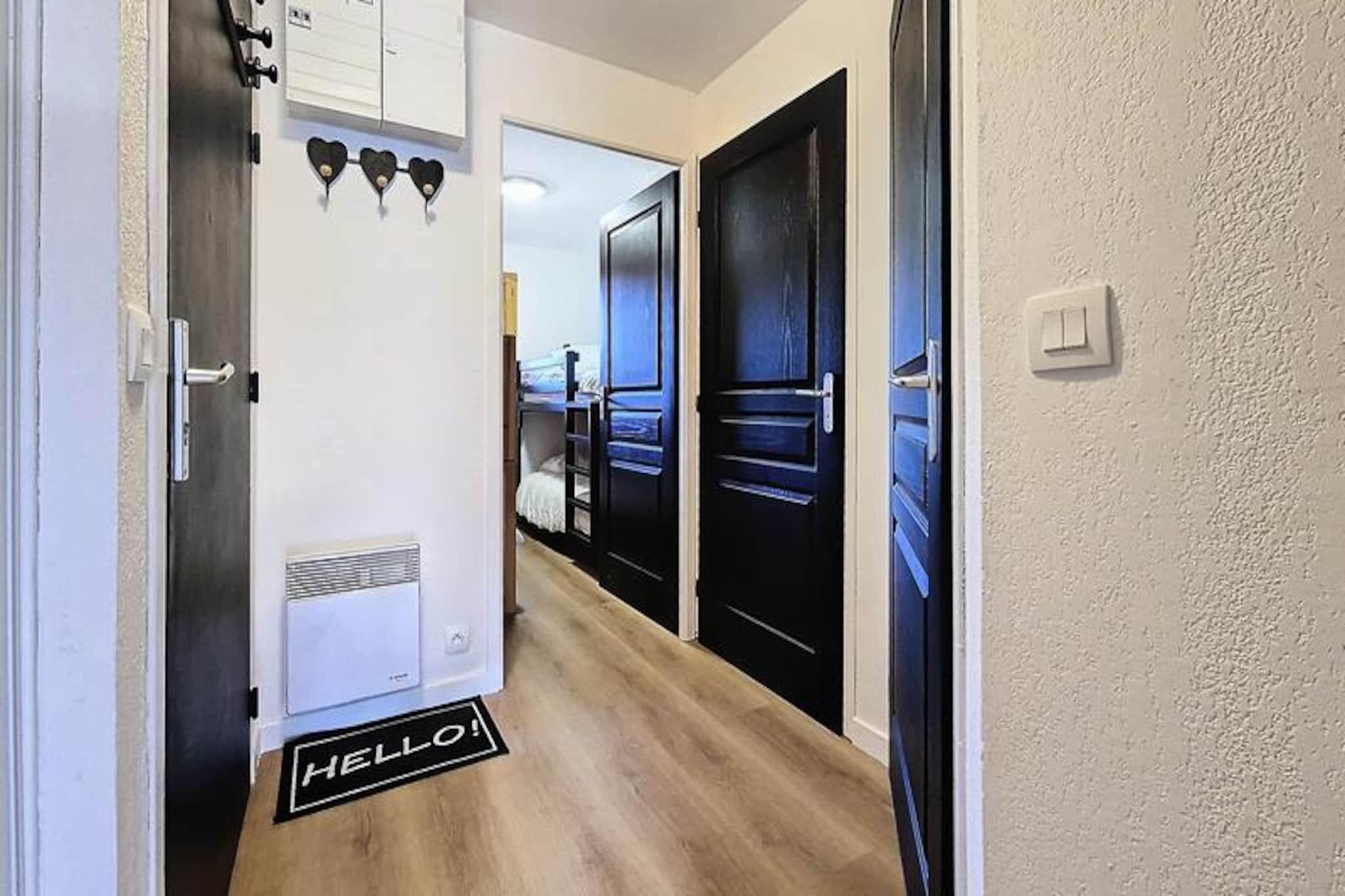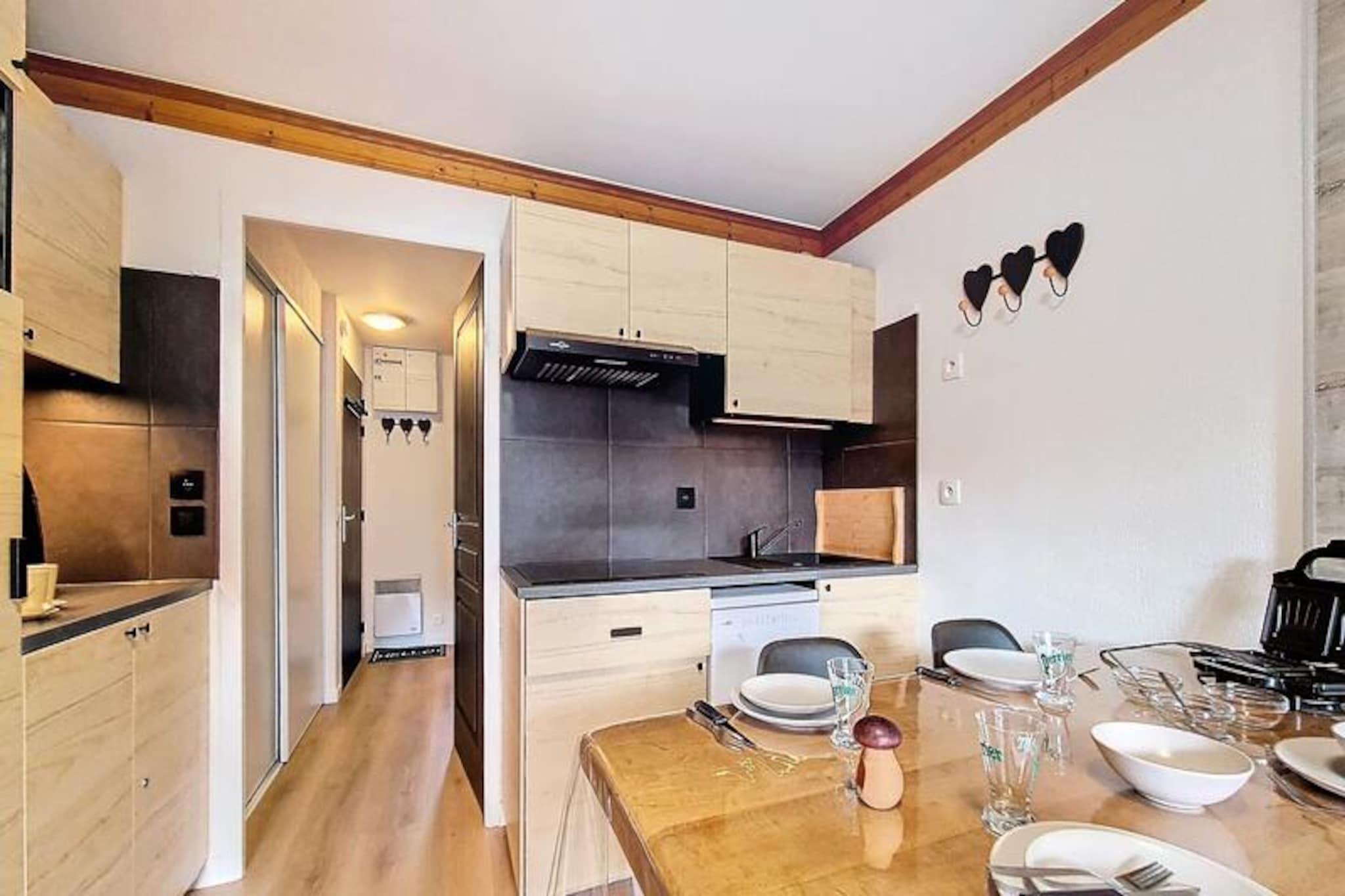 Højt over det travle Bruyères-distrikt inviterer denne charmerende 2-værelses lejlighed dig til at opleve magien i de franske alper med uovertruffen bekvemmelighed og komfort. Beliggende på 8. sal tilbyder den sydvestvendte balkon en betagende udsigt over pisterne, hvor sollyset danser hen over de sneklædte tinder. Uanset om du er her for spændende skieventyr eller rolige bjergture, er denne bolig din port til uforglemmelige øjeblikke i Les Menuires. \n\nIndenfor udstråler lejligheden varme og praktisk anvendelighed. Den har plads til op til fire gæster og har en hyggelig stue med en dobbelt sovesofa og et soveværelse med to sæt køjesenge, perfekt til familier eller små grupper. Køkkenet er fuldt udstyret med moderne apparater, herunder opvaskemaskine, induktionskogeplade og Senseo-kaffemaskine, så du kan tilberede solide måltider efter en dag med udforskning. Parketgulv tilføjer et strejf af elegance, mens faciliteter som Wi-Fi, USB-opladeporte og rulleskodder forbedrer dit ophold med moderne bekvemmelighed. \n\nTræd udenfor og oplev det pulserende Bruyères-distrikt, hvor alt hvad du behøver er lige ved hånden. Fra restauranter og butikker til et vandland, wellnesscenter og biograf summer området af aktivitet. Familier vil elske kælkebanen, skiskolen og legepladsen, mens eventyrere nemt kan komme til pisterne og lifterne kun få skridt væk. Om sommeren forvandles distriktet til et paradis for vandrere og naturentusiaster med stier, der fører til fantastiske alpine udsigter. \n\nUanset om du søger adrenalinpumpende dage på pisterne eller fredelige aftener, hvor du nyder den alpine atmosfære, tilbyder denne lejlighed den perfekte blanding af komfort, beliggenhed og charme. Gør dine bjergdrømme til virkelighed i hjertet af Les Menuires.