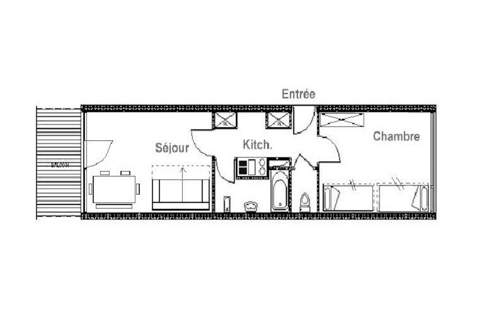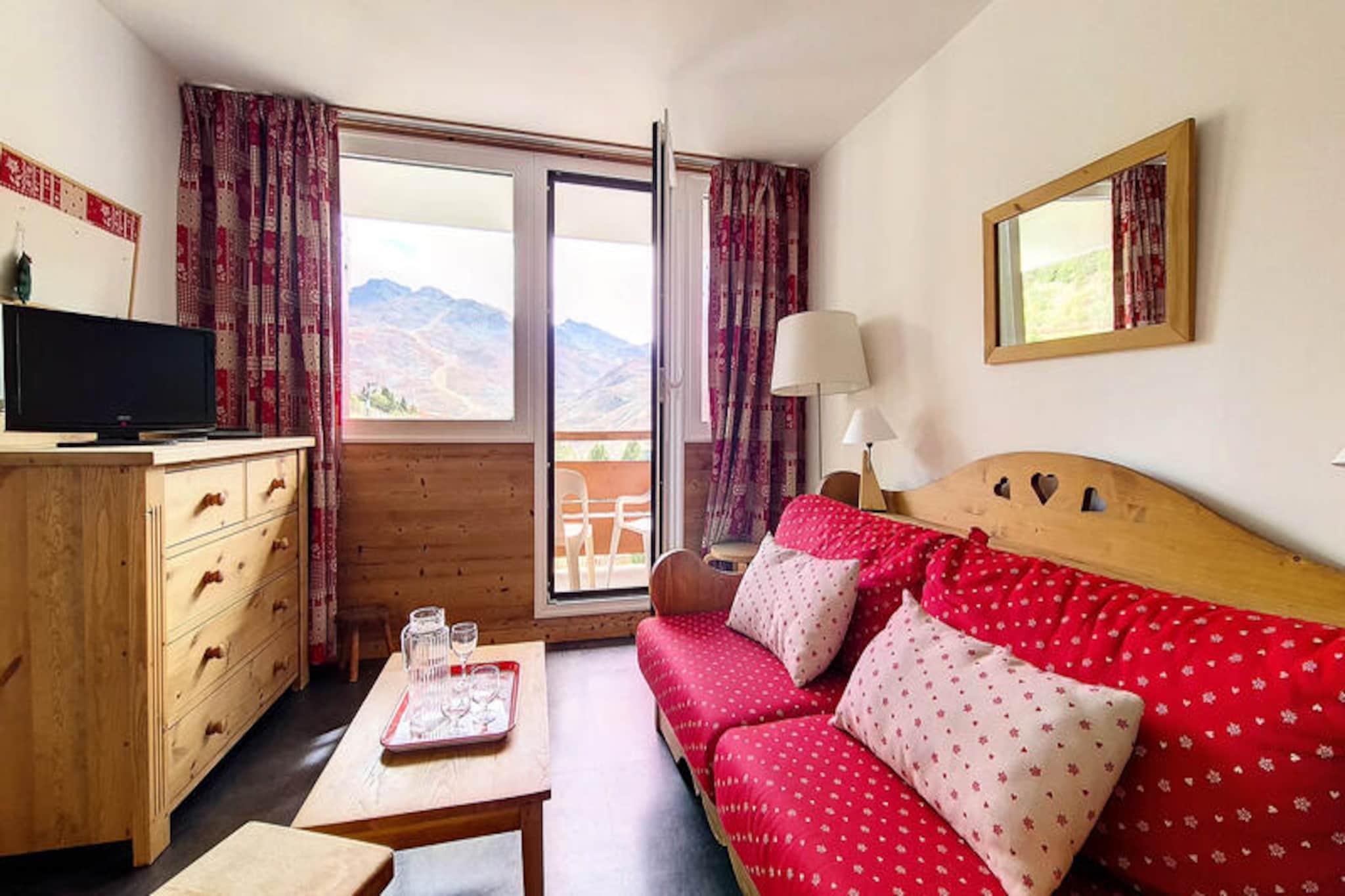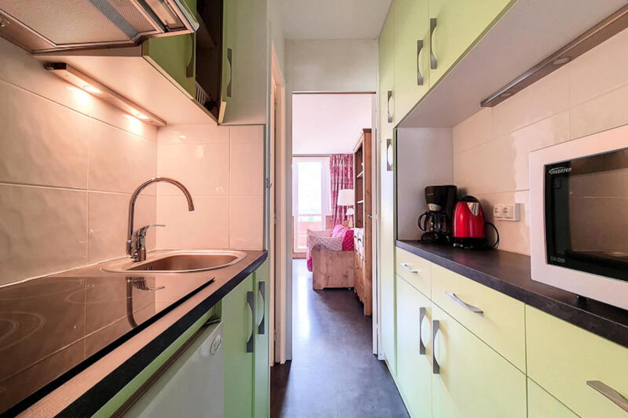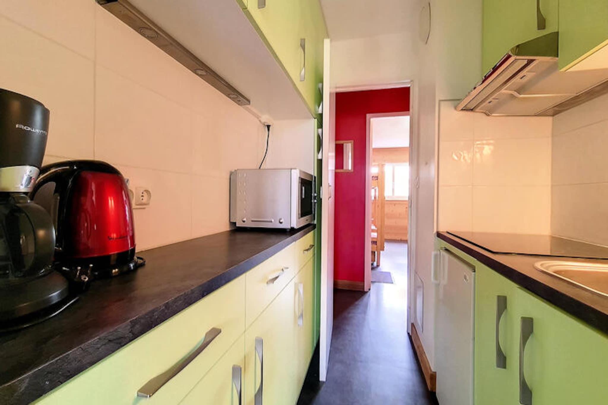 I hjertet af det pulserende feriested tilbyder denne smukt renoverede lejlighed på femte sal i Burons-bygningen et hyggeligt alpint tilflugtssted med en sydvendt balkon med udsigt over pisterne. Kun 50 meter fra La Croisette-indkøbscentret og en kort 100 meter gåtur til de nærmeste skiløjper, er denne ejendom perfekt placeret til både bekvemmelighed og eventyr. Familier vil sætte pris på nærheden til børnepasning og snehave, der ligger lige for foden af ??bygningen, hvilket gør det til et ideelt valg for en problemfri ferieoplevelse. Med et busstoppested kun 50 meter væk og stationen, der kan nås på to minutter med bus, er det nemt at komme rundt. \n\nLejligheden er 36 m² stor og har plads til op til seks gæster, hvilket tilbyder en varm og funktionel indretning. Stuen har en komfortabel sovesofa (140x200 cm) og et tv, perfekt til afslappende aftener efter en dag på pisterne. Soveværelset er udstyret med to sæt køjesenge, ideelt til familier eller vennegrupper. Badeværelset har et badekar til et beroligende bad, mens det separate toilet øger bekvemmeligheden. Køkkenet er fuldt udstyret med moderne apparater, herunder keramiske kogeplader, køleskab, multifunktionsovn, opvaskemaskine og meget mere, hvilket sikrer, at du har alt, hvad du behøver til hjemmelavede måltider. Linoleumsgulv overalt tilføjer et praktisk touch, og lejligheden er omhyggeligt udstyret med tæpper for ekstra komfort. \n\nGæsterne kan nyde de bekvemme skibokse i kælderen og elektrisk opvarmning for at holde rummet hyggeligt i vintermånederne. Der er betalt Wi-Fi-adgang, afhængigt af netværksdækning, så du kan holde dig forbundet under dit ophold. Bemærk venligst, at køjesenge ikke er egnede til børn under seks år, og ejendommen har en politik om ikke at ryge og ikke at medbringe kæledyr. \n\nUanset om du er her for at stå på ski, udforske det charmerende feriested eller blot slappe af og nyde den fantastiske udsigt over bjergene, tilbyder denne lejlighed den perfekte base for din alpine ferie. Med sin førsteklasses beliggenhed og gennemtænkte faciliteter lover den et mindeværdigt ophold for familier, par eller grupper, der søger magien i de franske alper.