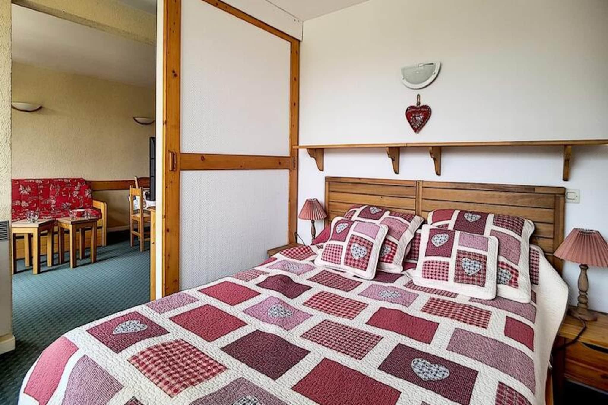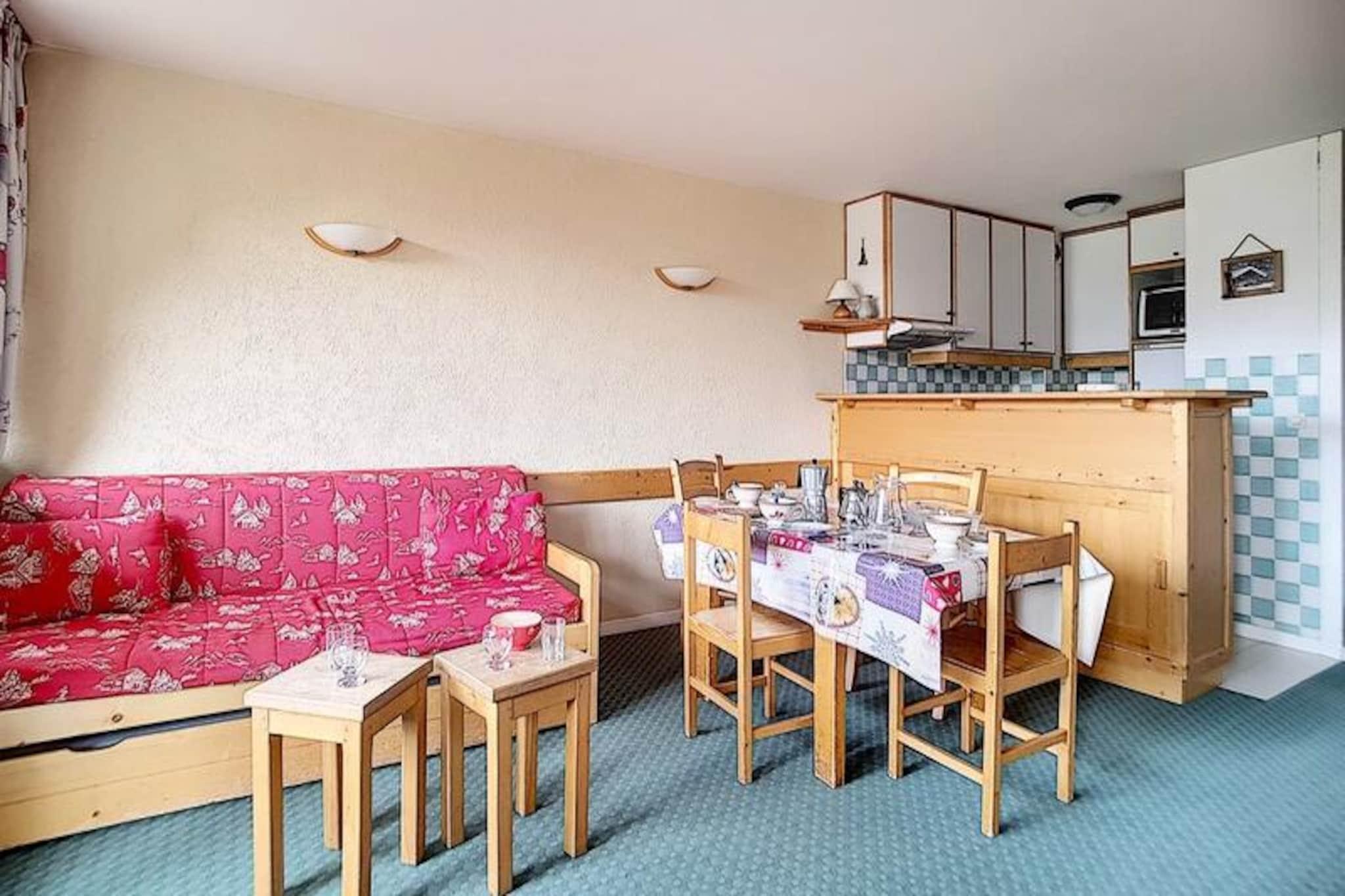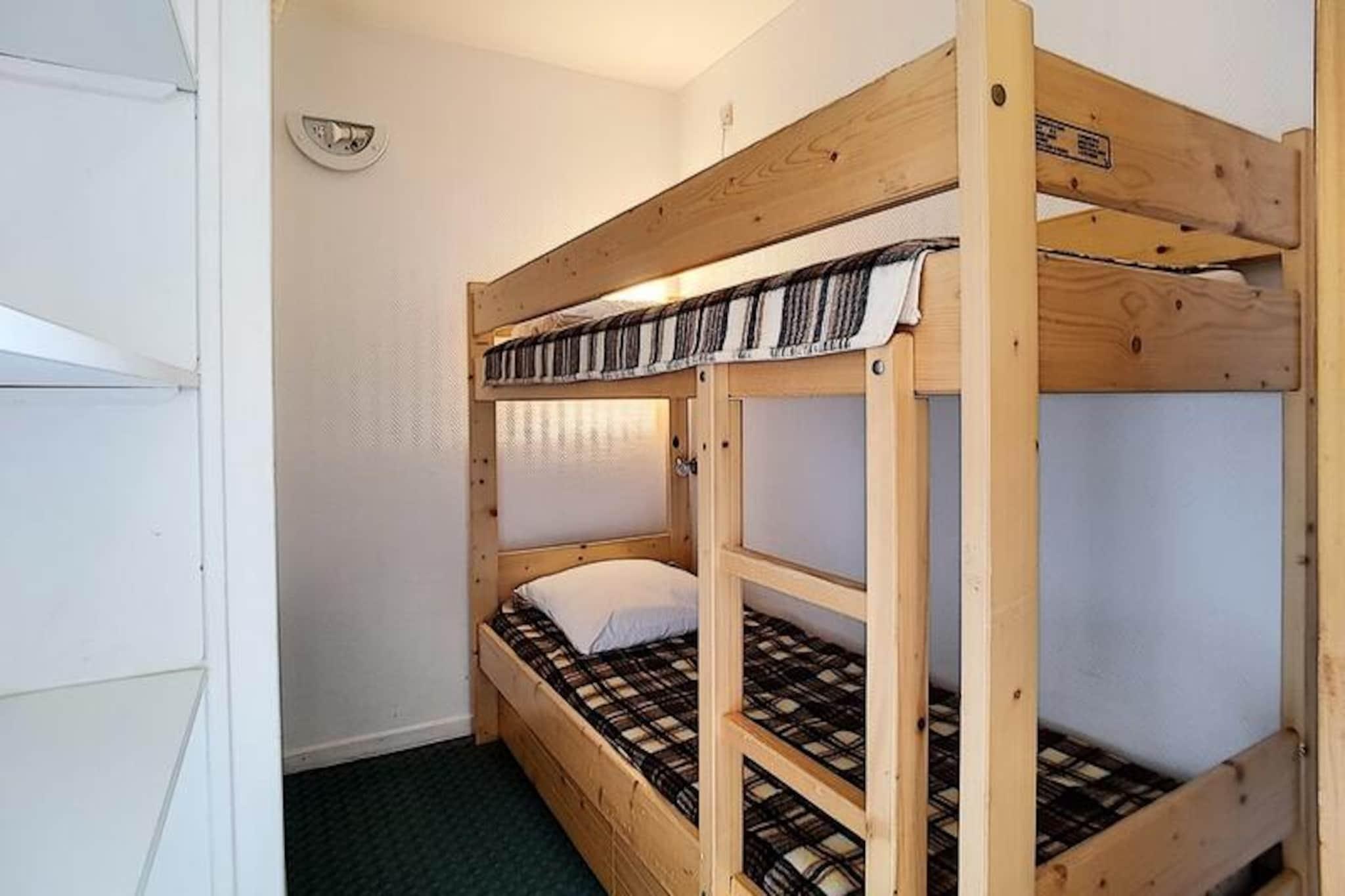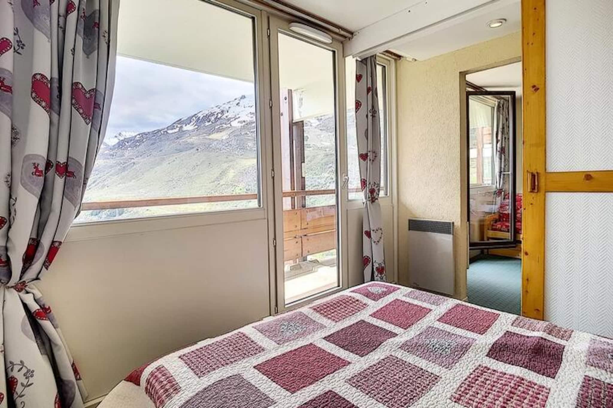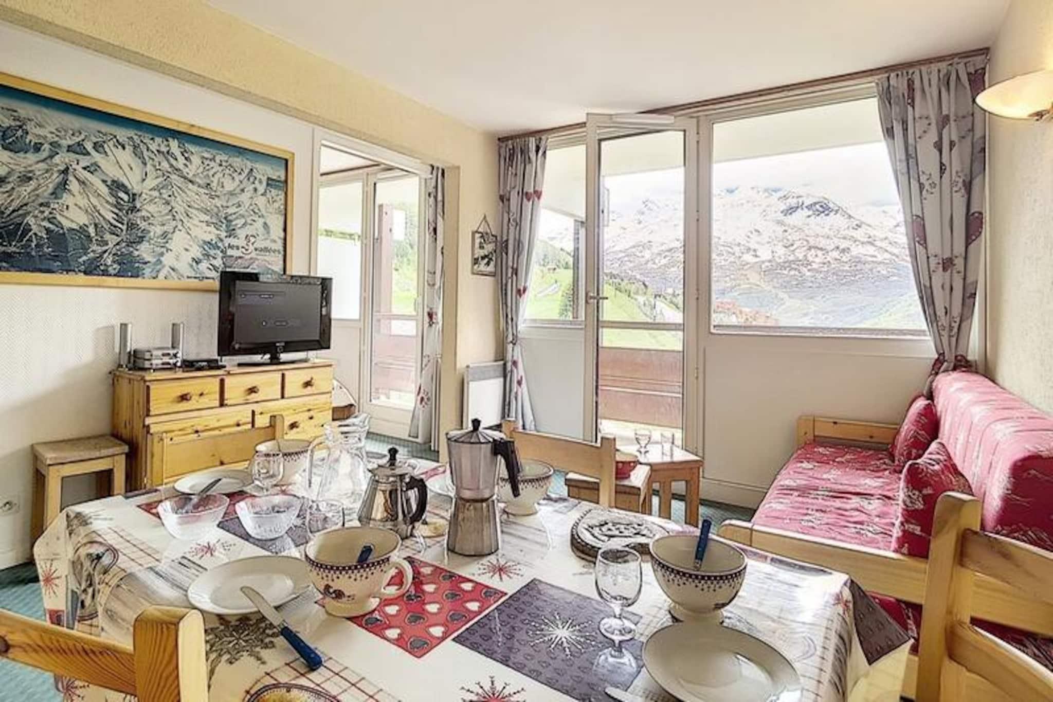 Højt over den maleriske dal Les Menuires tilbyder denne indbydende lejlighed et hyggeligt alpint tilflugtssted med betagende udsigt og nem adgang til pisterne. Fra det øjeblik du træder ud på den sydvendte balkon, sætter den friske bjergluft og de fantastiske udsigter tonen for en uforglemmelig ferie. Uanset om du er her for spændingen ved skiløb eller roen i de franske alper, er denne ejendom den perfekte base for at skabe varige minder. \n\nLejligheden ligger på 6. sal i Burons-bygningen og har komfortabel plads til op til seks gæster. Den gennemtænkte planløsning omfatter en stue med en enkelt sovesofa og en udtræksseng, et soveværelse med en dobbeltseng og en alkove med to enkeltkøjesenge. Køkkenet er fuldt udstyret med moderne apparater, herunder opvaskemaskine, mikrobølgeovn og kaffemaskine, hvilket sikrer, at du har alt, hvad du behøver for at tilberede solide måltider efter en dag med eventyr. Lejligheden har også et separat toilet og brusebad for ekstra bekvemmelighed. \n\nPisterne ligger kun 100 meter væk, hvilket gør det nemt at starte din dag i sneen. Familier vil sætte pris på den nærliggende børnepasningsordning og snehave, der ligger lige for foden af ??bygningen. Butiksarkaden La Croisette ligger kun 50 meter væk og tilbyder et udvalg af butikker og spisesteder. Med et busstoppested kun få skridt fra boligen og busstationen blot to minutters kørsel væk, er det nemt at udforske området. \n\nUanset om du søger spændende udendørsaktiviteter eller en fredelig flugt, kombinerer denne lejlighed komfort, bekvemmelighed og fantastiske alpine omgivelser. Oplev charmen ved Les Menuires og gør dette til dit hjem væk fra hjemmet i hjertet af de franske alper.