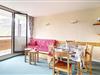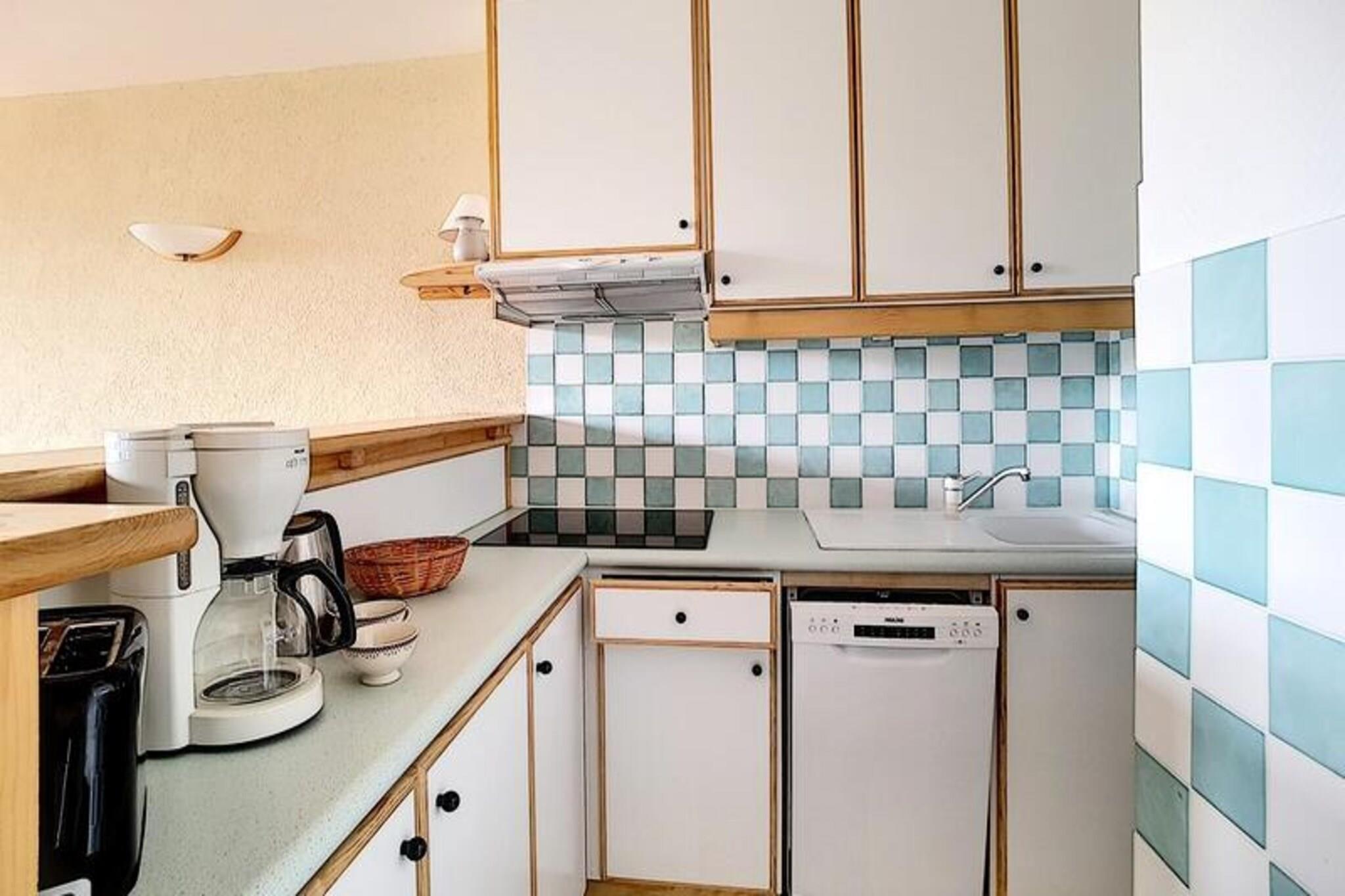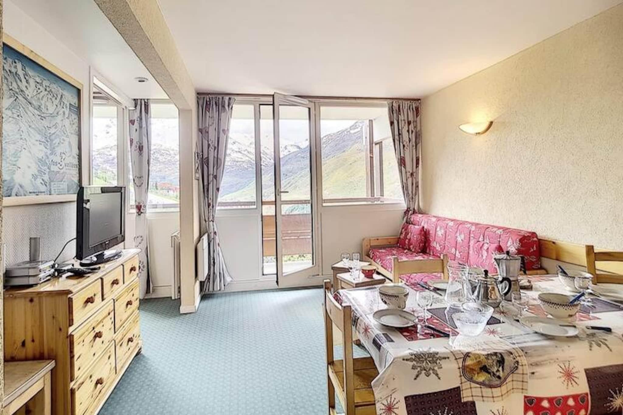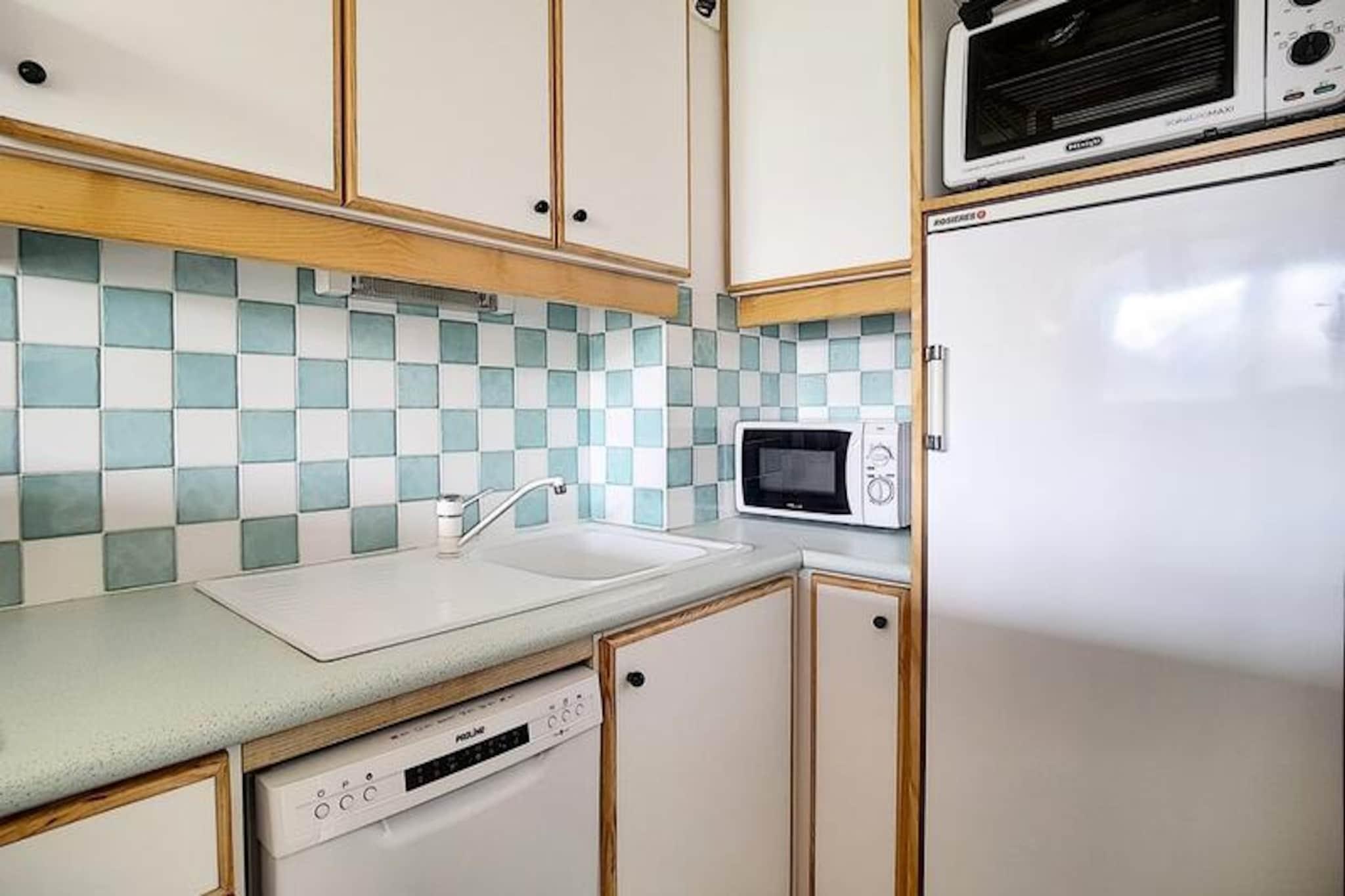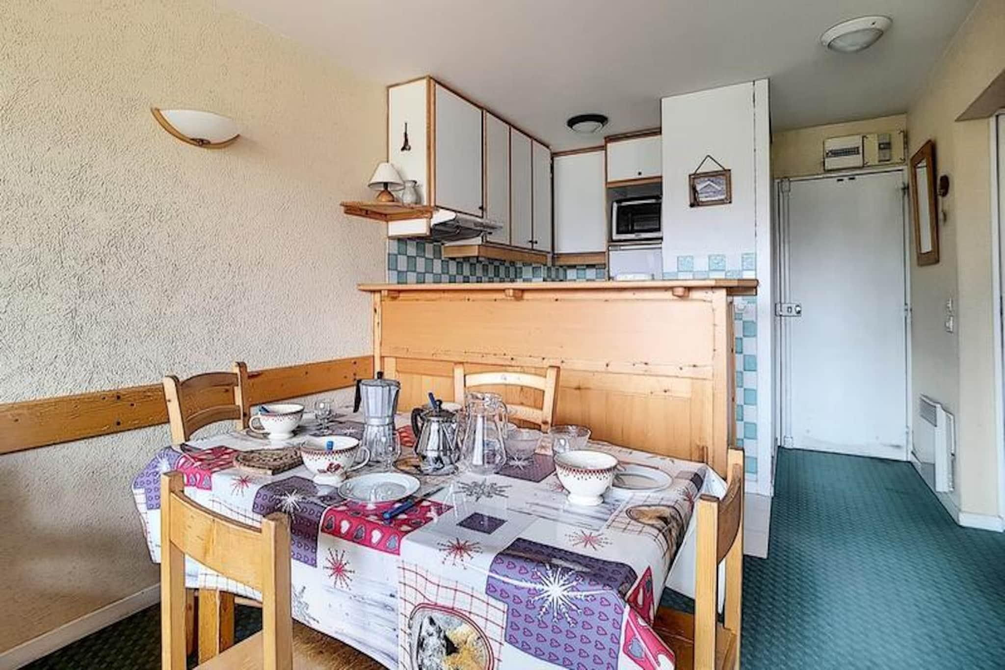Højt over den maleriske dal Les Menuires tilbyder denne indbydende lejlighed et hyggeligt alpint tilflugtssted med betagende udsigt og nem adgang til pisterne. Fra det øjeblik du træder ud på den sydvendte balkon, sætter den friske bjergluft og de fantastiske udsigter tonen for en uforglemmelig ferie. Uanset om du er her for spændingen ved skiløb eller roen i de franske alper, er denne ejendom den perfekte base for at skabe varige minder. \n\nLejligheden ligger på 6. sal i Burons-bygningen og har komfortabel plads til op til seks gæster. Den gennemtænkte planløsning omfatter en stue med en enkelt sovesofa og en udtræksseng, et soveværelse med en dobbeltseng og en alkove med to enkeltkøjesenge. Køkkenet er fuldt udstyret med moderne apparater, herunder opvaskemaskine, mikrobølgeovn og kaffemaskine, hvilket sikrer, at du har alt, hvad du behøver for at tilberede solide måltider efter en dag med eventyr. Lejligheden har også et separat toilet og brusebad for ekstra bekvemmelighed. \n\nPisterne ligger kun 100 meter væk, hvilket gør det nemt at starte din dag i sneen. Familier vil sætte pris på den nærliggende børnepasningsordning og snehave, der ligger lige for foden af ??bygningen. Butiksarkaden La Croisette ligger kun 50 meter væk og tilbyder et udvalg af butikker og spisesteder. Med et busstoppested kun få skridt fra boligen og busstationen blot to minutters kørsel væk, er det nemt at udforske området. \n\nUanset om du søger spændende udendørsaktiviteter eller en fredelig flugt, kombinerer denne lejlighed komfort, bekvemmelighed og fantastiske alpine omgivelser. Oplev charmen ved Les Menuires og gør dette til dit hjem væk fra hjemmet i hjertet af de franske alper.