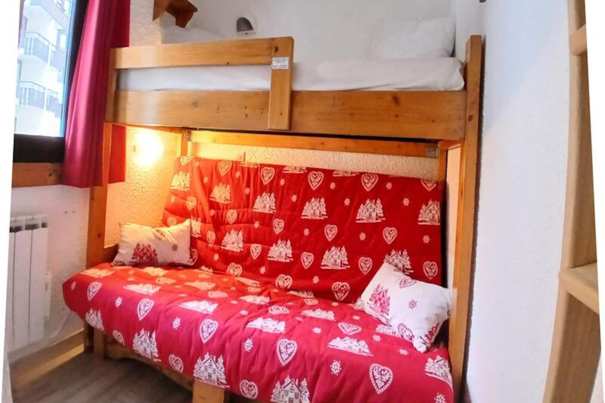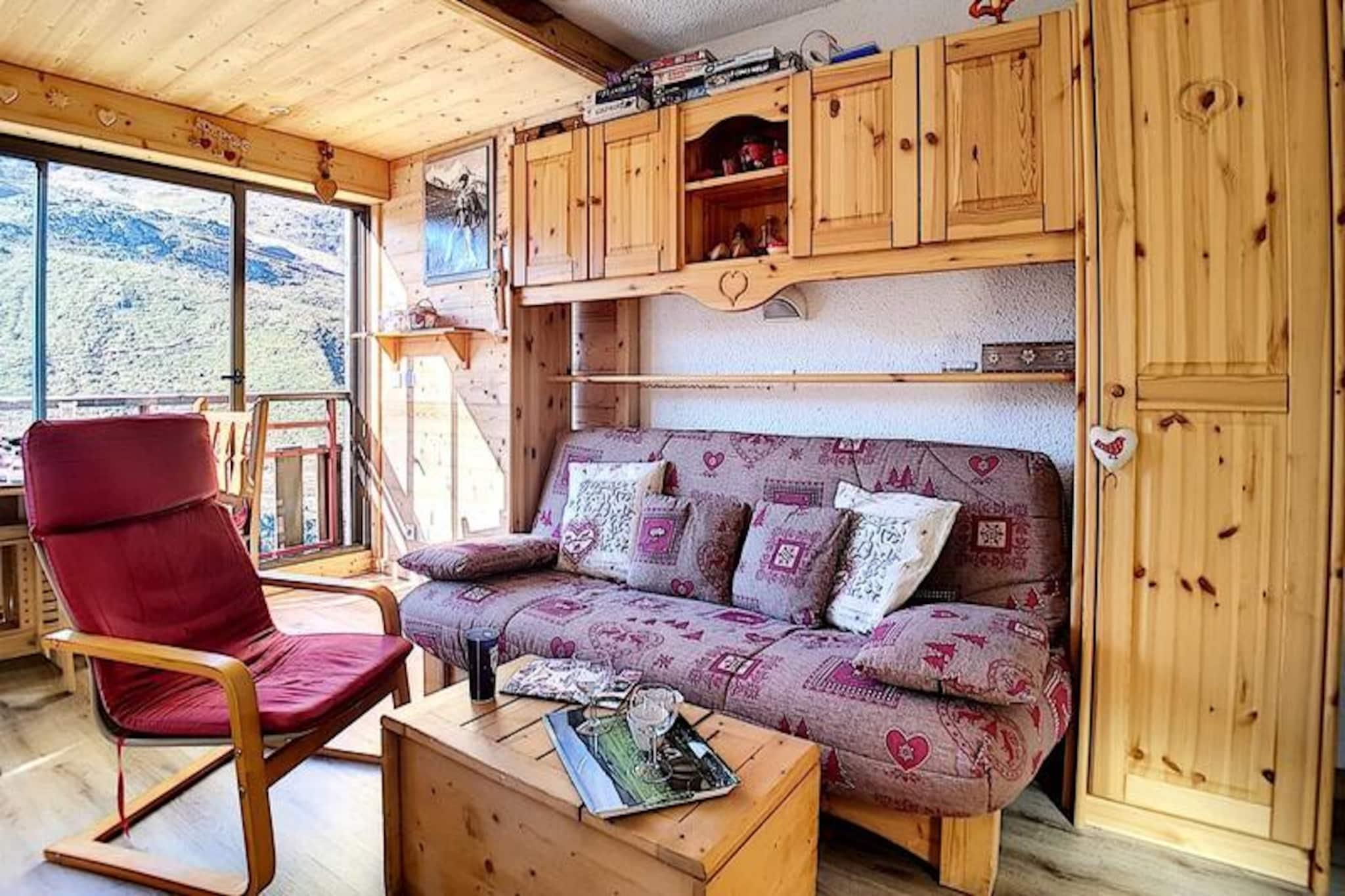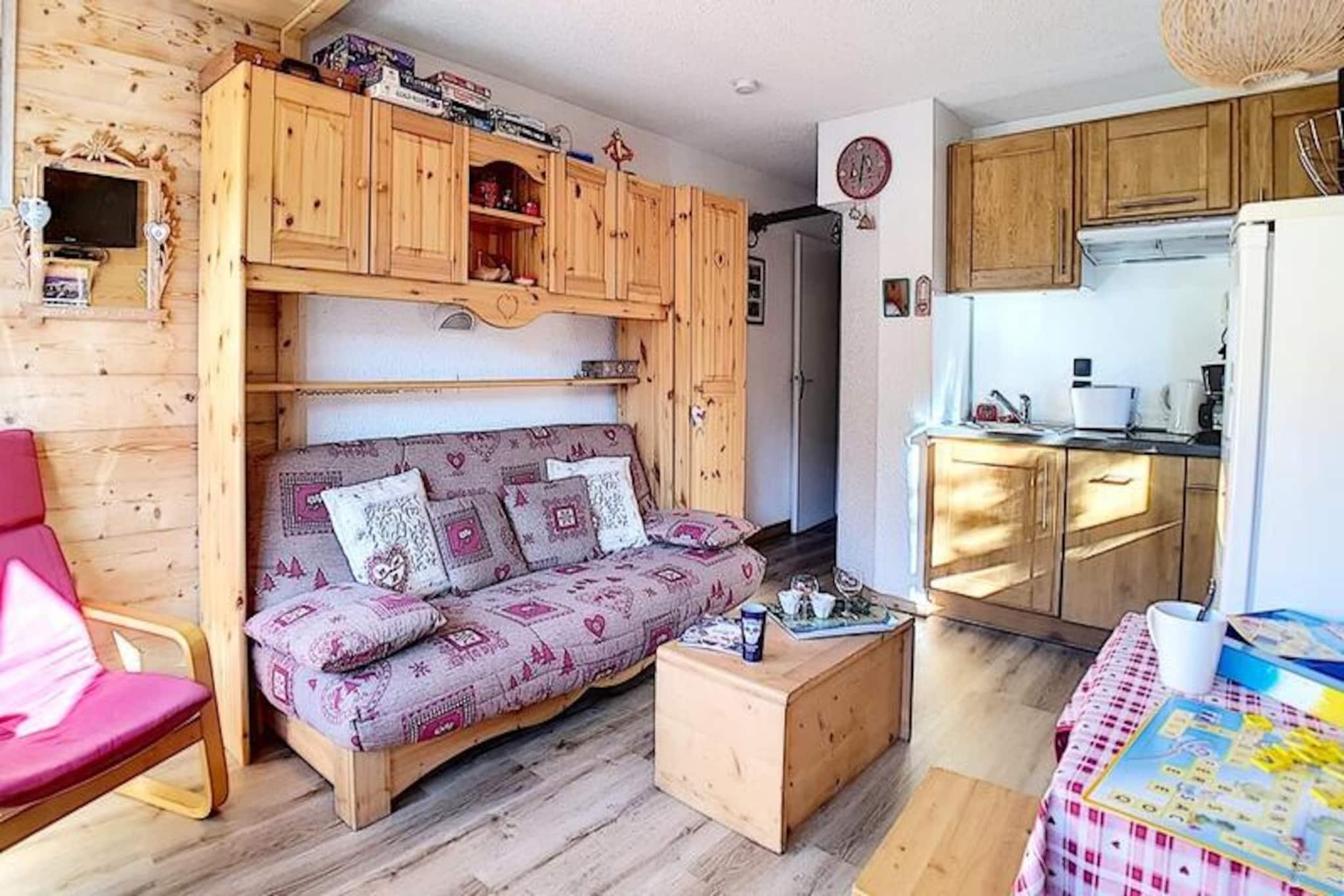 I hjertet af det charmerende Place des Bouquetins tilbyder dette hyggelige alpine tilflugtssted den perfekte ski-in/ski-out-oplevelse for dem, der søger en problemfri forbindelse til pisterne. Forestil dig at træde ud af din dør og glide direkte ud på de uberørte pister i Les Menuires, omgivet af de franske alpers betagende skønhed. Med sin varme atmosfære og gennemtænkte design er denne lejlighed et paradis for par eller små familier, der ønsker at fordybe sig i bjergenes magi. \n\nDenne nyrenoverede 2-værelses lejlighed er på 30 m² og er designet til komfortabelt at rumme op til fire gæster. Beliggende på 4. sal kan den prale af en vestvendt udsigt, så du kan nyde de gyldne nuancer af den nedgående sol. Stuen har en dobbelt sovesofa, et tv, en dvd-afspiller og en radio/cd-afspiller, hvilket skaber et hyggeligt rum at slappe af efter en dag med eventyr. Det lille soveværelse, adskilt af en dør, tilbyder en dobbeltseng til afslappende nætter. Køkkenet er fuldt udstyret med moderne apparater, herunder keramisk kogeplade, opvaskemaskine, elektrisk ovn, mikrobølgeovn og specialprodukter som crêpe-maskine, raclette-grill og fondue-sæt - perfekt til at forkæle dig selv med lokale kulinariske traditioner. Et badeværelse med badekar og vægmonteret hårtørrer samt et separat toilet bidrager til lejlighedens bekvemmelighed. \n\nSelve boligen tilbyder gratis Wi-Fi (afhængigt af netværksdækning) og har en elevator for nem adgang. Kun få skridt væk forbinder en gangbro dig med det livlige Bruyères-distrikt, hvor du finder et udvalg af restauranter, butikker, et vandland, wellnesscenter, biograf, skiskole og endda en kælkebane. For dem, der søger mere udforskning, ligger Croisette-distriktet kun 15 minutters gang væk via en naturskøn gåsti. \n\nUanset om du er her for spændingen ved skiløb eller roen ved alpint liv, tilbyder denne lejlighed en ideel base for at skabe uforglemmelige minder i hjertet af Les Trois Vallées.