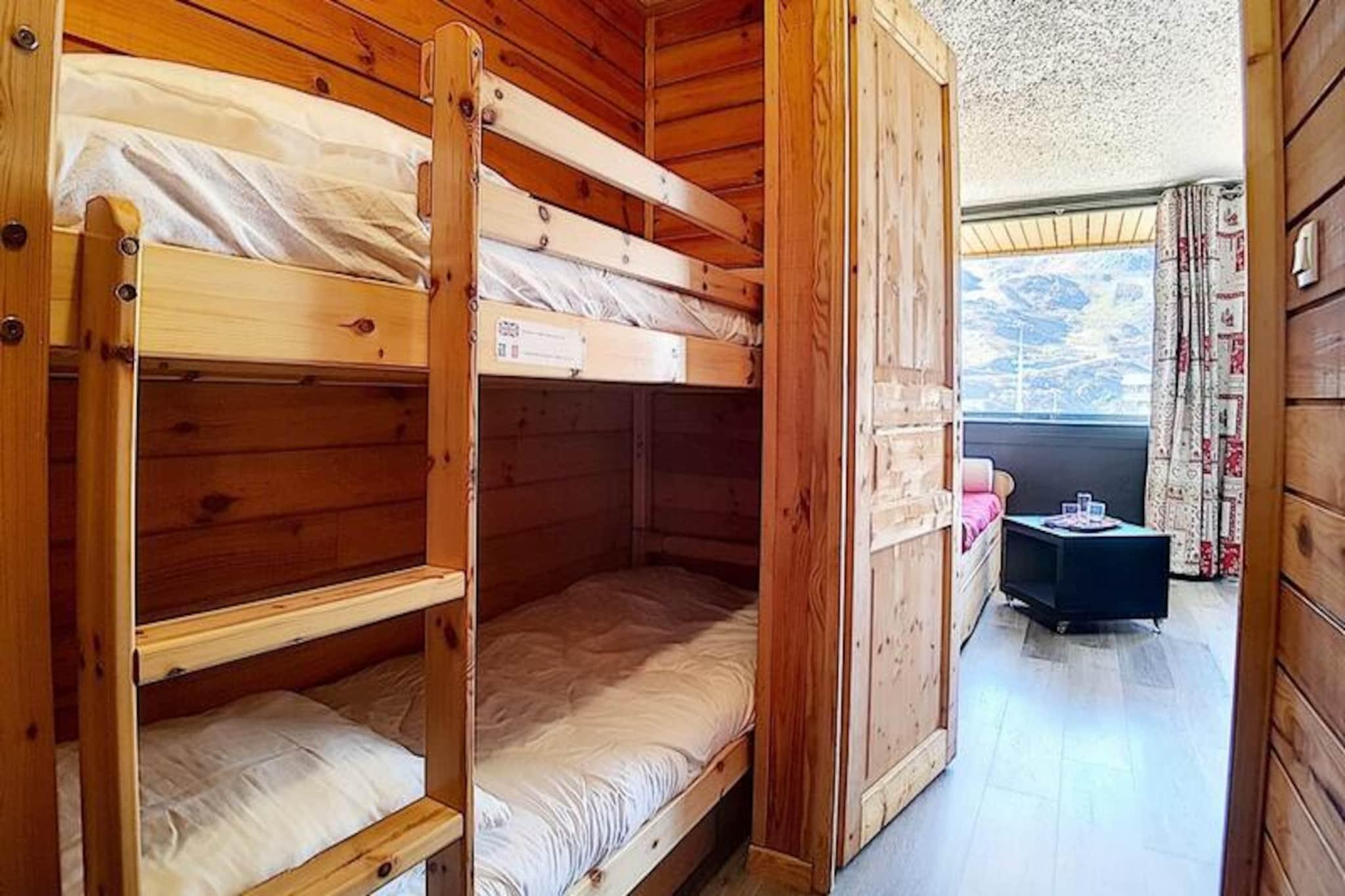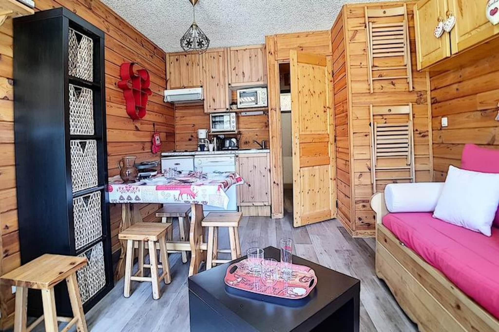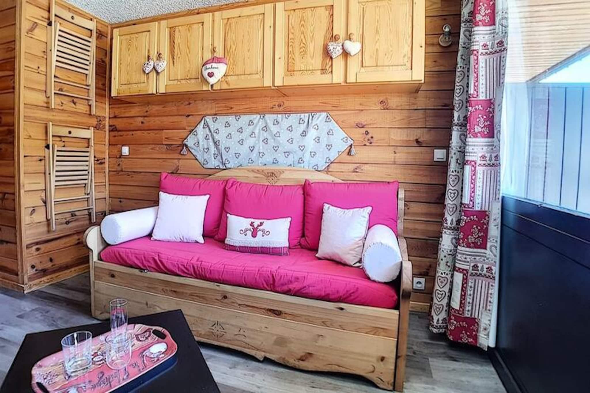 Højt over de franske alpers glitrende skråninger tilbyder denne charmerende studiolejlighed i Aravis-bygningen et hyggeligt tilflugtssted for både eventyrere og afslapningssøgende. Beliggende i hjertet af La Croisette-distriktet, placerer residensen dig kun få skridt fra skilifterne, hvilket sikrer ubesværet ski-in/ski-out adgang til de uberørte løjper. Uanset om du er en erfaren skiløber eller nybegynder, giver de blide pister lige uden for bygningen den perfekte start på din alpine rejse. Den sydvendte balkon inviterer dig til at nyde sollyset og se ud over de sneklædte landskaber, hvilket skaber øjeblikke af ren ro. \n\nDet omhyggeligt renoverede 22 m² store studio er designet til komfortabelt at rumme op til fire gæster. Stuen har en sovesofa og en udtræksseng, mens entréområdet har to enkeltkøjesenge, ideelt til familier eller små grupper. Et fuldt udstyret køkken med moderne apparater såsom køleskab, mikrobølgeovn, miniovn og opvaskemaskine gør det nemt at tilberede solide måltider efter en dag på pisterne. Badeværelset har bruser og toilet, hvilket sikrer bekvemmelighed under hele dit ophold. Yderligere faciliteter som et tv og betalt Wi-Fi sørger for underholdning og internetforbindelse, mens dyner og varme sikrer varme og komfort på kølige aftener. \n\nUd over lejligheden tilbyder det pulserende La Croisette-distrikt et væld af attraktioner. Pioupiou Club, en dagpleje og snehave, ligger kun 10 minutters gang væk, hvilket gør denne beliggenhed ideel for familier med små børn. Den nærliggende shoppingarkade og busstation giver nem adgang til lokale faciliteter og transport, mens ESF-skiskolens mødested sikrer, at begyndere hurtigt kan komme i gang. \n\nUanset om du er her for at svæve gennem pudrede pister, udforske den alpine charme eller blot slappe af i den fredfyldte bjergatmosfære, lover dette dejlige studie en uforglemmelig flugt i hjertet af de franske alper.