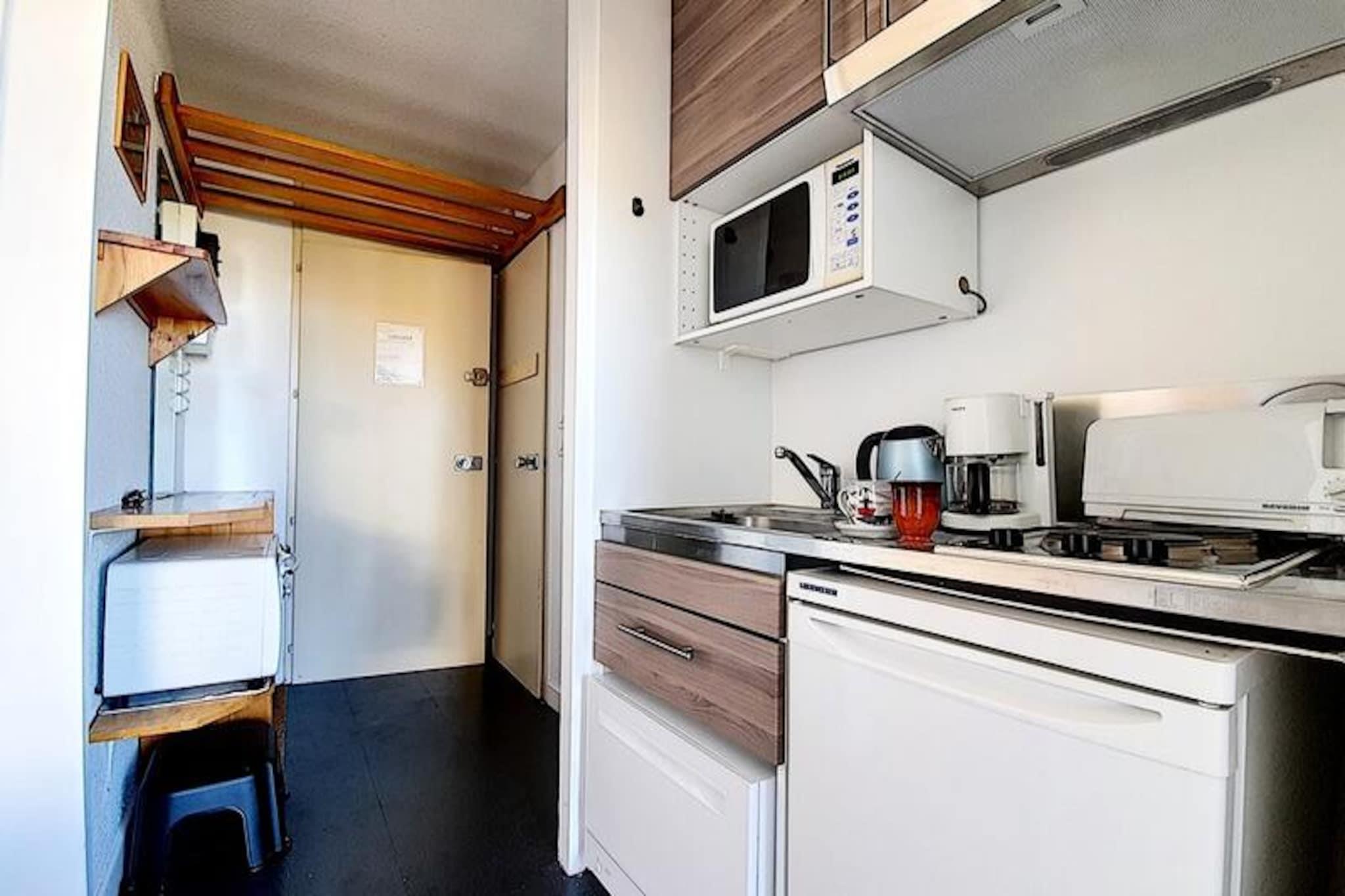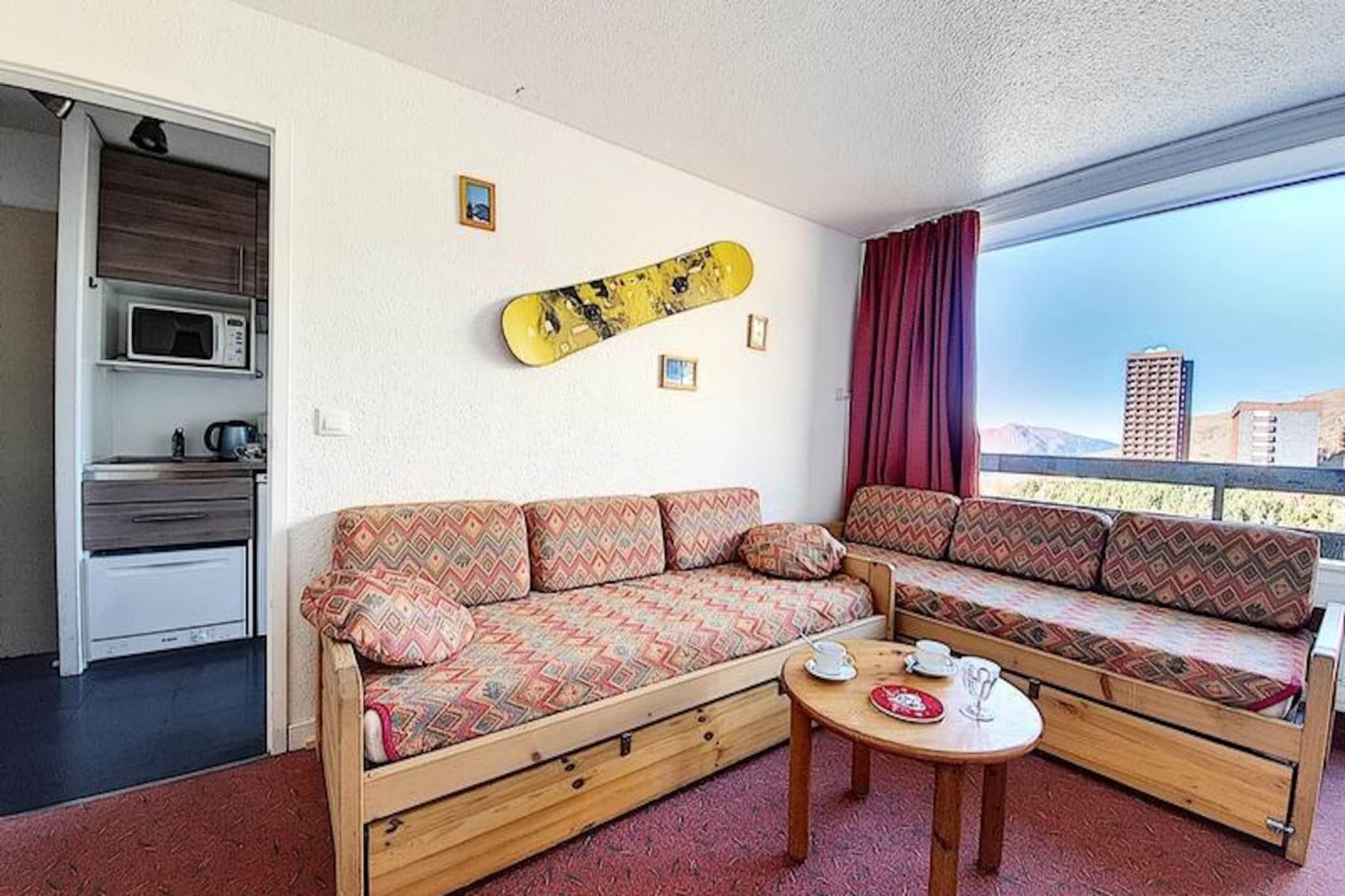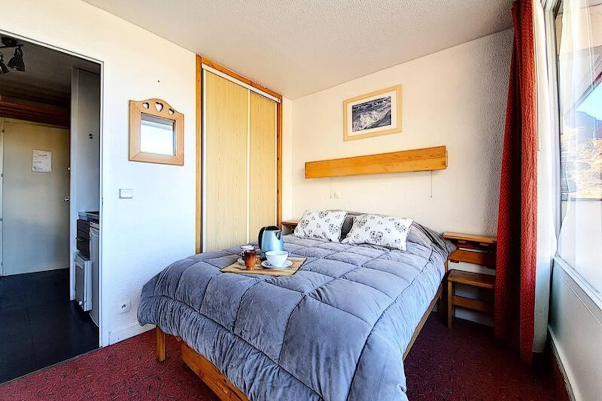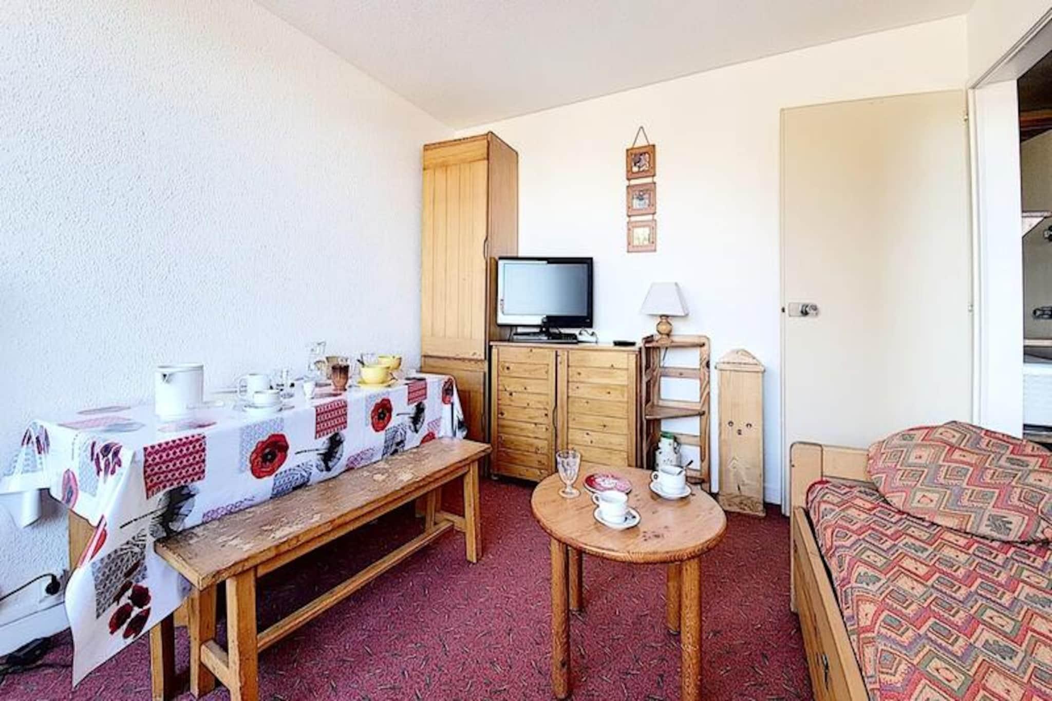 Højt over det travle La Croisette-distrikt inviterer denne charmerende 2-værelses lejlighed dig til at opleve magien i de franske alper. Beliggende på 7. sal i Chavière-residensen tilbyder den panoramaudsigt og direkte adgang til pisterne, hvilket gør den til en drømmedestination for skientusiaster. Uanset om du er her for at grave dig gennem frisk puddersne eller blot nyde den alpine atmosfære, er dette hyggelige tilflugtssted din port til uforglemmelige bjergeventyr. Med indkøbsarkaden bekvemt placeret i bygningens kælder er alt hvad du behøver kun få skridt væk. \n\nLejligheden er designet til op til fire gæster og har en komfortabel stue med to enkeltsenge og et separat soveværelse med en dobbeltseng. Den nordvendte planløsning inkluderer to små altaner, perfekt til at nyde den friske bjergluft og den fredfyldte udsigt. Køkkenet er udstyret med moderne bekvemmeligheder, herunder induktionskogeplader, mikrobølgeovn, køleskab, opvaskemaskine, kaffemaskine og elkedel, hvilket sikrer, at du har alt hvad du behøver for at tilberede solide måltider efter en dag på pisterne. Et badeværelse med bruser og et separat toilet bidrager til bekvemmeligheden, mens tæpper og varme sikrer et varmt og hyggeligt ophold. Familier vil sætte pris på den nærliggende børnehave, kun 300 meter væk, mens gratis udendørs parkering for foden af ??bygningen gør ankomsten nemmere (afhængigt af tilgængelighed). For dem, der søger internetforbindelse, er der betalt Wi-Fi-adgang tilgængelig, dog afhængigt af netværksdækning. Boligens førsteklasses beliggenhed placerer dig i nærheden af ??lokale faciliteter og den pulserende atmosfære på La Croisette, hvor afterskiing-muligheder og alpin charme findes i overflod. Uanset om du besøger lejligheden for spændingen ved skiløb eller roen i bjergene, tilbyder denne lejlighed en indbydende base for at skabe varige minder. Med sin bekvemme beliggenhed, gennemtænkte faciliteter og fantastiske omgivelser er det det perfekte valg til din næste alpine ferie.