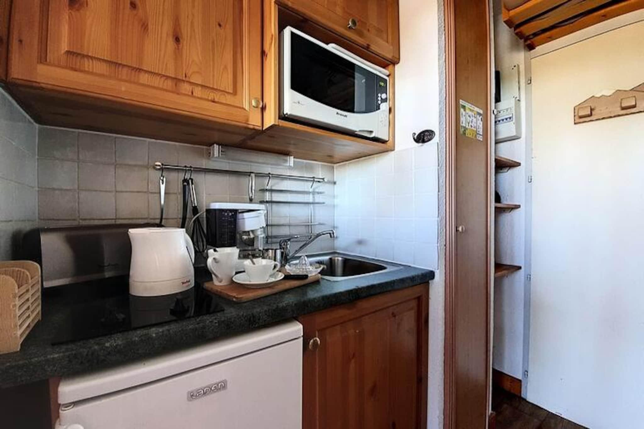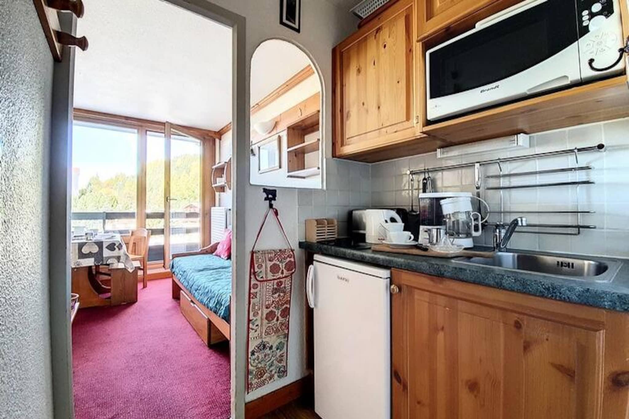 Højt over det travle La Croisette-distrikt tilbyder denne hyggelige studiolejlighed et roligt tilflugtssted for dem, der søger den perfekte alpine ferie. Forestil dig at vågne op til den friske bjergluft og træde ud på din private nordvendte balkon for at beundre de rolige omgivelser. Uanset om du er her for skiløb eller en fredelig flugt, blander denne charmerende bolig bekvemmelighed med komfort i hjertet af de franske alper.\n\nDet nyrenoverede 17 m² store studio er omhyggeligt designet til at rumme op til tre gæster. Opholdsstuen har to enkeltsenge og en udtræksseng, der sikrer afslappende nætter efter dage fyldt med udforskning. Et kompakt, men veludstyret køkken kan prale af et kogeplade med to blus, kombinationsovn, køleskab, miniopvaskemaskine, brødrister, elkedel og kaffemaskine, hvilket gør det nemt at tilberede måltider. Badeværelset har badekar og toilet, hvilket tilbyder et afslappende sted at slappe af. Med termoruder og varme vil du have det hyggeligt uanset årstiden.\n\nChavière-boligen giver direkte adgang til pisterne, hvilket gør den ideel for vintersportsentusiaster. Bygningen er forbundet med en shoppingarkade, hvilket sikrer, at alle fornødenheder er inden for rækkevidde, mens en børnehave er bekvemt placeret kun 300 meter væk. Gratis udendørs parkering ved foden af ??bygningen bidrager til at gøre dit ophold endnu nemmere, og der er betalt Wi-Fi-adgang til rådighed for dem, der har brug for at holde sig forbundet.\n\nUanset om du er tiltrukket af spændingen ved pisterne eller charmen ved den alpine livsstil, er dette studie din indgang til en uforglemmelig bjergoplevelse. Med sin førsteklasses beliggenhed og gennemtænkte faciliteter er det det perfekte valg for par eller små familier, der ønsker at fordybe sig i de franske alpers skønhed.