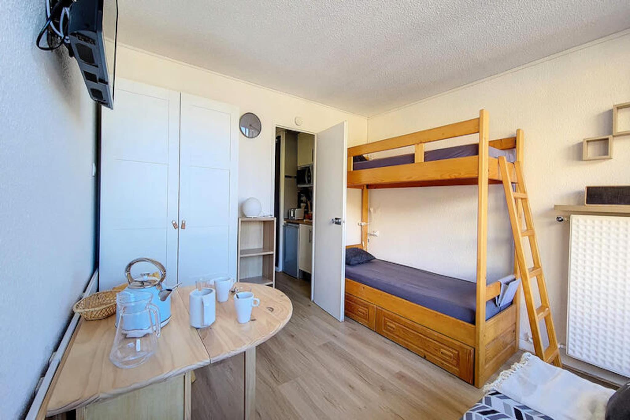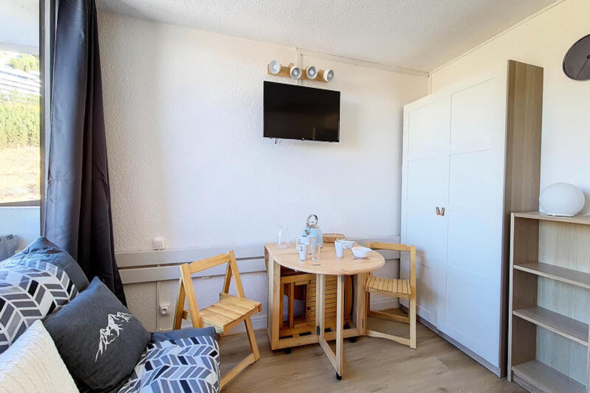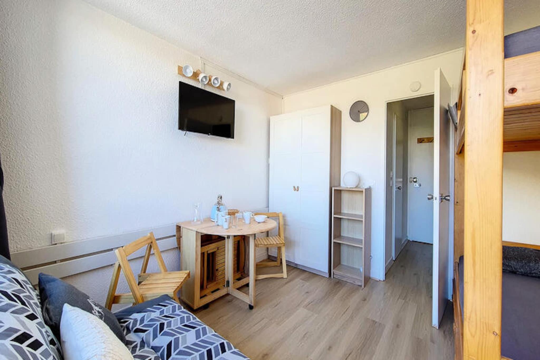 Højt over det maleriske La Croisette-distrikt tilbyder denne charmerende studiolejlighed et hyggeligt tilflugtssted for dem, der søger en problemfri alpin ferie. Beliggende på 6. sal i Chavière-residensen tilbyder ejendommen en betagende udsigt over de omkringliggende tinder og direkte adgang til pisterne, hvilket gør den til et paradis for skientusiaster. Med bekvemmeligheden af ??en elevator og en shoppingarkade lige nedenunder lover dit ophold både komfort og praktisk anvendelighed. \n\nDette smukt renoverede 17 m² store studio er omhyggeligt designet til at rumme op til tre gæster. Opholdsstuen har en komfortabel dobbeltsovesofa og en enkeltseng, perfekt til par eller små familier. Et kompakt, men fuldt udstyret køkken inkluderer et kogeplade med 2 blus, mikrobølgeovn/grill, mini-opvaskemaskine, elkedel og kaffemaskine, så du nemt kan tilberede måltider. Badeværelset er udstyret med badekar og toilet, mens den lille nordvendte balkon inviterer dig til at slappe af med en kop kaffe og nyde den friske bjergluft. Moderne bekvemmeligheder som tv og betalt Wi-Fi (afhængigt af dækning) forbedrer dit ophold, mens linoleumsgulvet og de hyggelige tæpper tilføjer et strejf af varme.\n\nTræd udenfor, og du vil finde dig selv i hjertet af La Croisettes pulserende atmosfære. Pisterne ligger kun få skridt væk, og gratis udendørs parkering ved foden af ??bygningen (afhængigt af tilgængelighed) sikrer problemfri ankomst. Familier vil sætte pris på børnehaven, der ligger kun 300 meter væk, mens den nærliggende shoppingarkade tilbyder en række spisesteder og butikker at udforske efter en dag på bjerget.\n\nUanset om du er her for spændingen ved skiløb eller et fredeligt tilflugtssted i Alperne, kombinerer dette studie i Chavière-residensen bekvemmelighed, komfort og charme for at skabe en uforglemmelig ferieoplevelse.