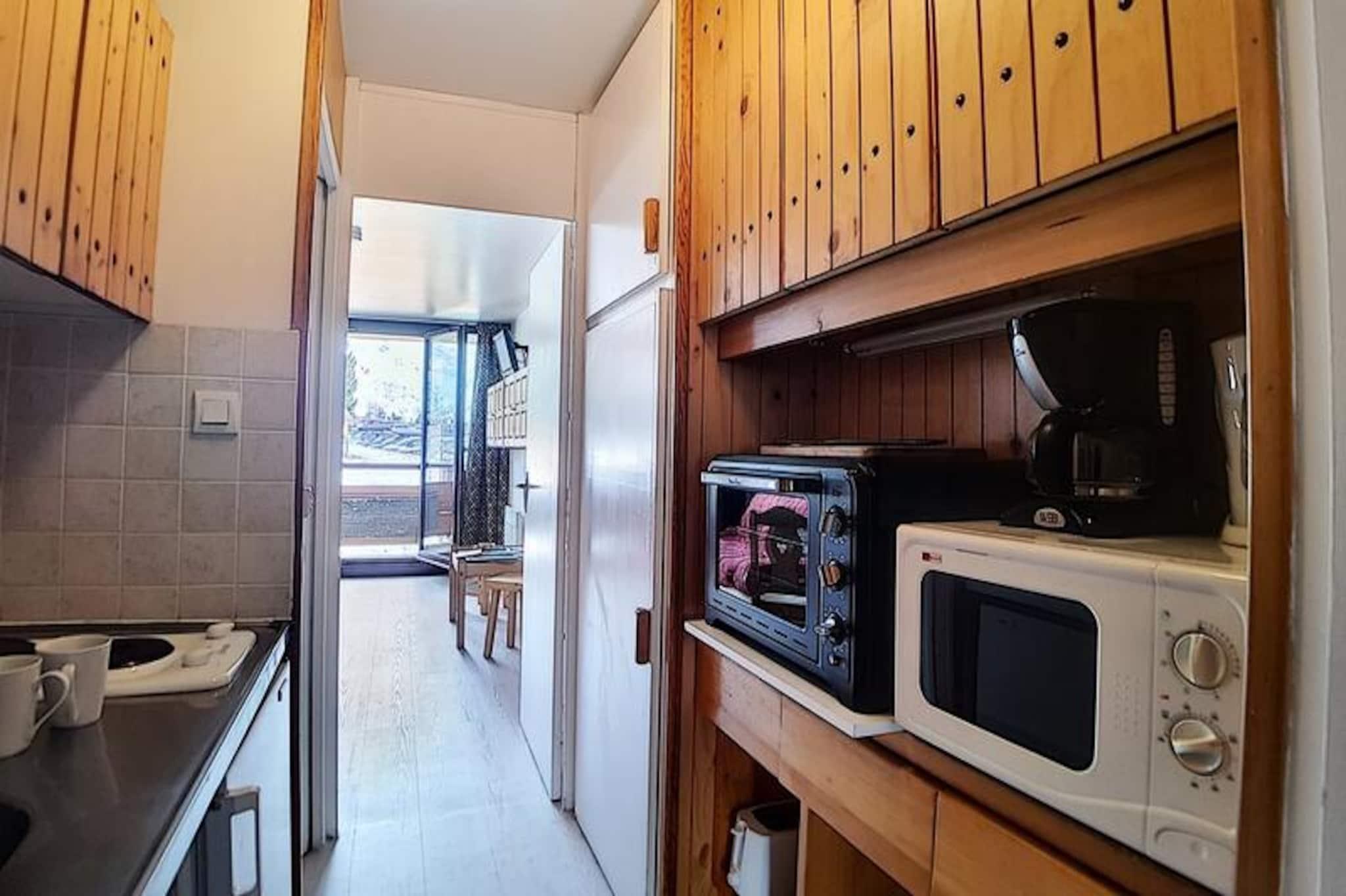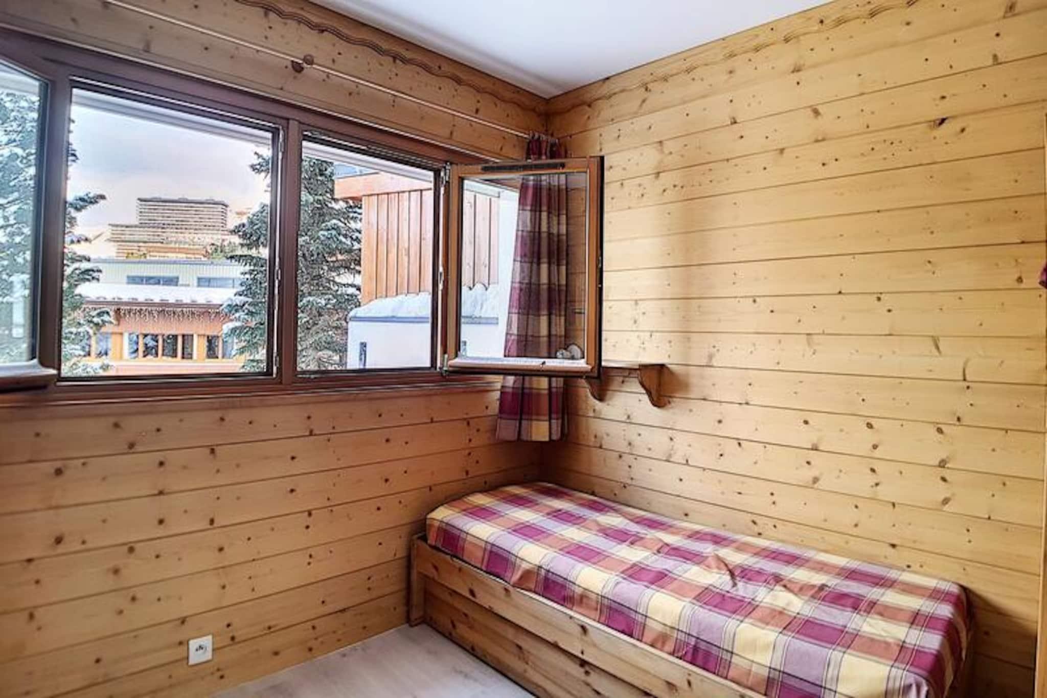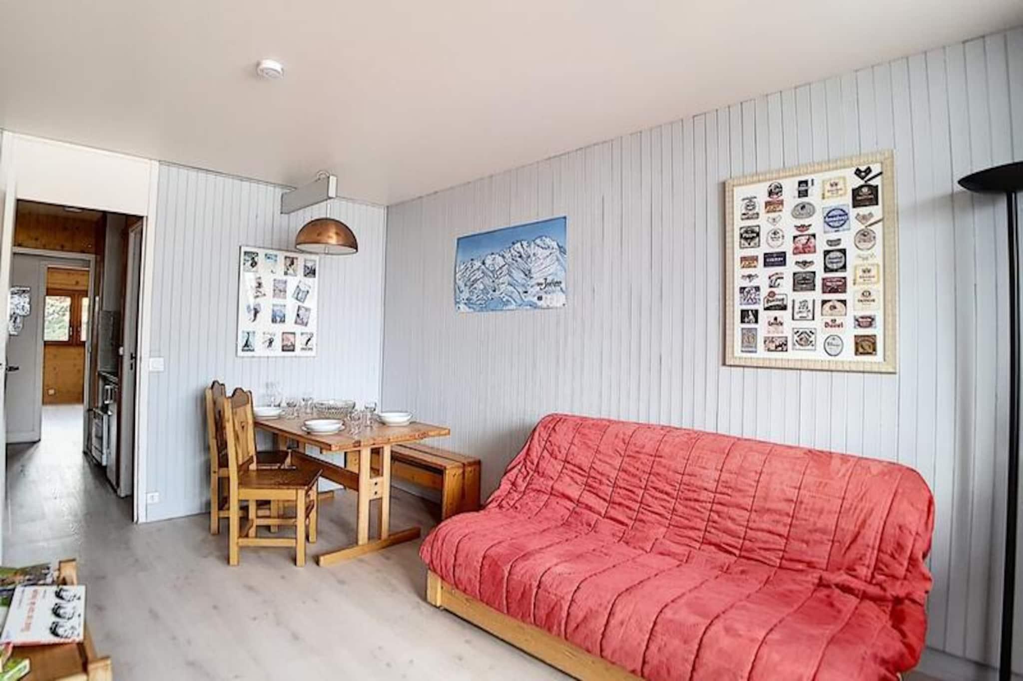 I hjertet af den charmerende Alpages-bygning tilbyder denne hyggelige lejlighed et dejligt alpint tilflugtssted for familier og små grupper, der søger et roligt, men bekvemt ophold i de franske alper. Kun få skridt fra den travle La Croisette-indkøbsarkade er boligen perfekt placeret til at give nem adgang til lokale faciliteter, samtidig med at den bevarer en fredelig atmosfære. Den sydvendte balkon inviterer dig til at nyde solskinnet og den fredfyldte udsigt over de omkringliggende tinder, hvilket skaber en perfekt baggrund for din bjergferie. \n\nIndvendigt er lejligheden omhyggeligt designet til at rumme op til fem gæster fordelt på to værelser. Stuen har en komfortabel dobbeltsovesofa og et tv, hvilket sikrer et afslappende sted at slappe af efter en dag med eventyr. Soveværelset har en enkeltseng og to enkeltkøjesenge, hvilket gør det ideelt for familier med børn. Køkkenet er fuldt udstyret med moderne apparater, herunder køleskab, miniovn, mikrobølgeovn, opvaskemaskine og kaffemaskine, så du kan tilberede solide måltider til dine alpine udforskninger. Badeværelset har et beroligende badekar, og det separate toilet gør dit ophold mere bekvemt. \n\nBeliggende kun 100 meter fra pisterne er beliggenheden en drøm for skientusiaster, med skibokse i kælderen for ekstra bekvemmelighed. Familier vil sætte pris på den nærliggende dagpleje og snehave, perfekt til at underholde de små. Busstoppestedet ligger kun 50 meter væk, hvilket giver nem adgang til busstationen og de omkringliggende attraktioner. Uanset om du er her for at stå på ski, vandre eller bare slappe af, placerer denne lejlighed dig i hjertet af det hele. \n\nMed sin varme atmosfære, praktiske faciliteter og uovertrufne beliggenhed lover denne bolig en uforglemmelig alpin flugt i alle årstider. Lad magien i de franske alper fange dig, mens du skaber dyrebare minder i dette indbydende hjem væk fra hjemmet.