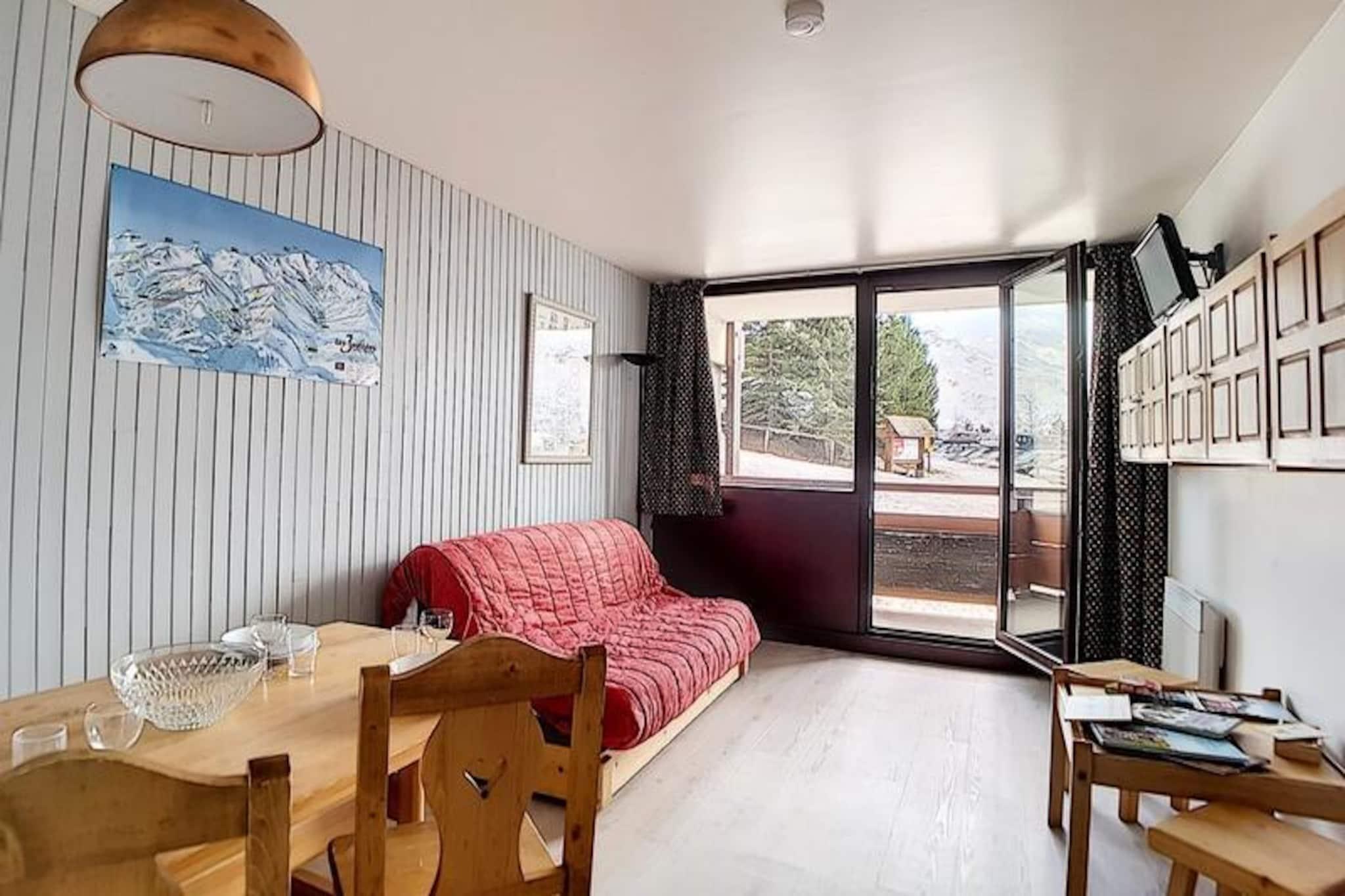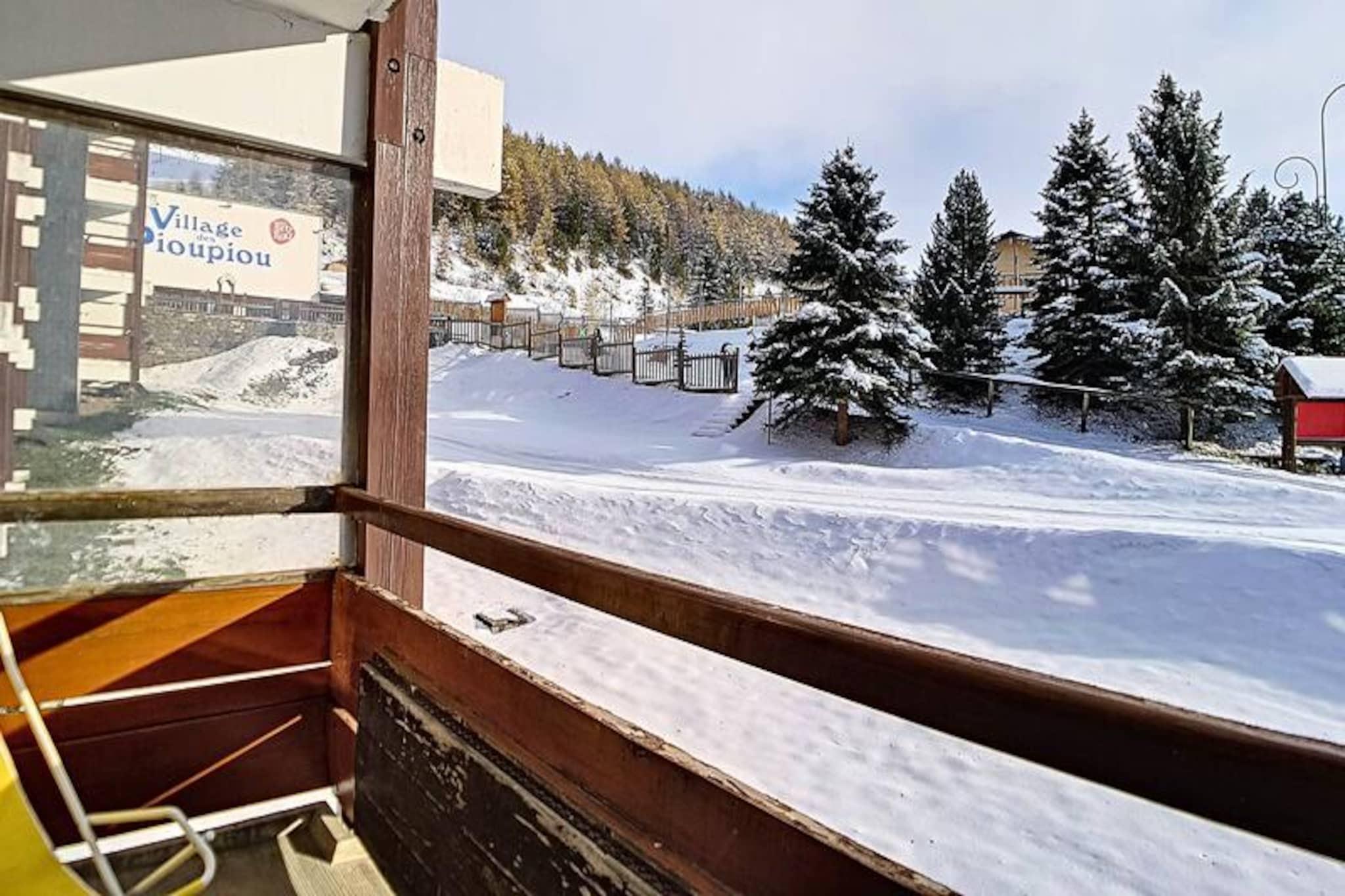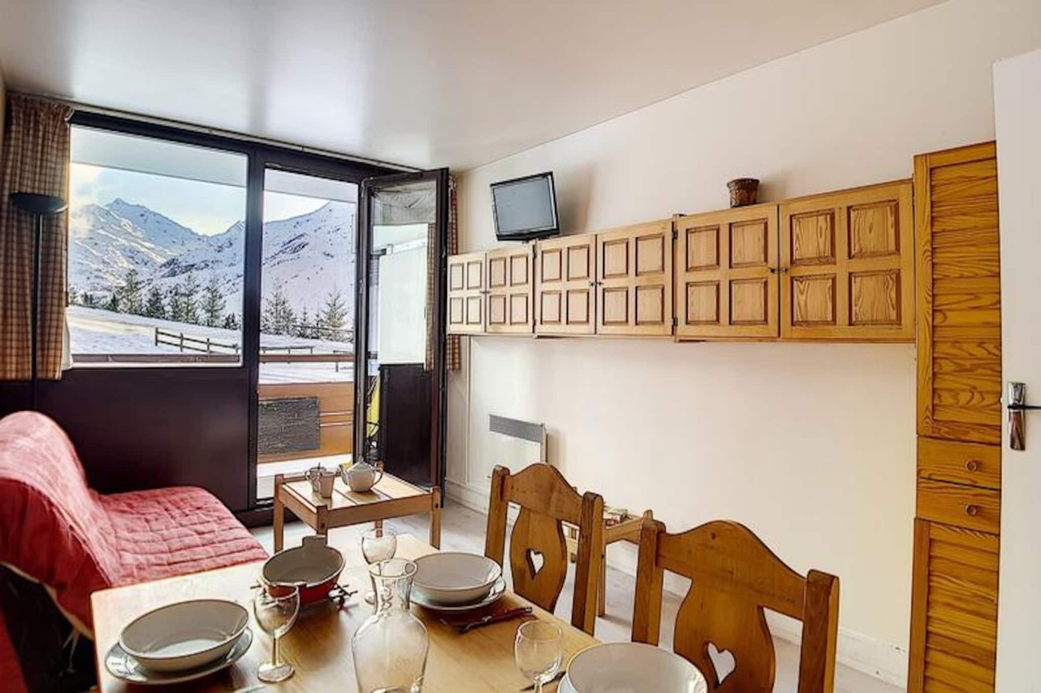 I hjertet af den charmerende Alpages-bygning tilbyder denne hyggelige lejlighed et dejligt alpint tilflugtssted for familier og små grupper, der søger et roligt, men bekvemt ophold i de franske alper. Kun få skridt fra den travle La Croisette-indkøbsarkade er boligen perfekt placeret til at give nem adgang til lokale faciliteter, samtidig med at den bevarer en fredelig atmosfære. Den sydvendte balkon inviterer dig til at nyde solskinnet og den fredfyldte udsigt over de omkringliggende tinder, hvilket skaber en perfekt baggrund for din bjergferie. \n\nIndvendigt er lejligheden omhyggeligt designet til at rumme op til fem gæster fordelt på to værelser. Stuen har en komfortabel dobbeltsovesofa og et tv, hvilket sikrer et afslappende sted at slappe af efter en dag med eventyr. Soveværelset har en enkeltseng og to enkeltkøjesenge, hvilket gør det ideelt for familier med børn. Køkkenet er fuldt udstyret med moderne apparater, herunder køleskab, miniovn, mikrobølgeovn, opvaskemaskine og kaffemaskine, så du kan tilberede solide måltider til dine alpine udforskninger. Badeværelset har et beroligende badekar, og det separate toilet gør dit ophold mere bekvemt. \n\nBeliggende kun 100 meter fra pisterne er beliggenheden en drøm for skientusiaster, med skibokse i kælderen for ekstra bekvemmelighed. Familier vil sætte pris på den nærliggende dagpleje og snehave, perfekt til at underholde de små. Busstoppestedet ligger kun 50 meter væk, hvilket giver nem adgang til busstationen og de omkringliggende attraktioner. Uanset om du er her for at stå på ski, vandre eller bare slappe af, placerer denne lejlighed dig i hjertet af det hele. \n\nMed sin varme atmosfære, praktiske faciliteter og uovertrufne beliggenhed lover denne bolig en uforglemmelig alpin flugt i alle årstider. Lad magien i de franske alper fange dig, mens du skaber dyrebare minder i dette indbydende hjem væk fra hjemmet.