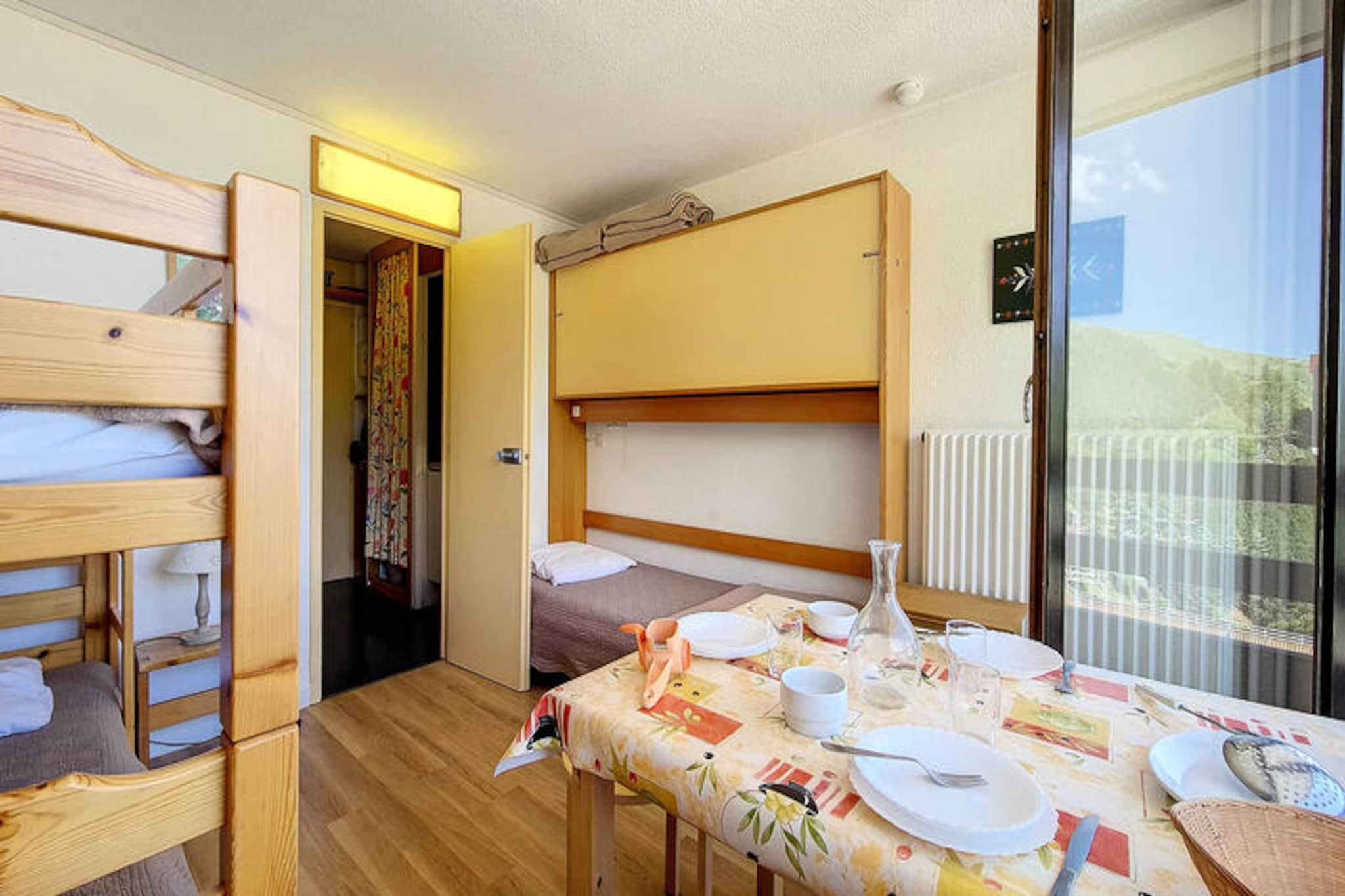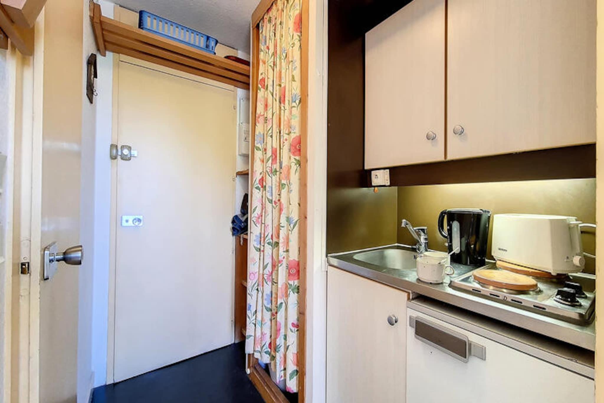 Højt over den maleriske dal tilbyder denne hyggelige studiolejlighed i Chavière-residensen et charmerende alpint tilflugtssted i hjertet af La Croisette-distriktet. Med direkte adgang til pisterne og en bekvem forbindelse til shoppingarkaden nedenfor er ejendommen perfekt beliggende til både eventyr og afslapning. Uanset om du er her for at stå på ski eller blot nyde den fredfyldte udsigt over bjergene fra din nordvendte balkon, lover denne bolig et mindeværdigt ophold. Den friske alpine luft og de betagende udsigter sætter tonen for en uforglemmelig ferie. \n\nDet 17 m² store studio er designet til op til tre gæster og er kompakt, men omhyggeligt udstyret for at sikre komfort. Opholdsstuen har en enkelt sovesofa og to enkeltkøjesenge, suppleret af et tv til hyggelige aftener indendørs. Køkkenet inkluderer essentielle apparater såsom et kogeplade med to blus, køleskab, mikrobølgeovn, brødrister, elkedel og kaffemaskine, hvilket gør det nemt at tilberede måltider efter en dag på pisterne. Badeværelset er udstyret med badekar og toilet, og lejligheden er udstyret med tæpper for ekstra varme. Bemærk venligst, at køjesengen ikke er egnet til børn under seks år.\n\nChavière-residensen kan prale af gratis udendørs parkering ved foden af ??bygningen (afhængigt af tilgængelighed), og en daginstitution er bekvemt placeret kun 300 meter væk. For dem, der har brug for at holde sig forbundet, er der betalt Wi-Fi-adgang tilgængelig, afhængigt af netværksdækning. Residensens nærhed til pisterne og lokale faciliteter sikrer, at alt hvad du behøver er inden for rækkevidde.\n\nUanset om du søger spændende vintersport eller en fredelig sommerferie, er denne studiolejlighed den perfekte base for at udforske de fantastiske franske alper. Fra sine praktiske faciliteter til sin uovertrufne beliggenhed inviterer Chavière-residensen dig til at skabe varige minder i et af de smukkeste bjerglandskaber i Europa.