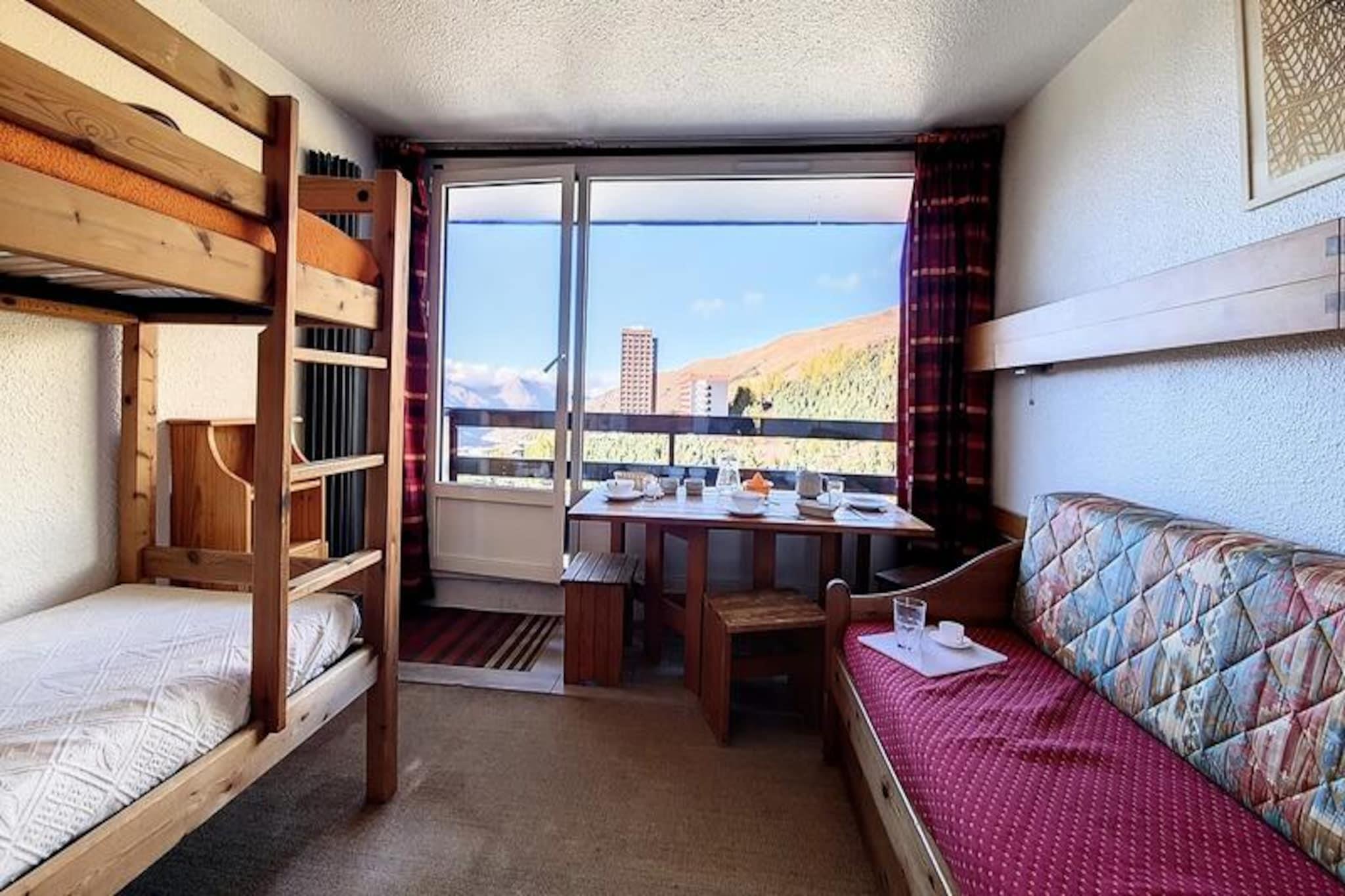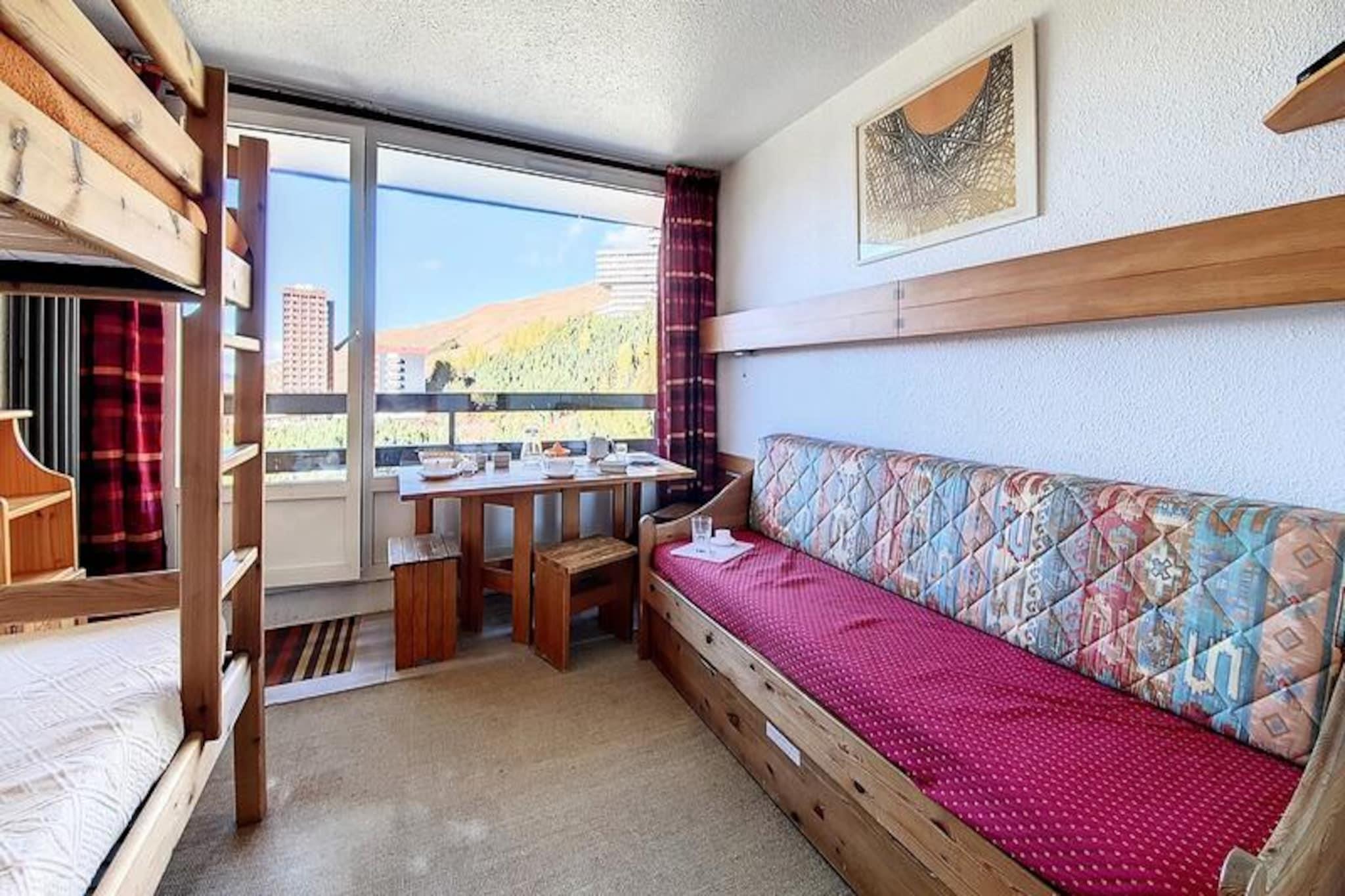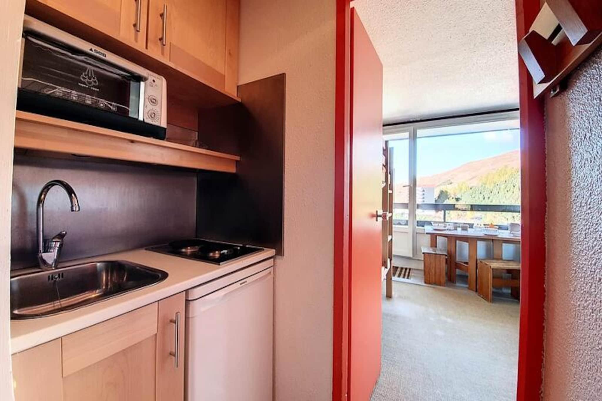 Højt over det travle La Croisette-distrikt tilbyder denne hyggelige studiolejlighed et charmerende alpint tilflugtssted for tre gæster. Fra sin placering på 8. sal, der er tilgængelig med elevator, kan du nyde en betagende udsigt over de snedækkede tinder og den livlige atmosfære nedenfor. Den nordvendte balkon giver et fredeligt sted at nippe til din morgenkaffe, mens du indånder den friske bjergluft og sætter tonen for en dag med eventyr i hjertet af de franske alper. Uanset om du søger spændende skiløjper eller rolige øjeblikke omgivet af natur, placerer denne bolig dig lige i centrum af det hele. \n\nIndenfor er det 17 m² store studio omhyggeligt designet til at maksimere komfort og funktionalitet. Opholdsstuen har en enkeltseng, en enkelt sovesofa og en udtræksseng, der sikrer afslappende nætter efter aktive dage. Et kompakt køkken udstyret med et kogeplade med to blus, køleskab, miniovn og kaffemaskine giver dig mulighed for nemt at tilberede enkle måltider. De tæppebelagte gulve og varme tæpper tilføjer et strejf af hygge, mens fjernsynet tilbyder underholdning til rolige aftener indendørs. Badeværelset har badekar og toilet, der tilbyder alt det nødvendige for et behageligt ophold. \n\nTræd udenfor, og du finder direkte adgang til pisterne, hvilket gør denne lejlighed til en drøm for skientusiaster. Bygningens kælder er forbundet med en shoppingarkade, der tilbyder bekvemmelighed lige ved hånden. Gratis udendørs parkering er tilgængelig for foden af ??bygningen, afhængigt af tilgængelighed, og børnehaven ligger kun en kort 300 meter gåtur væk. Betaling for Wi-Fi sikrer, at du kan holde forbindelsen under dit ophold, selvom dækningen kan variere. \n\nUanset om du er her for at grave dig gennem frisk puddersne eller blot nyde den alpine charme, er denne studiolejlighed en ideel base for en uforglemmelig bjergferie. Dens førsteklasses beliggenhed og gennemtænkte faciliteter gør den til et perfekt valg for par eller små grupper, der søger en hyggelig og bekvem flugt i de franske alper.