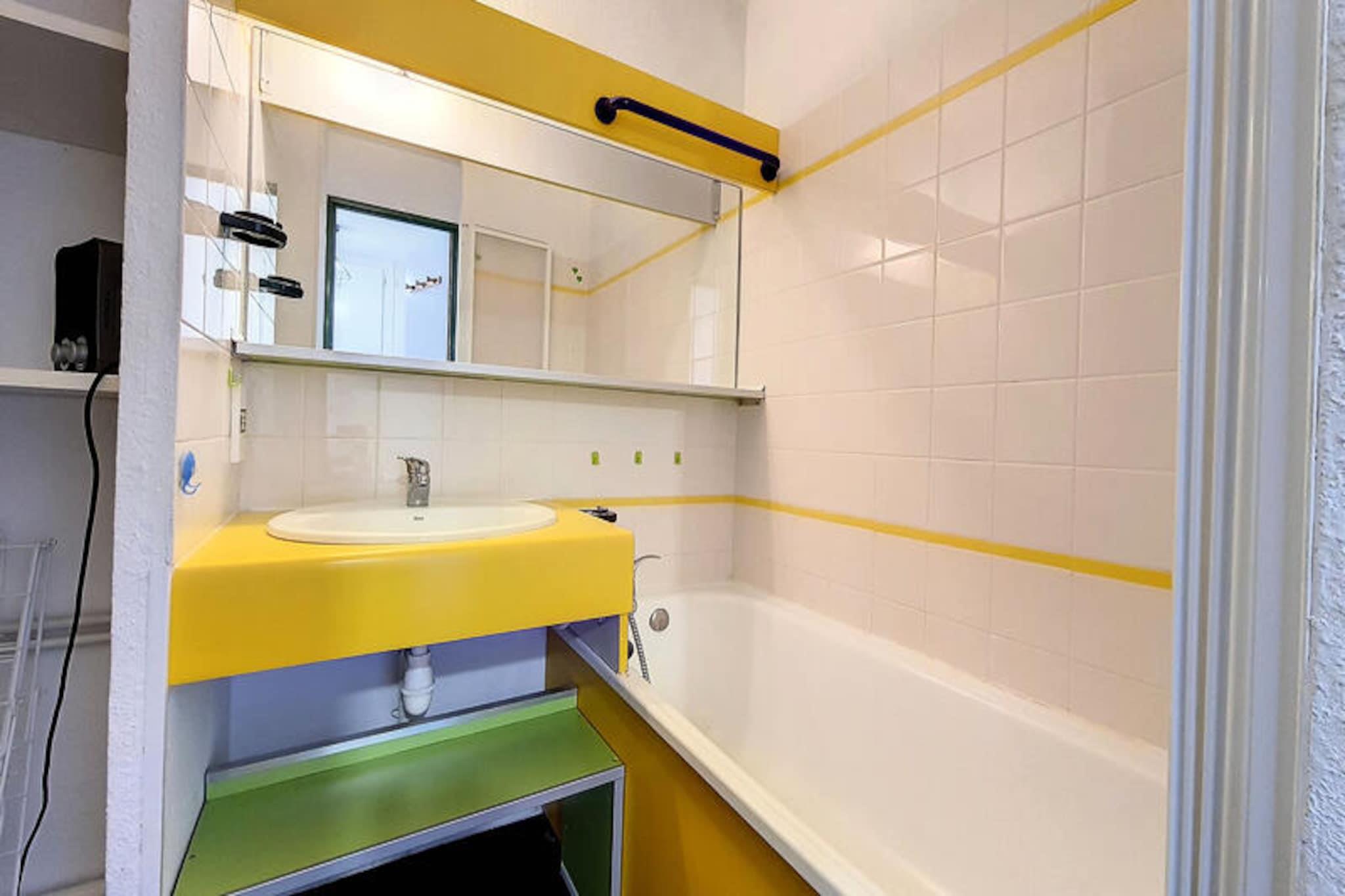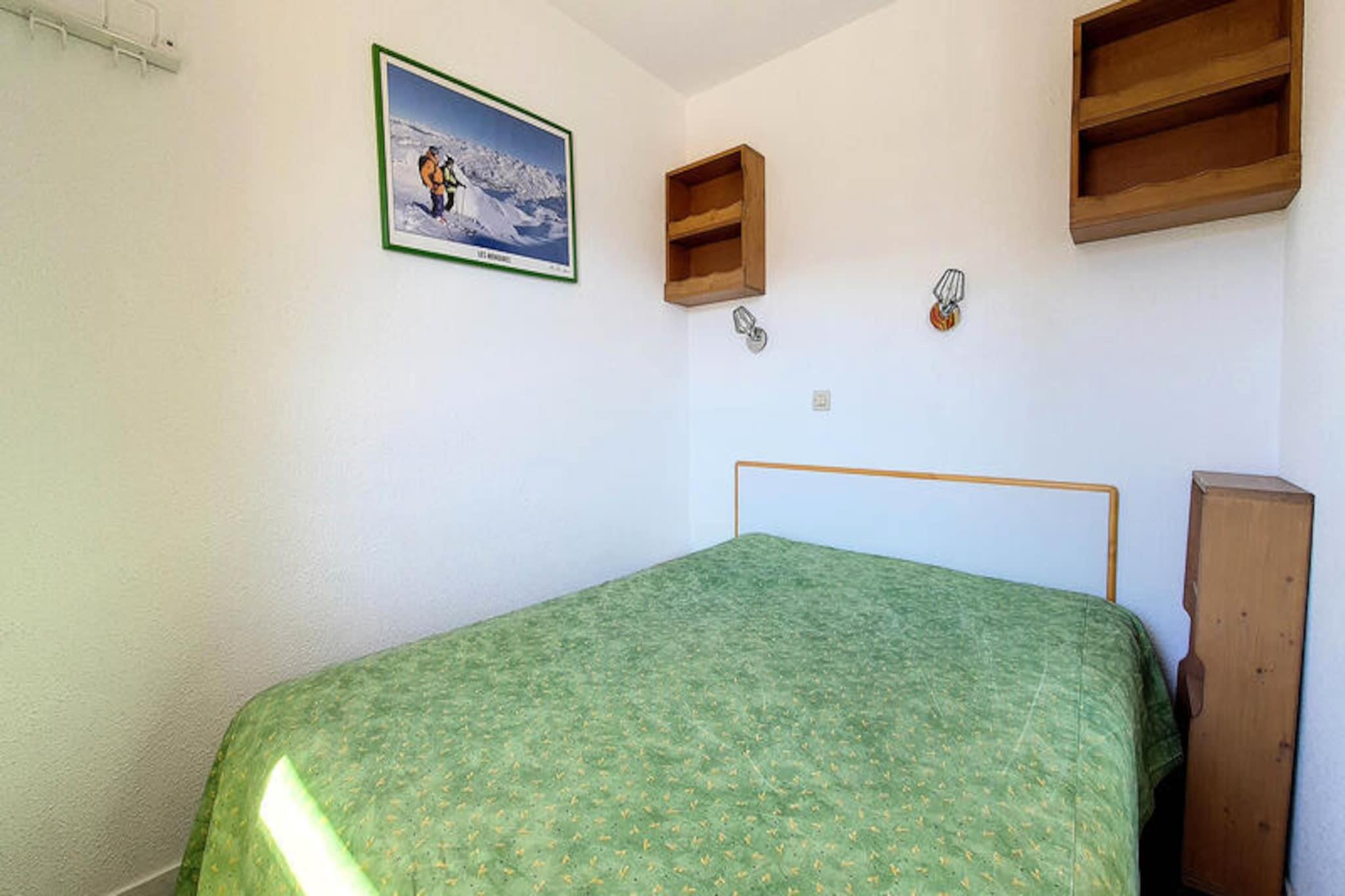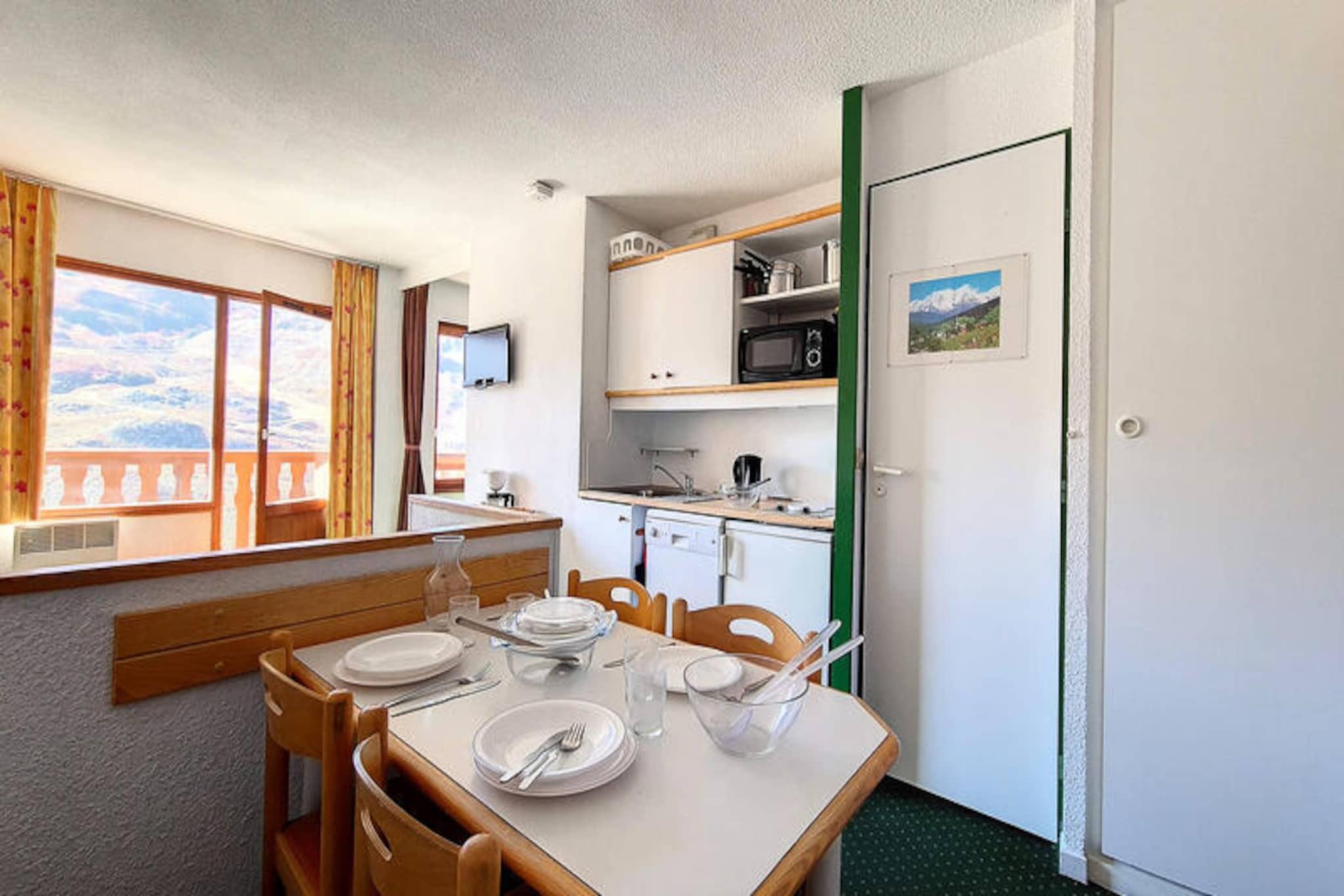 Højt over de fredfyldte skråninger i Reberty 2000 tilbyder denne charmerende lejlighed et hyggeligt tilflugtssted med betagende panoramaudsigt over de franske alper. Beliggende på 7. sal i Necou-residensen kombinerer ejendommen bekvemmelighed med alpin charme, hvilket gør den til det perfekte tilflugtssted for par eller små familier, der søger en rolig bjergferie. Fra det øjeblik du ankommer, inviterer den sydvestvendte balkon dig til at nyde de gyldne nuancer af den nedgående sol, mens du kigger ud over de snedækkede tinder. \n\nIndvendigt er lejligheden omhyggeligt designet til at maksimere komfort og funktionalitet. Stuen, badet i naturligt lys, har franske døre, der åbner ud til den rummelige balkon og to enkeltsenge til fleksible sovearrangementer. Et separat soveværelse med en dobbeltseng, adskilt af et gardin, sikrer privatliv og en god nats søvn. Det veludstyrede køkken inkluderer moderne apparater såsom mikrobølgeovn, køleskab, opvaskemaskine og kaffemaskine, hvilket gør det nemt at tilberede måltider efter en dag på pisterne. Badeværelset tilbyder et afslappende badekar, perfekt til afslapning efter en aktiv dag. \n\nBeliggenheden er uovertruffen med direkte adgang til pisterne og butikkerne blot 50 meter væk. Uanset om du er her for at grave dig gennem frisk puddersne om vinteren eller udforske de alpine stier om sommeren, sikrer den reserverede parkeringsplads og nærheden til lokale faciliteter et stressfrit ophold. \n\nMed sin varme atmosfære, fantastiske udsigt og førsteklasses beliggenhed er denne lejlighed en dejlig base for at skabe uforglemmelige minder i hjertet af de franske alper. Uanset om du nyder en stille aften på balkonen eller begiver dig ud på spændende udendørseventyr, lover dette hyggelige tilflugtssted en virkelig magisk oplevelse.