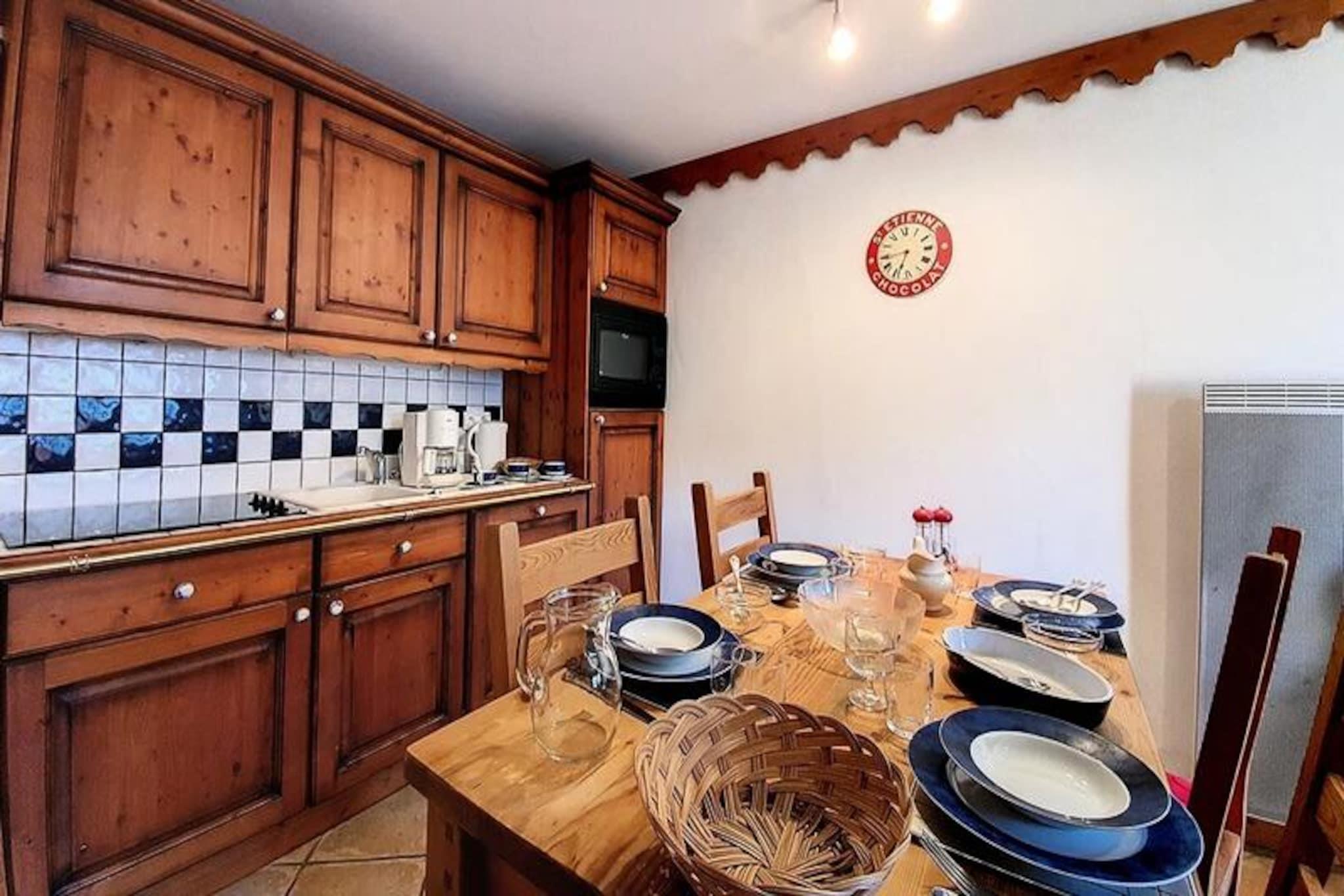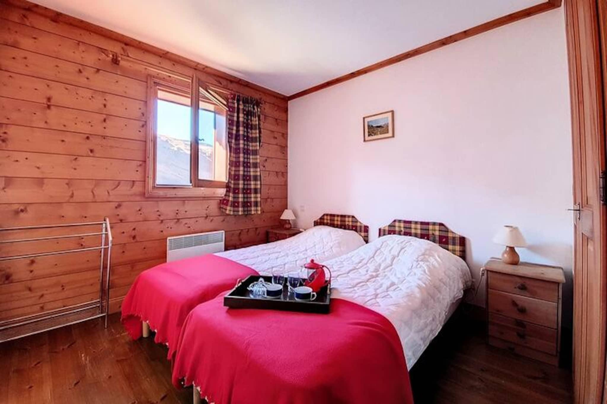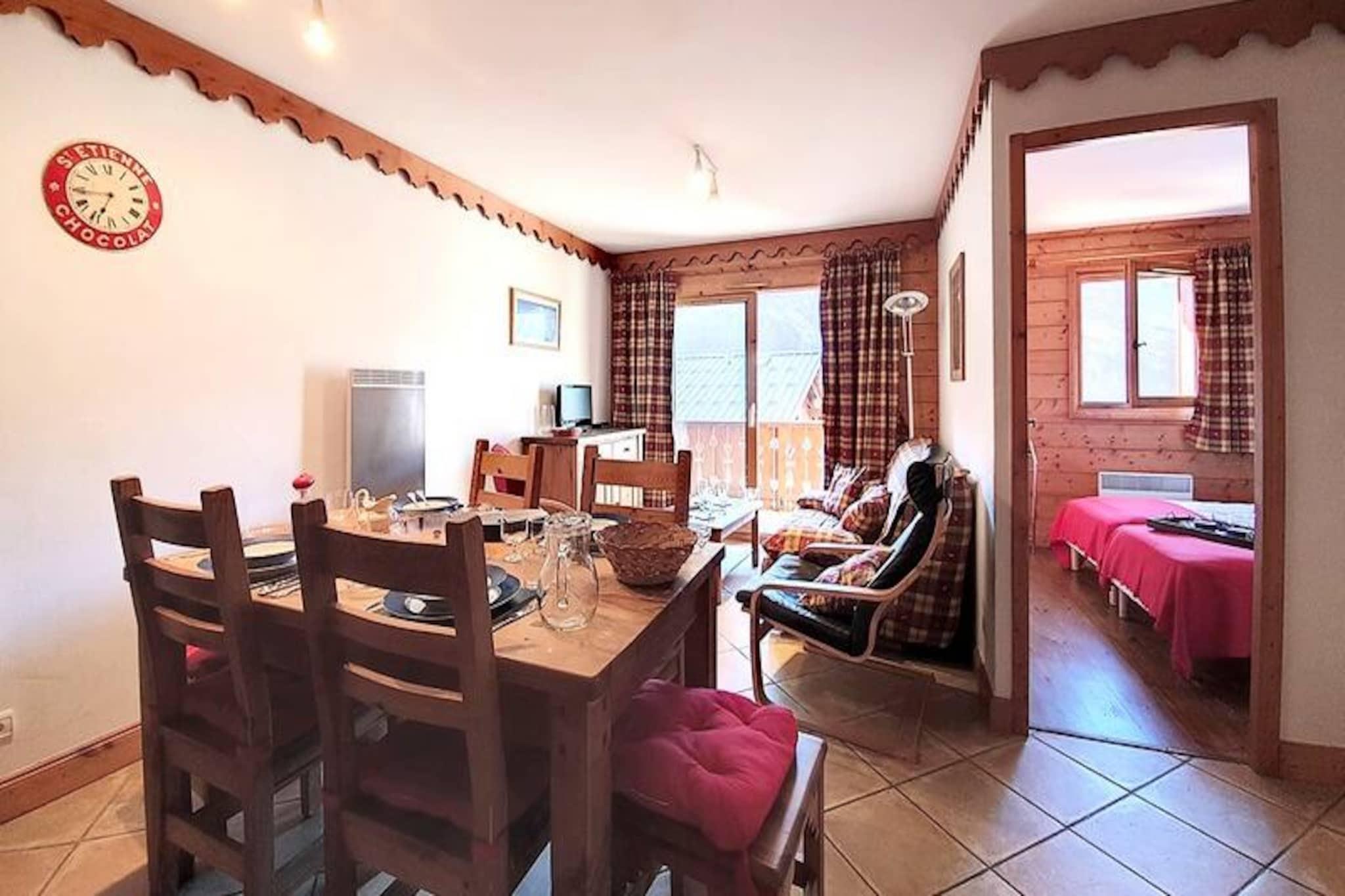 I det charmerende Preyerand-distrikt i Les Menuires tilbyder denne dejlige chaletlejlighed et hyggeligt alpint tilflugtssted med direkte adgang til pisterne, kun 20 meter fra din dør. Forestil dig at træde udenfor og glide ud på skipoulevarden, klar til at udforske det verdensberømte skiområde Les Trois Vallées. Med en vestvendt balkon kan du nyde en fantastisk udsigt over solnedgangen over de snedækkede tinder, hvilket skaber den perfekte kulisse for din bjergferie. Ejendommen tilbyder også bekvem parkering ved foden af ??bygningen og en gratis shuttlebus for nem adgang til feriestedets centrum. Et supermarked ligger kun en kort gåtur på 200 meter væk, hvilket sikrer, at alle fornødenheder er inden for rækkevidde. \n\nDenne lejlighed på 42 m² er designet til at rumme op til seks gæster og kombinerer komfort og praktisk anvendelighed. Stuen har en sovesofa til to, mens de to soveværelser tilbyder fleksible sovemuligheder, herunder enkeltsenge, der kan sættes sammen, og køjesenge med en ekstra udtræksmulighed. Det fuldt udstyrede køkken har keramisk kogeplade, kombineret mikrobølgeovn/ovn, køleskab, opvaskemaskine og elektrisk kaffemaskine, hvilket gør det nemt at tilberede solide måltider efter en dag på pisterne. Moderne bekvemmeligheder som et fjernsyn med dvd-afspiller, en vaskemaskine og et flisebelagt gulv bidrager til bekvemmeligheden, mens badeværelset med badekar giver en afslappende afslutning på dine aktive dage. \n\nVinterophold gøres endnu mere behagelige med inkluderet sengelinned og badehåndklæder, hvilket sikrer en problemfri oplevelse. For dem, der søger ekstra bekvemmelighed, kan der lejes en overdækket parkeringsplads i nærheden. Ejendommens nærhed til pisterne og de vigtigste faciliteter gør det til et ideelt valg for både skientusiaster og familier. Uanset om du er her for at grave dig gennem frisk puddersne eller blot nyde den rolige alpine atmosfære, tilbyder denne lejlighed den perfekte base for uforglemmelige minder i Les Menuires.