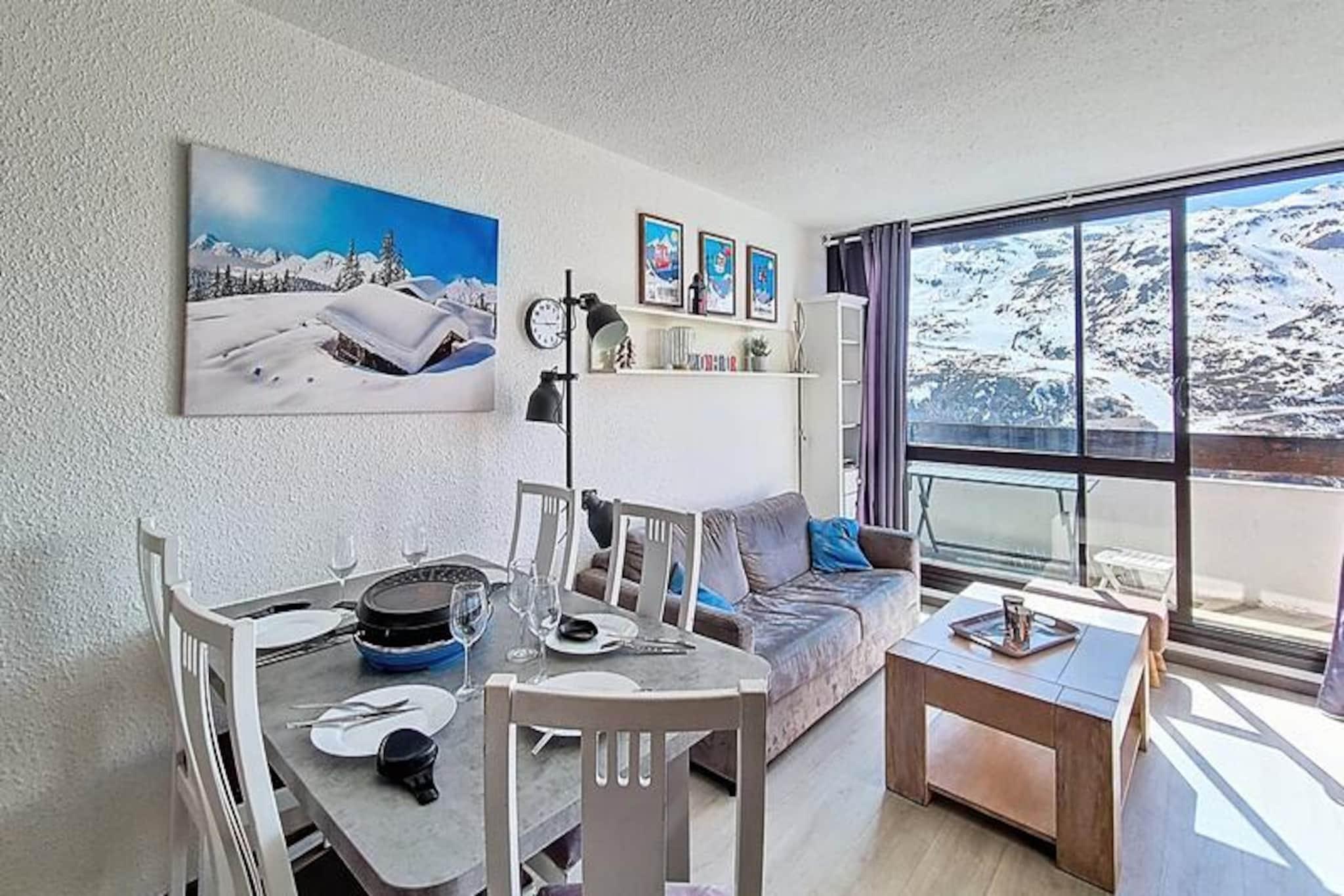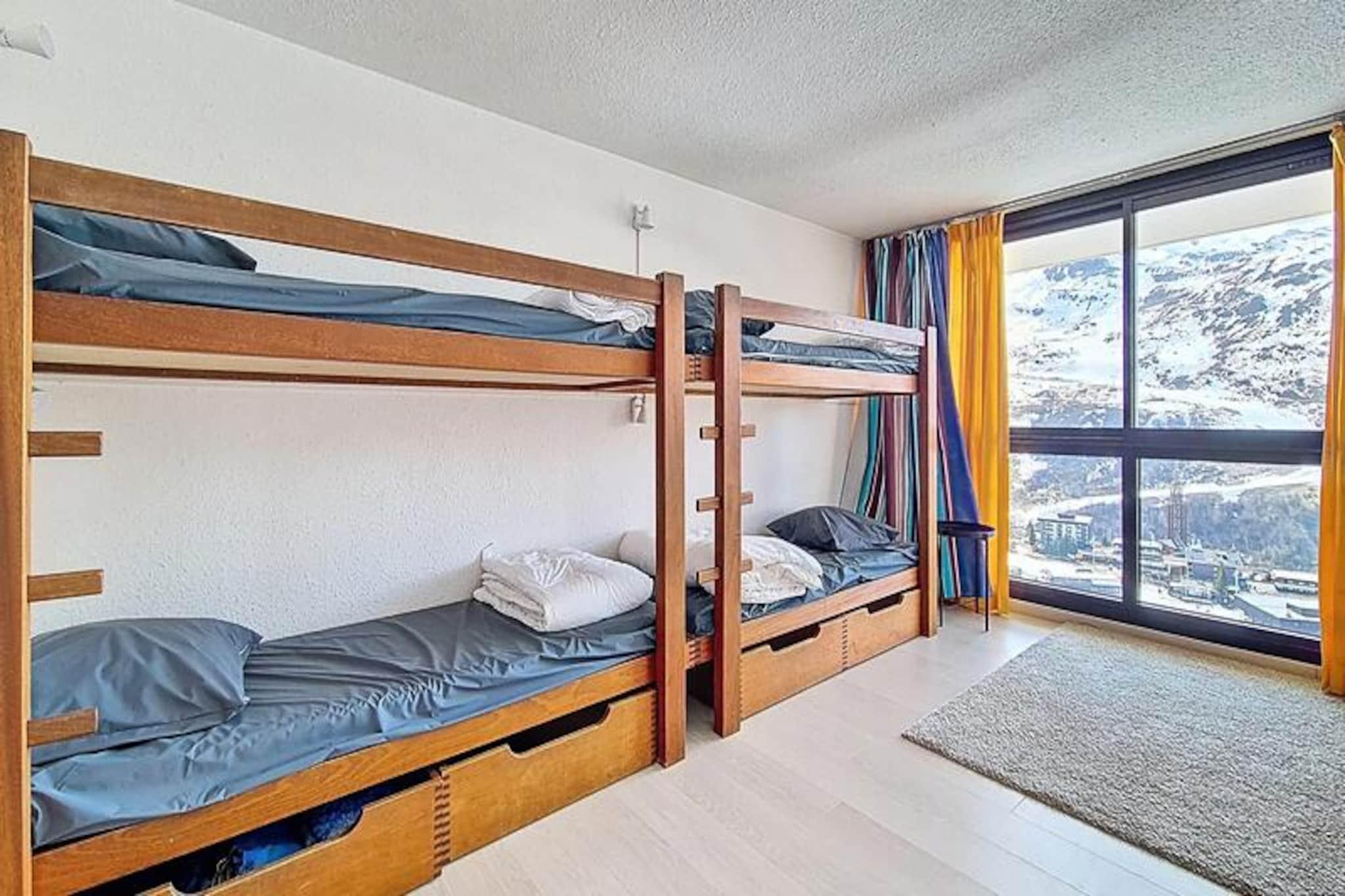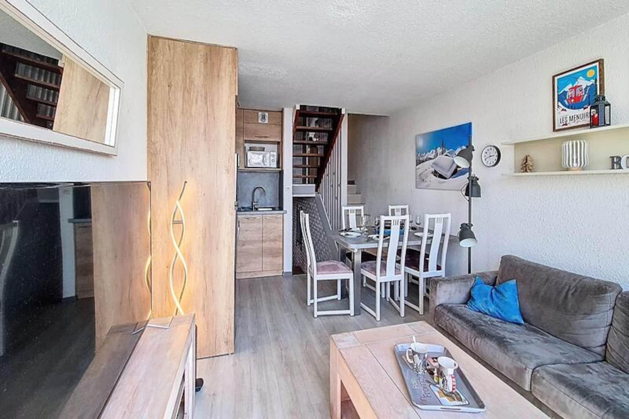 Højt over det pulserende Les Menuires-resort tilbyder Brelin-bygningen et unikt alpint tilflugtssted med panoramaudsigt og direkte adgang til pisterne. Beliggende over La Croisette-distriktet er denne ejendom problemfrit forbundet via offentlige elevatorer, der er tilgængelige døgnet rundt, hvilket sikrer ubesværet adgang til landsbyens hjerte. Forestil dig at vågne op til gyldent sollys, der strømmer ind gennem din sydvestvendte balkon, hvor betagende bjergudsigter sætter tonen for en dag med eventyr eller afslapning. Denne triplex-lejlighed er et paradis for familier og grupper, der søger komfort og bekvemmelighed i de franske alper. \n\nLejligheden er på 53 m² og har plads til op til otte gæster fordelt på tre gennemtænkt designede etager. Stuen inviterer dig til at slappe af med en hyggelig sofa og tv, mens to soveværelser tilbyder alsidige sovemuligheder, herunder en dobbeltseng og to sæt køjesenge. Det fuldt udstyrede køkken er en kulinarisk entusiasts drøm med moderne apparater som opvaskemaskine, vaskemaskine/tørretumbler, ovn og espressomaskine, sammen med traditionelle alpine detaljer som en raclettegrill og et fondue-sæt. To separate toiletter og et badeværelse med bruser sikrer privatliv og praktisk anvendelighed for alle gæster. \n\nBrelin-bygningen kan prale af ski-in/ski-out-adgang og skibokse i stueetagen, hvilket gør den til et perfekt valg for vintersportsentusiaster. Faciliteterne på stedet inkluderer en shoppingarkade med skiliftbilletkontorer og bekvem parkering ved Nant Benoit-liften, der ligger kun få skridt væk. Uanset om du udforsker pisterne eller nyder den livlige atmosfære på La Croisette, er alt hvad du behøver inden for rækkevidde. \n\nMed sin exceptionelle beliggenhed, fantastiske udsigt og gennemtænkte faciliteter lover denne lejlighed et uforglemmeligt ophold i hjertet af Les Trois Vallées. Uanset om du er her for at stå på ski, vandre eller blot nyde den alpine charme, er dette din indgang til en virkelig mindeværdig bjergflugt.