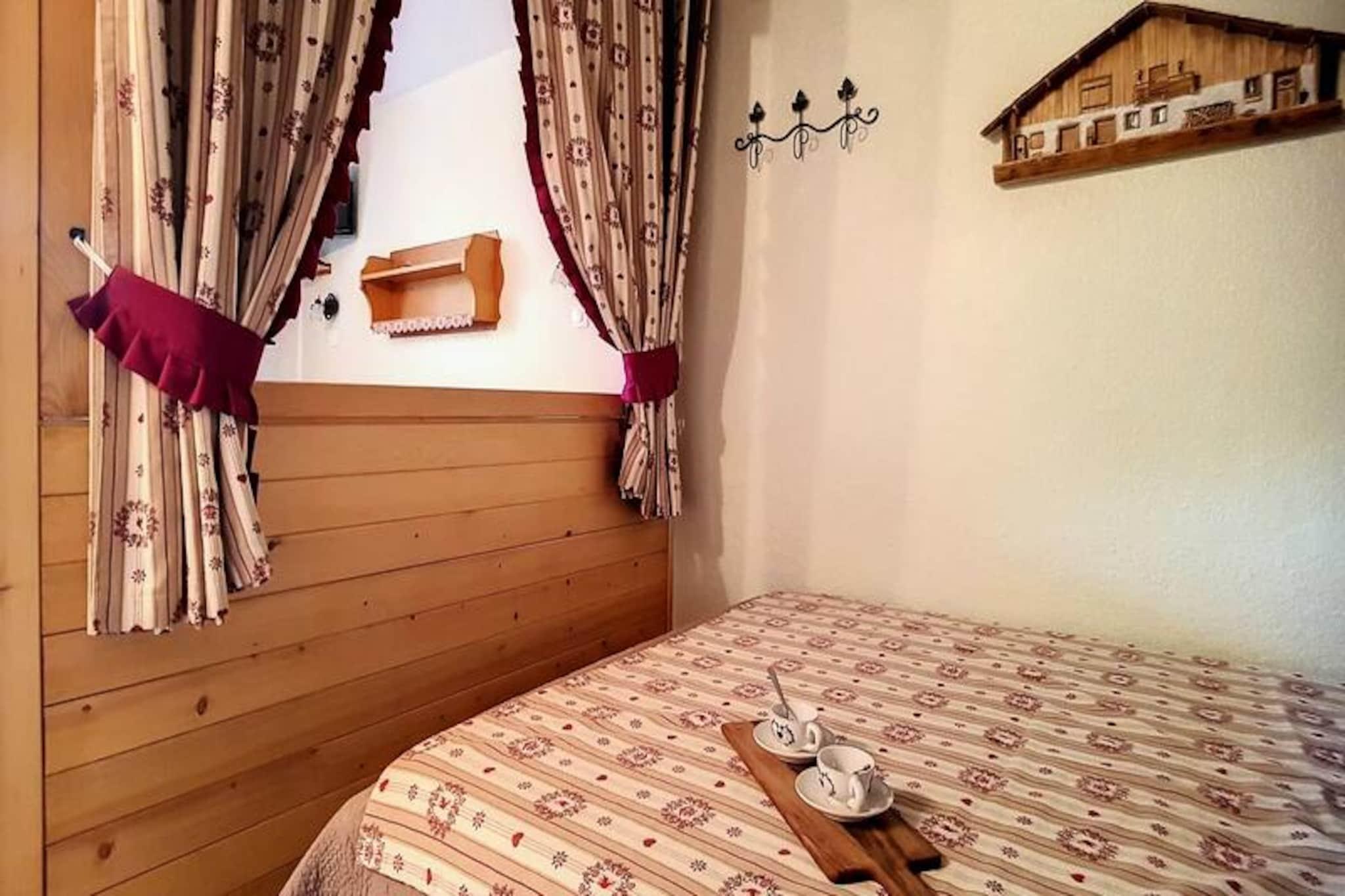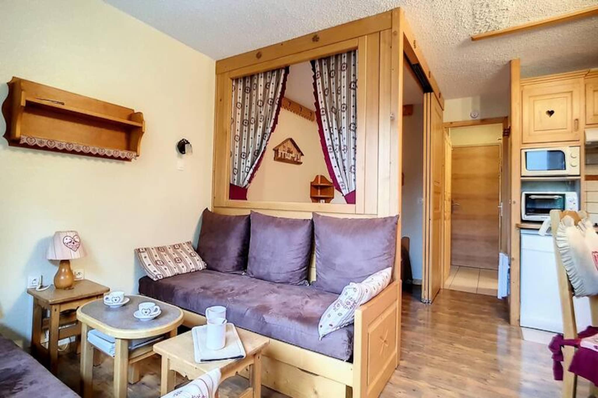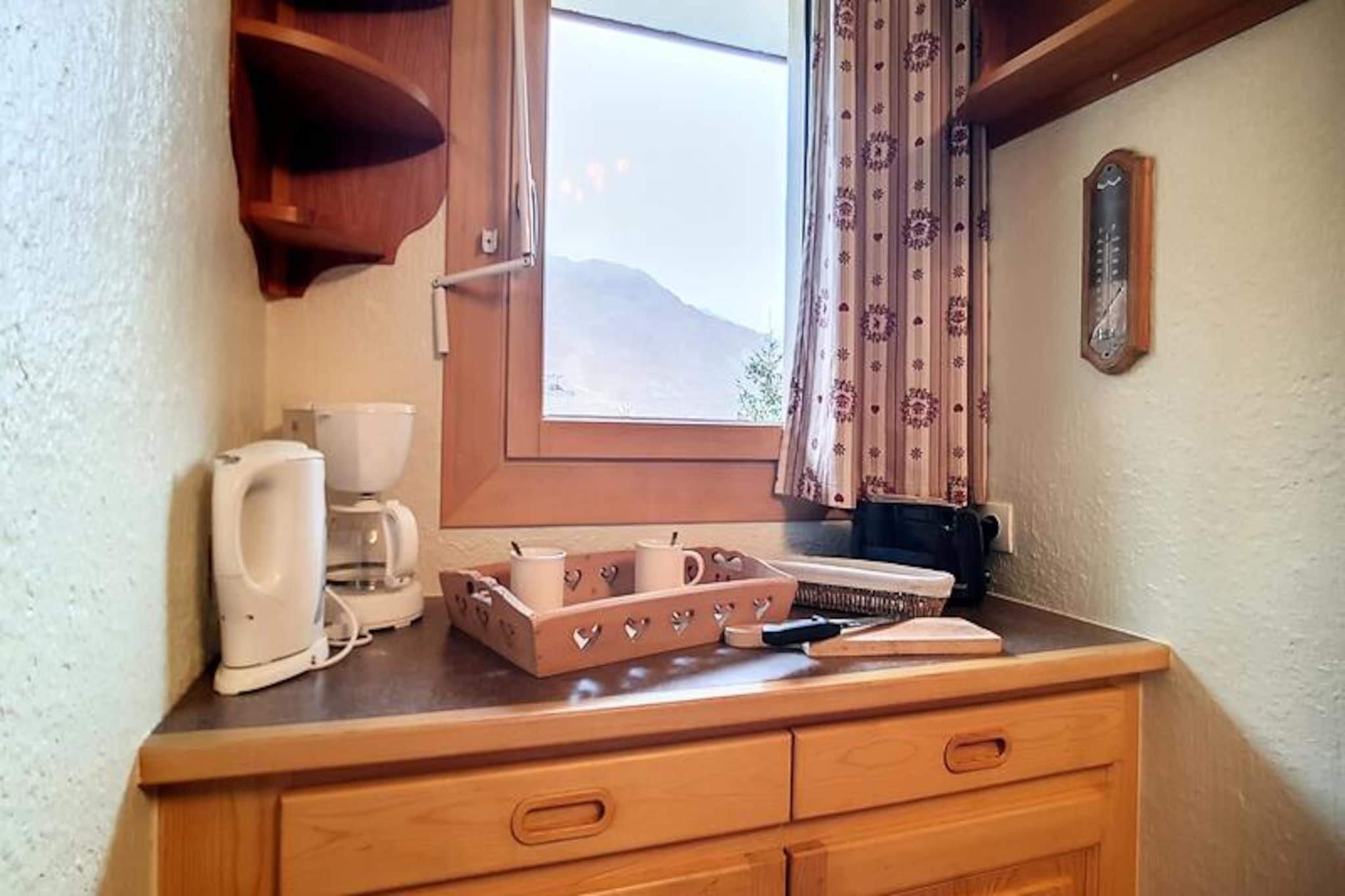 Højt over det charmerende Reberty 1850-distrikt tilbyder dette hyggelige alpine tilflugtssted en uovertruffen ski-in/ski-out-oplevelse, perfekt for dem, der er ivrige efter at fordybe sig i Les Menuires snemagi. Fra din sydvendte balkon på 4. sal kan du nyde den friske bjergluft og den betagende udsigt, mens du planlægger dit næste eventyr på pisterne. Her føles hvert øjeblik som et postkort, der kommer til live. \n\nLejligheden, der er omhyggeligt designet til op til fem gæster, kombinerer komfort og funktionalitet i sin 30 m² store planløsning. Stuen har to indbydende enkeltsofaer og et tv, hvilket skaber et perfekt sted at slappe af efter en dag på ski. En skydedør adskiller soveværelset i hytten med en hyggelig dobbeltseng, mens en sovealkove med køjesenge tilføjer et strejf af alpin charme. Det fuldt udstyrede køkken med keramiske kogeplader, miniovn, mikrobølgeovn, køleskab og mere sikrer, at du har alt, hvad du behøver for at tilberede solide måltider. Moderne bekvemmeligheder som opvaskemaskine og kaffemaskine gør dit ophold endnu mere behageligt. Lejligheden har også et badeværelse med bruser og et separat toilet for ekstra bekvemmelighed.\n\nBeliggende i Boedette A-residensen, har du sikker adgang via et nøglekort og en elevator. I nærheden finder du små butikker og restauranter, der opfylder alle dine behov, mens gratis shuttlebusser forbinder dig til det livlige Croisette-centrum. Bruyères-distriktet ligger kun en kort gåtur væk og er tilgængeligt via en gangbro og offentlig elevator.\n\nUanset om du er her for at slentre gennem uberørte pister, udforske den pulserende lokale kultur eller blot slappe af i den rolige alpine atmosfære, er denne lejlighed din port til uforglemmelige minder i hjertet af de franske alper.
