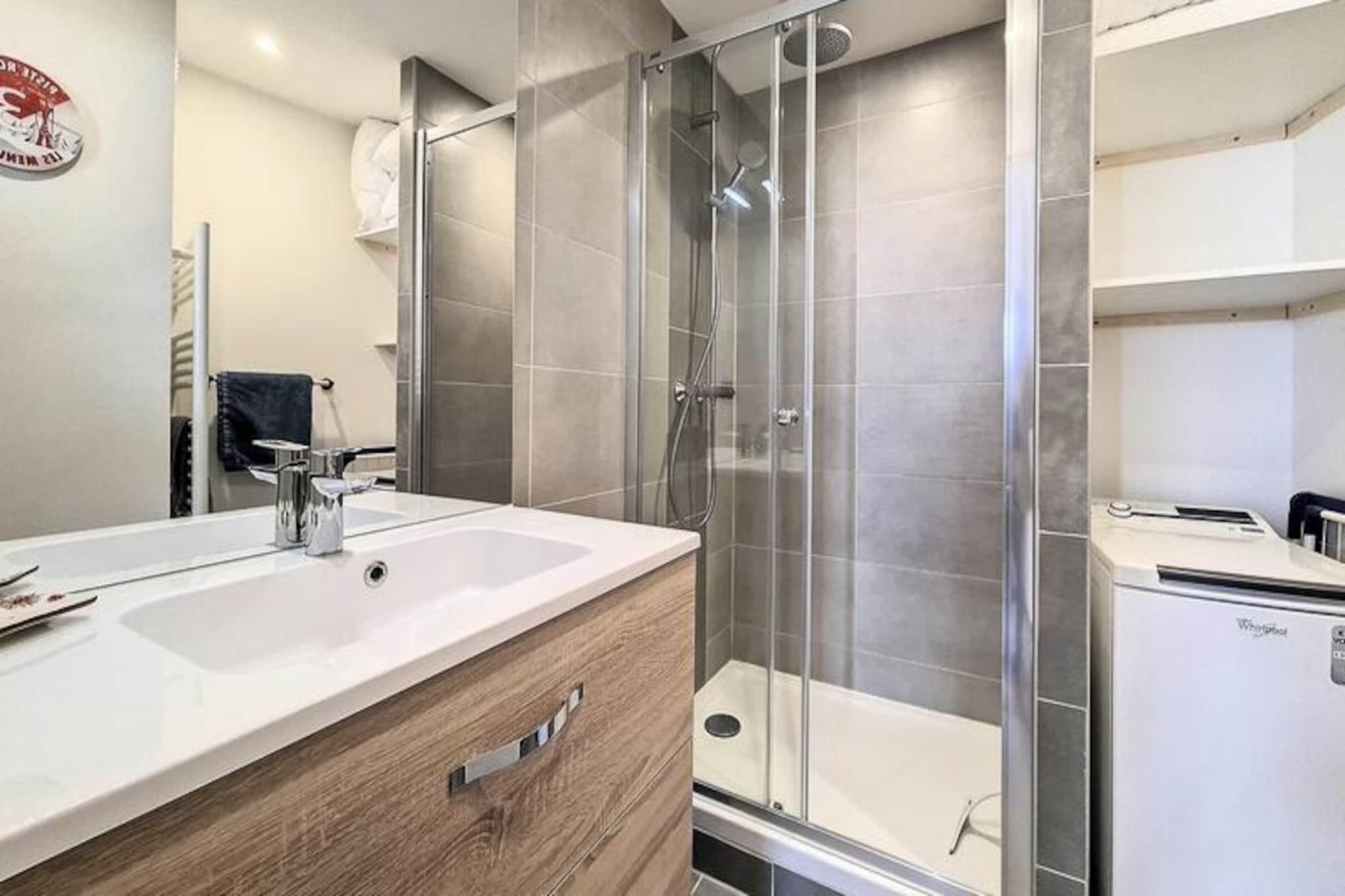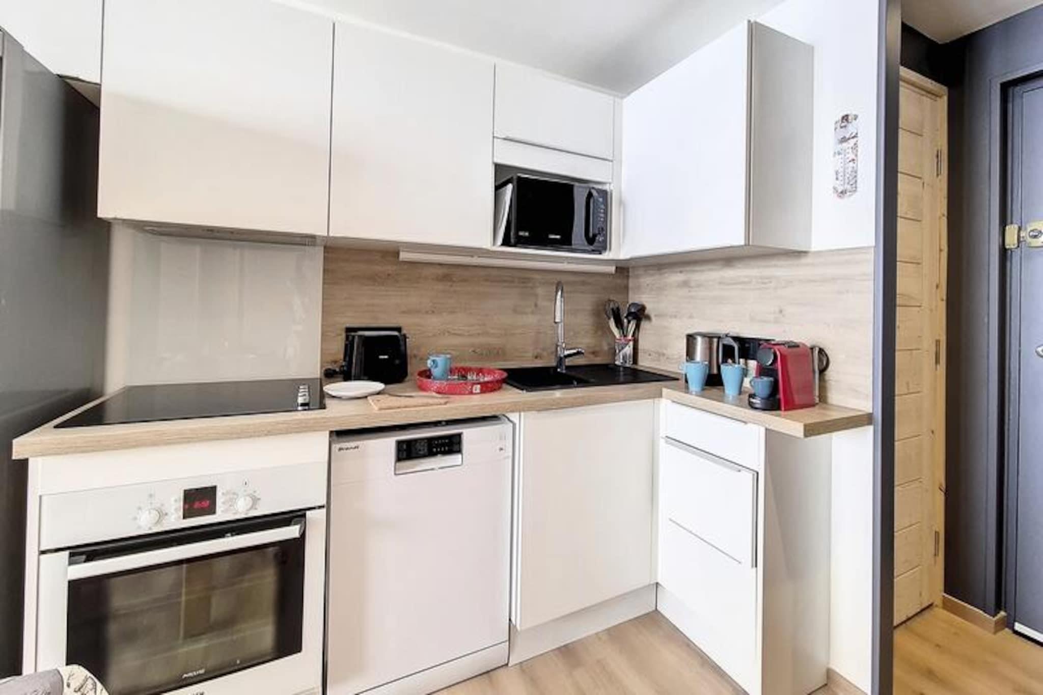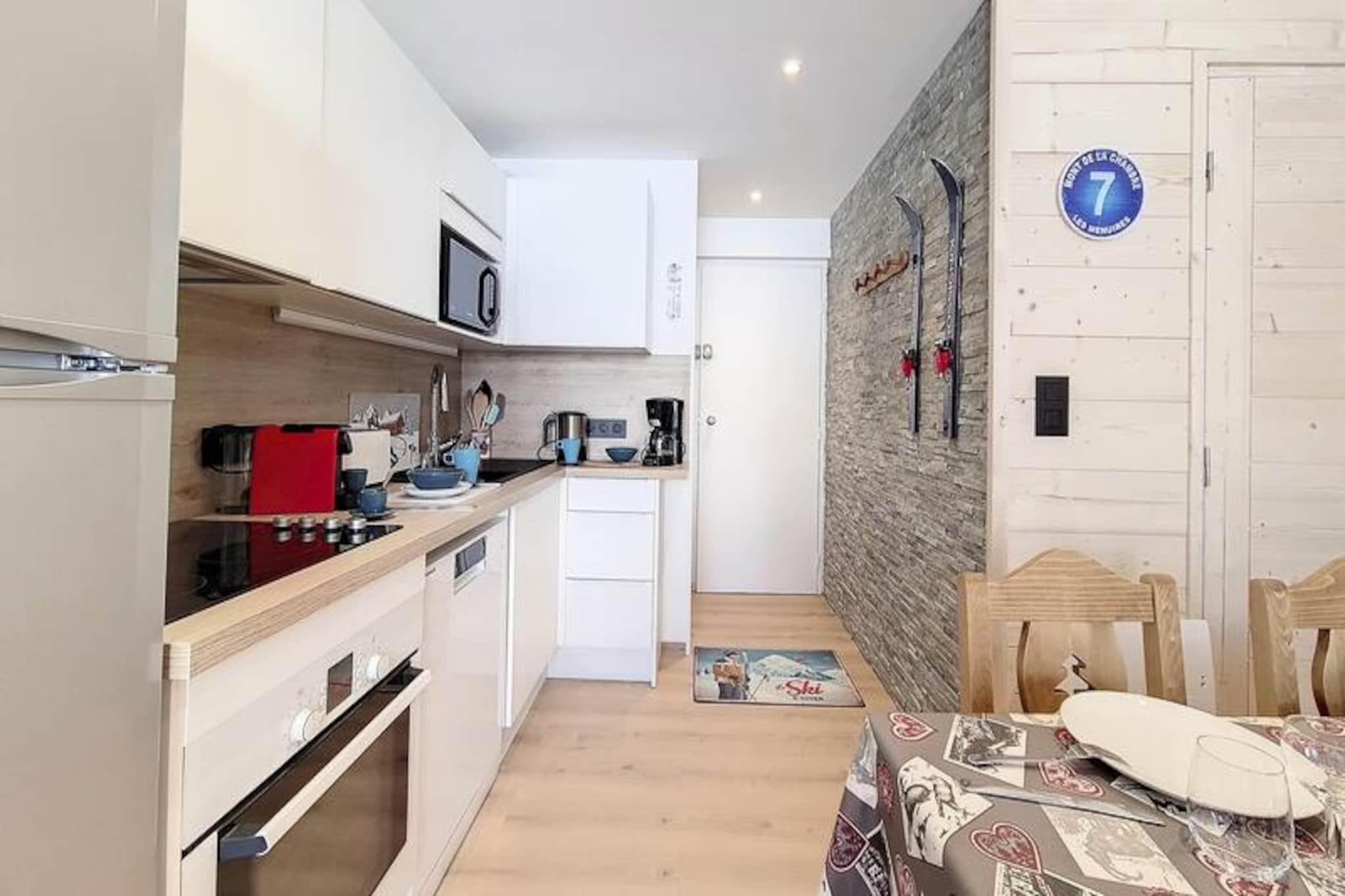 Højt over de maleriske skråninger i Reberty 1850 tilbyder dette charmerende alpine tilflugtssted en perfekt blanding af moderne komfort og traditionel bjergstemning. Med direkte adgang til skiløb begynder dine alpine eventyr lige uden for døren, hvilket gør det til et ideelt paradis for både sneentusiaster og naturelskere. Forestil dig at vågne op til den friske bjergluft, træde ud på din sydøstvendte balkon og nyde den fredfyldte udsigt over de omkringliggende tinder badet i morgenlys. Denne totalrenoverede toværelses lejlighed, færdiggjort i december 2022, er omhyggeligt designet til at rumme op til fire gæster. Den hyggelige stue har en enkelt sovesofa og en udtræksseng, suppleret med et 100 cm fladskærms-tv til afslappende aftener. Det moderne køkken er udstyret med alt hvad du behøver, fra en keramisk kogeplade og et stort køleskab til en Nespresso-maskine, der sikrer, at du kan tilberede solide måltider efter en dag på pisterne. Soveværelset med sine nye køjesenge fra 2023 lover afslappende nætter, mens badeværelset tilbyder et forfriskende brusebad, en vaskemaskine og et håndklædetørrer for ekstra bekvemmelighed. Lejligheden, der ligger på 4. sal, inkluderer også en overdækket parkeringsplads med en ladestation til elbiler, hvilket gør den til et praktisk valg for miljøbevidste rejsende. Selve boligen kan prale af en elevator, et sikkert adgangssystem og en concierge, hvilket sikrer et problemfrit og behageligt ophold. Gratis Wi-Fi er tilgængelig i lobbyen, mens betalt Wi-Fi i lejligheden holder dig forbundet. Beliggende i nærheden af ??charmerende butikker og restauranter, og med nem adgang til Croisette-området via gratis shuttlebusser eller en kort gåtur til Bruyères-distriktet, er denne ejendom perfekt placeret til at udforske de pulserende omgivelser. Uanset om du er her for spændingen ved pisterne eller roen i bjergene, lover denne alpine perle en uforglemmelig ferie.