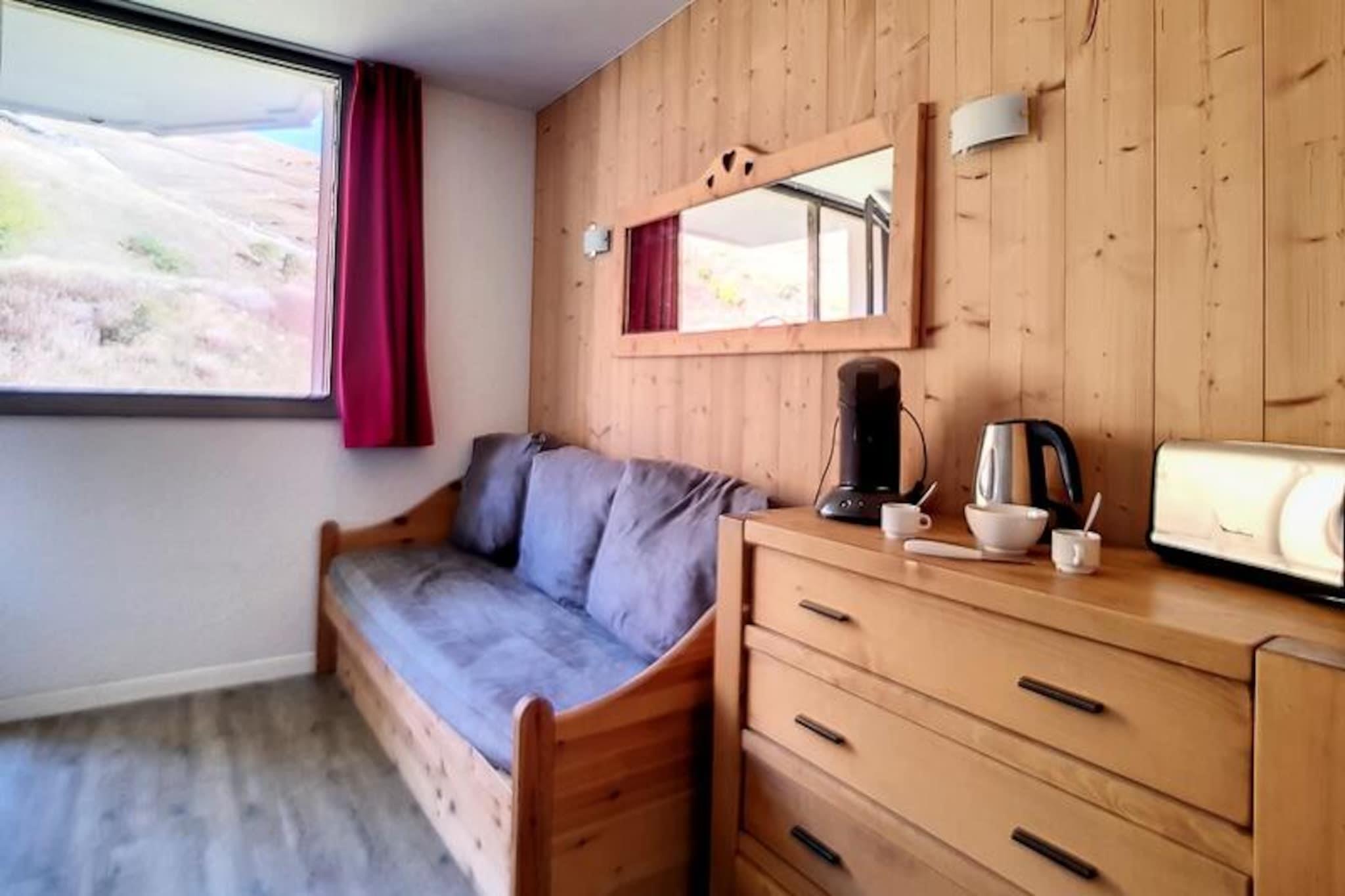 Højt over det maleriske Reberty 1850-distrikt inviterer denne charmerende studiolejlighed dig til at opleve magien i de franske alper. Vågn op til den blide morgensol på din østvendte balkon, indånd den friske bjergluft, og forbered dig på en dag med eventyr kun 250 meter fra pisterne. Uanset om du er her for at grave dig gennem frisk puddersne eller nyde den fredfyldte skønhed på alpine stier, tilbyder dette hyggelige tilflugtssted den perfekte base for din ferie. \n\nDen 18 m² store lejlighed blev renoveret i 2014 og kombinerer moderne komfort med rustik charme. Den er designet til at rumme op til tre gæster og har en opholdsstue med en enkeltseng og en udtræksseng samt en separat sovealkove med en ekstra enkeltseng. Det fuldt udstyrede køkken har kogeplade, mikrobølgeovn, køleskab, brødrister, elkedel og Senseo-kaffemaskine, hvilket gør det nemt at tilberede solide måltider efter en dag i bjergene. Slap af i stuen med et fjernsyn eller slap af på badeværelset med badekar. Bemærk venligst, at lejligheden er røgfri, kæledyrsfri og udstyret med tæpper for ekstra komfort. \n\nMédian-residensen tilbyder gratis parkering ved foden af ??bygningen, hvilket sikrer bekvemmelighed for gæster, der ankommer i bil. I nærheden finder du butikker og en skiskole, hvilket gør det nemt at få adgang til alt, hvad du behøver til dit ophold. Der er betalt Wi-Fi tilgængelig, afhængigt af dækning, så du kan holde dig forbundet, mens du nyder din alpine ferie. \n\nMed sin førsteklasses beliggenhed, hyggelige atmosfære og nærhed til pisterne er denne studiolejlighed et ideelt valg for par eller små familier, der søger et mindeværdigt bjergophold. Lad charmen fra Reberty 1850 og den betagende skønhed i de franske alper skabe uforglemmelige øjeblikke under dit ophold.