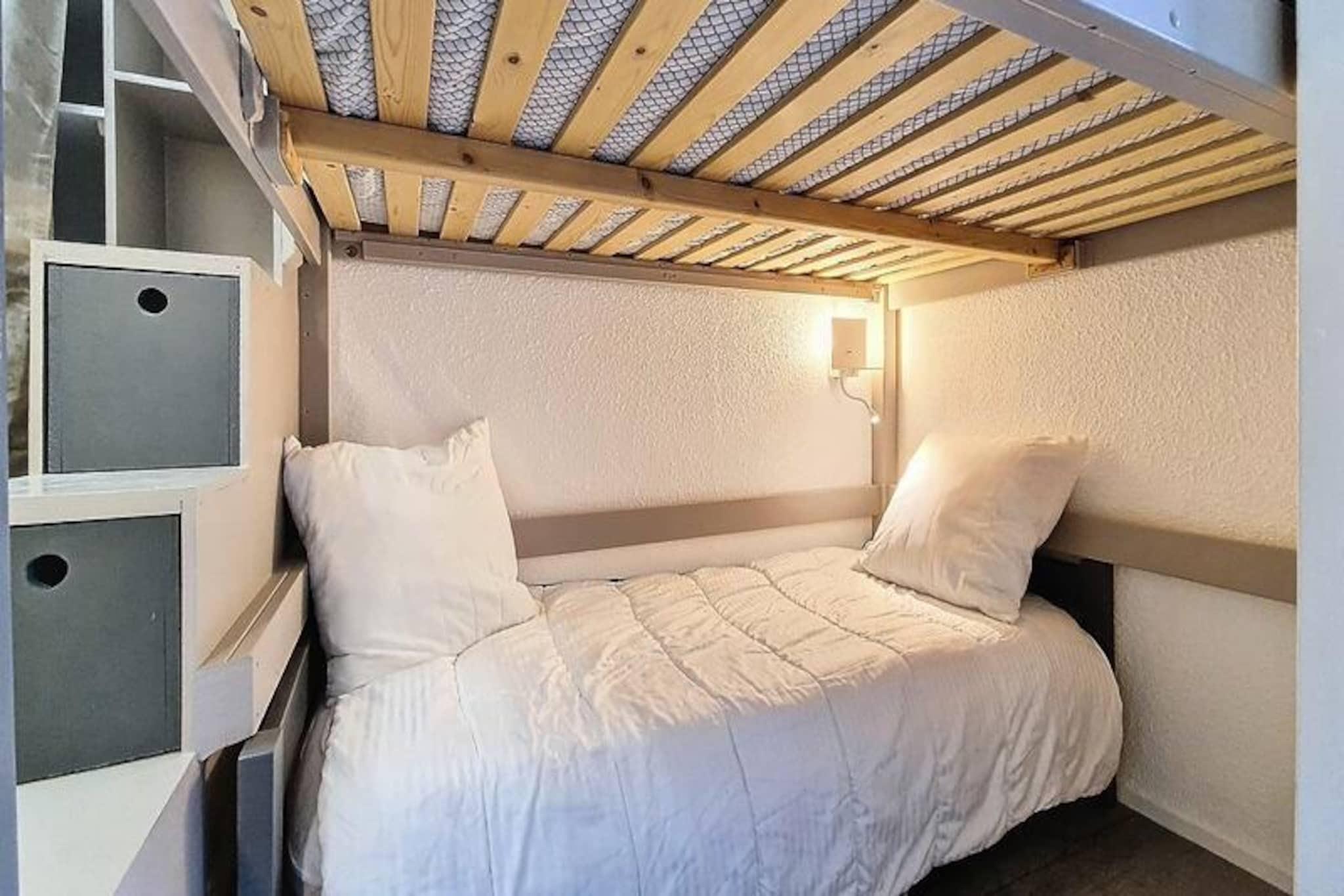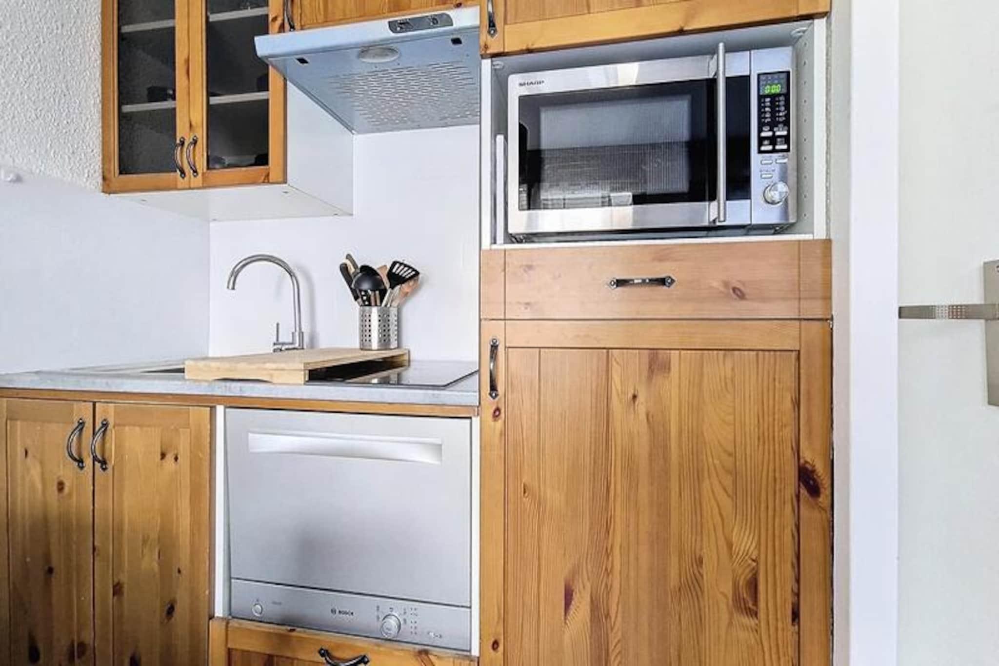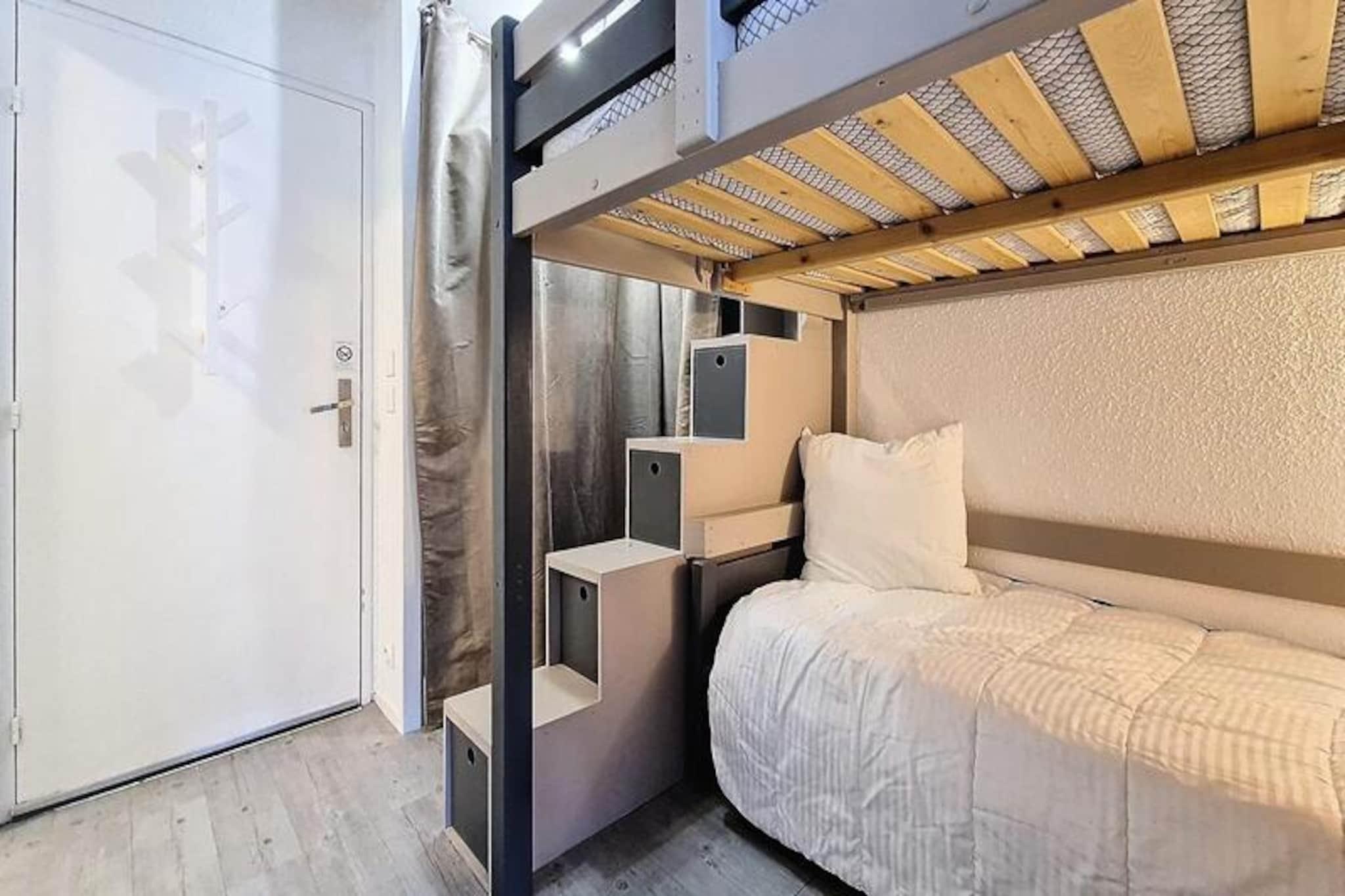 Denne charmerende studiolejlighed ligger midt i den pulserende atmosfære på Place des Bouquetins og inviterer dig til at opleve magien i de franske alper. Med pisterne kun 20 meter væk begynder dine alpine eventyr i det øjeblik, du træder udenfor. Boligen tilbyder en blanding af komfort og bekvemmelighed, hvilket gør den til et ideelt tilflugtssted for par eller små familier, der søger en hyggelig bjergferie. Forestil dig at slappe af på din vestvendte balkon, nyde den fredfyldte udsigt, mens solen går ned over bjergtoppene, eller slentre over gangbroen for at udforske det livlige Bruyères-distrikt med dets udvalg af restauranter, butikker og underholdningsmuligheder. \n\nIndenfor er den 23 m² store studiolejlighed omhyggeligt designet til at rumme op til fire gæster. Stuen har en komfortabel dobbeltsovesofa og et tv til afslappede aftener. En sovealkove, adskilt af en dør, tilbyder en enkeltseng og en mezzanin-dobbeltseng, der sikrer en god nats søvn. Det veludstyrede køkken inkluderer elektriske kogeplader, mikrobølgeovn, køleskab, opvaskemaskine, brødrister og kaffemaskine, hvilket gør det nemt at tilberede måltider efter en dag på pisterne. Lejligheden kan også prale af laminatgulv, et moderne badeværelse med bruser og et separat toilet for ekstra bekvemmelighed.\n\nGentianes-residensen forbedrer dit ophold med faciliteter såsom elevator, sikkert adgangssystem, concierge-service og gratis Wi-Fi (afhængigt af dækning). Familier vil sætte pris på den nærliggende skiskole, kælkebane og legeplads, mens wellness-entusiaster kan forkæle sig selv med et besøg i vandlandet og spaen. Croisette-distriktet, en naturskøn 15-minutters gåtur væk, tilbyder endnu mere at udforske.\n\nUanset om du er her for at stå på ski, slappe af eller blot nyde den alpine charme, er dette studie den perfekte base for uforglemmelige minder i hjertet af de franske alper.
