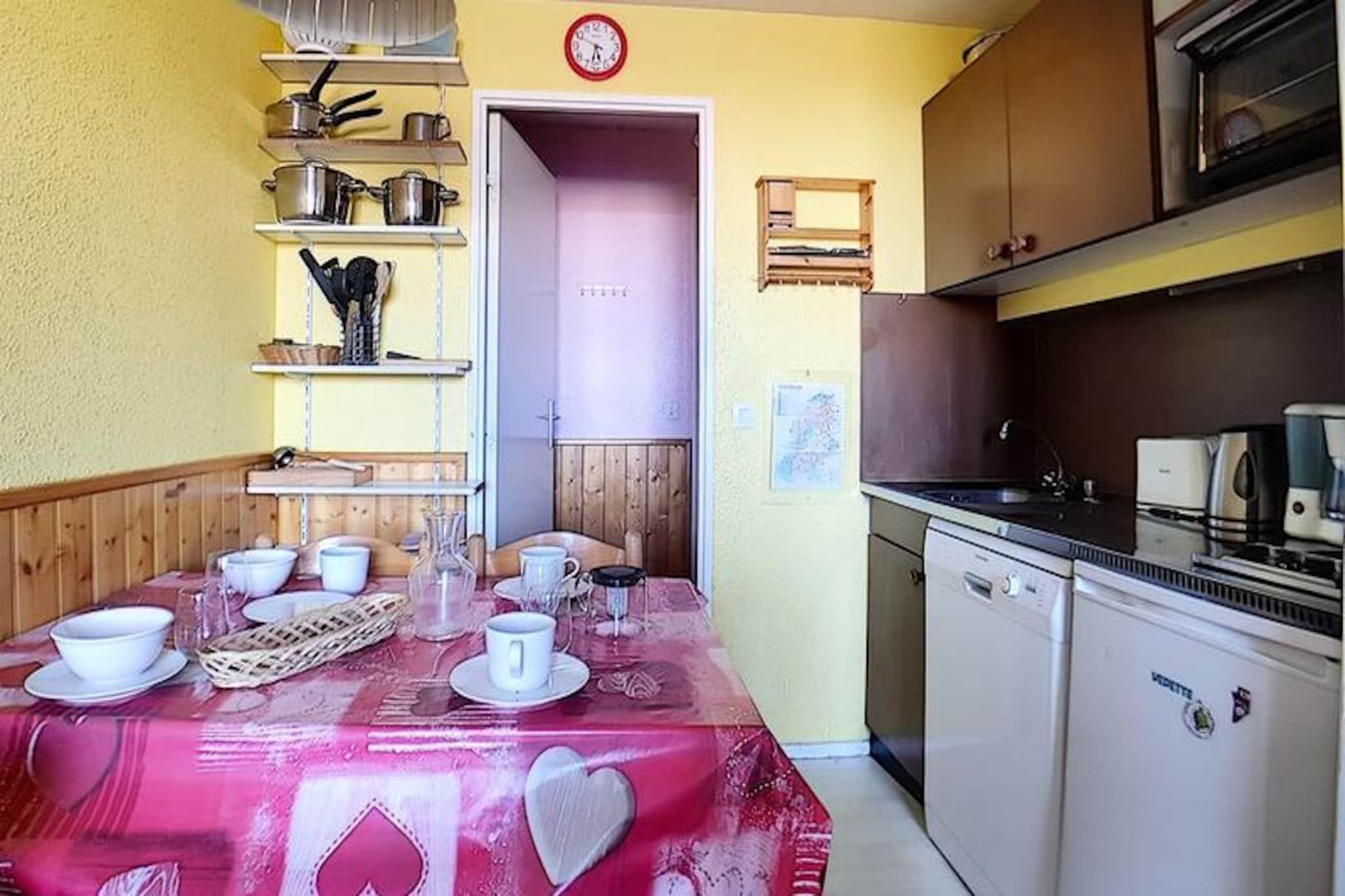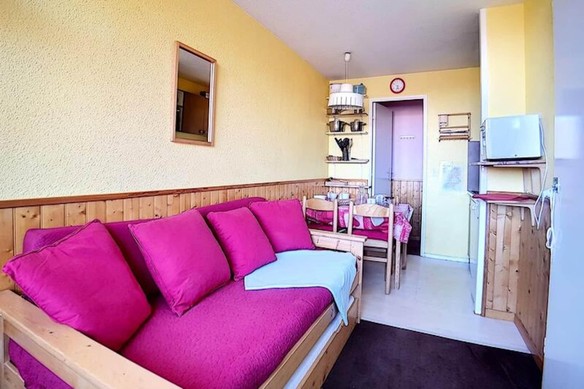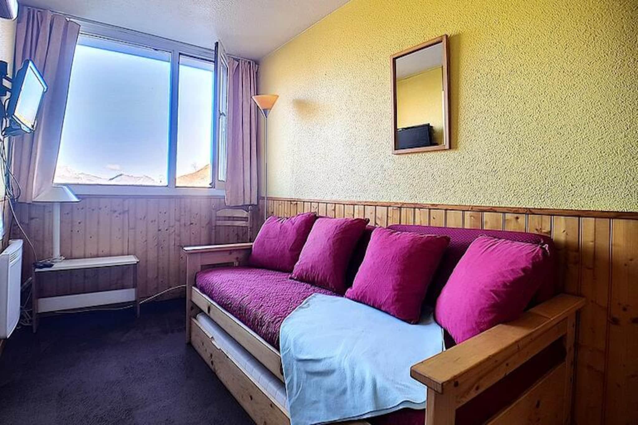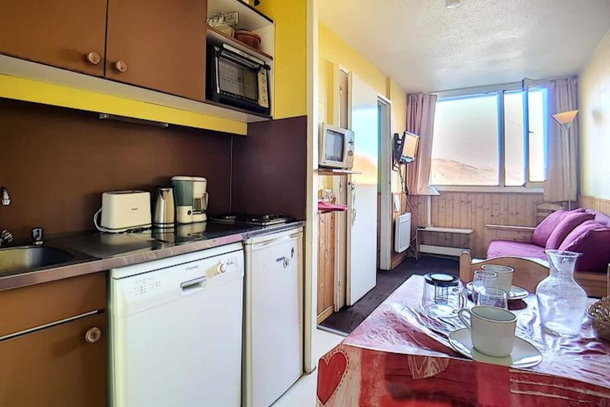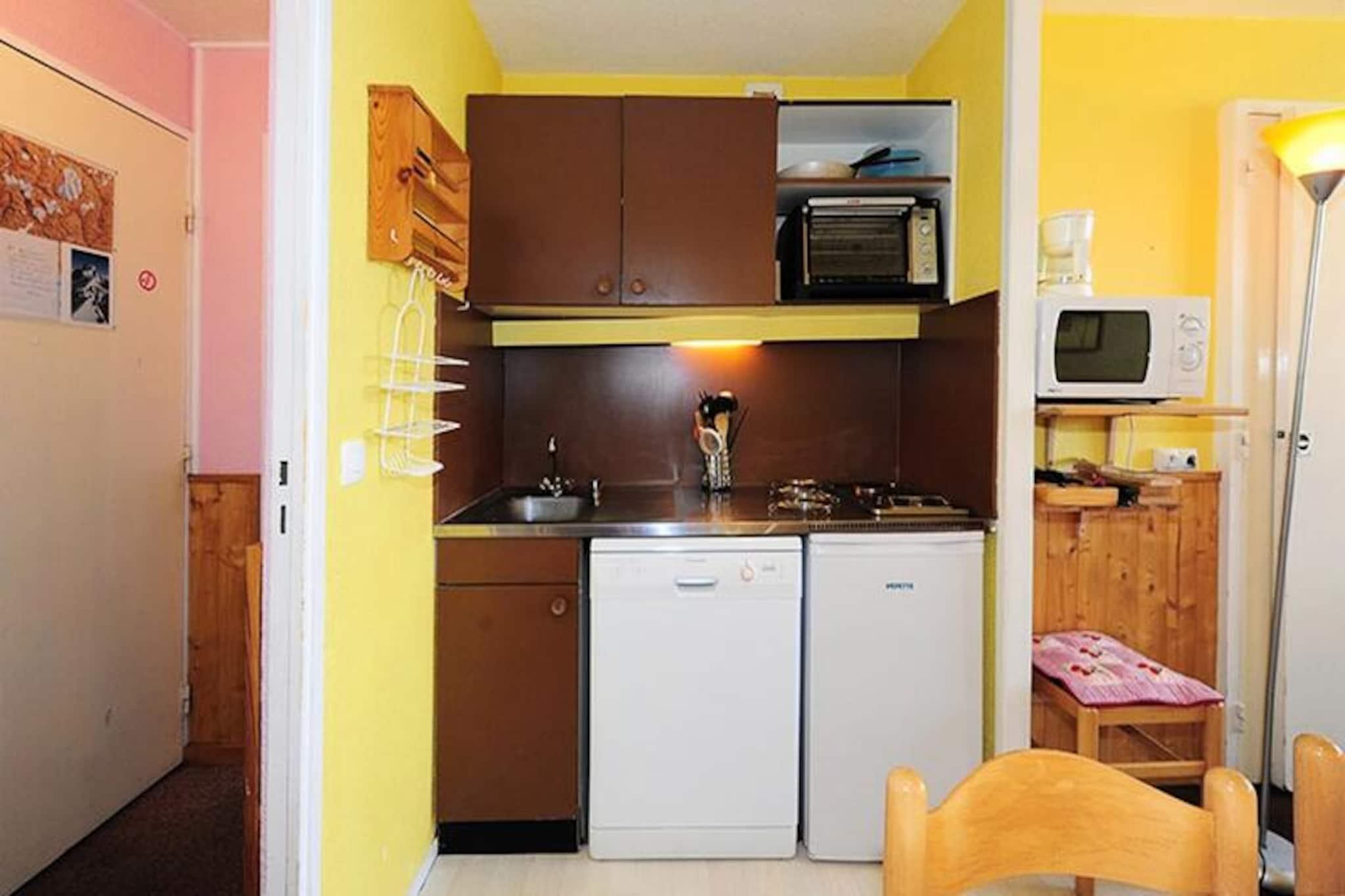 I det charmerende Reberty 1850-distrikt tilbyder denne hyggelige lejlighed et dejligt alpint tilflugtssted for dem, der søger ro og bekvemmelighed i hjertet af de franske alper. Forestil dig at vågne op til den friske bjergluft og træde ud på din private nordvestvendte balkon, hvor den fredfyldte udsigt sætter tonen for en dag med eventyr eller afslapning. Uanset om du er her for at stå på ski, vandre eller bare slappe af, er denne bolig den perfekte base for din ferie. \n\nLejligheden er designet til at rumme op til fire gæster og har en gennemtænkt planløsning med en komfortabel stue udstyret med en enkeltseng og en udtræksseng samt et separat soveværelse med en dobbeltseng. Det fuldt udstyrede køkken inviterer dig til at tilberede solide måltider efter en dag på pisterne med faciliteter såsom køleskab, ovn, mikrobølgeovn, opvaskemaskine og meget mere. Badeværelset har et badekar til et afslappende bad, mens opholdsstuen suppleres af et fjernsyn til hyggelige aftener indendørs. \n\nMédian-boligen ligger kun 250 meter fra pisterne og sikrer nem adgang til de skiløbseventyr, som Les Menuires er kendt for. I nærheden finder du butikker og en skiskole, hvilket gør det bekvemt for familier og begyndere. Gratis parkering ved foden af ??bygningen bidrager til at gøre dit ophold endnu nemmere, mens den betalte Wi-Fi sikrer, at du holder dig forbundet under hele din tur. \n\nUanset om du er tiltrukket af de sneklædte pisters charme eller bjergenes fredelige charme, kombinerer denne lejlighed komfort, praktisk anvendelighed og en uovertruffen beliggenhed for at skabe varige minder i de franske alper.