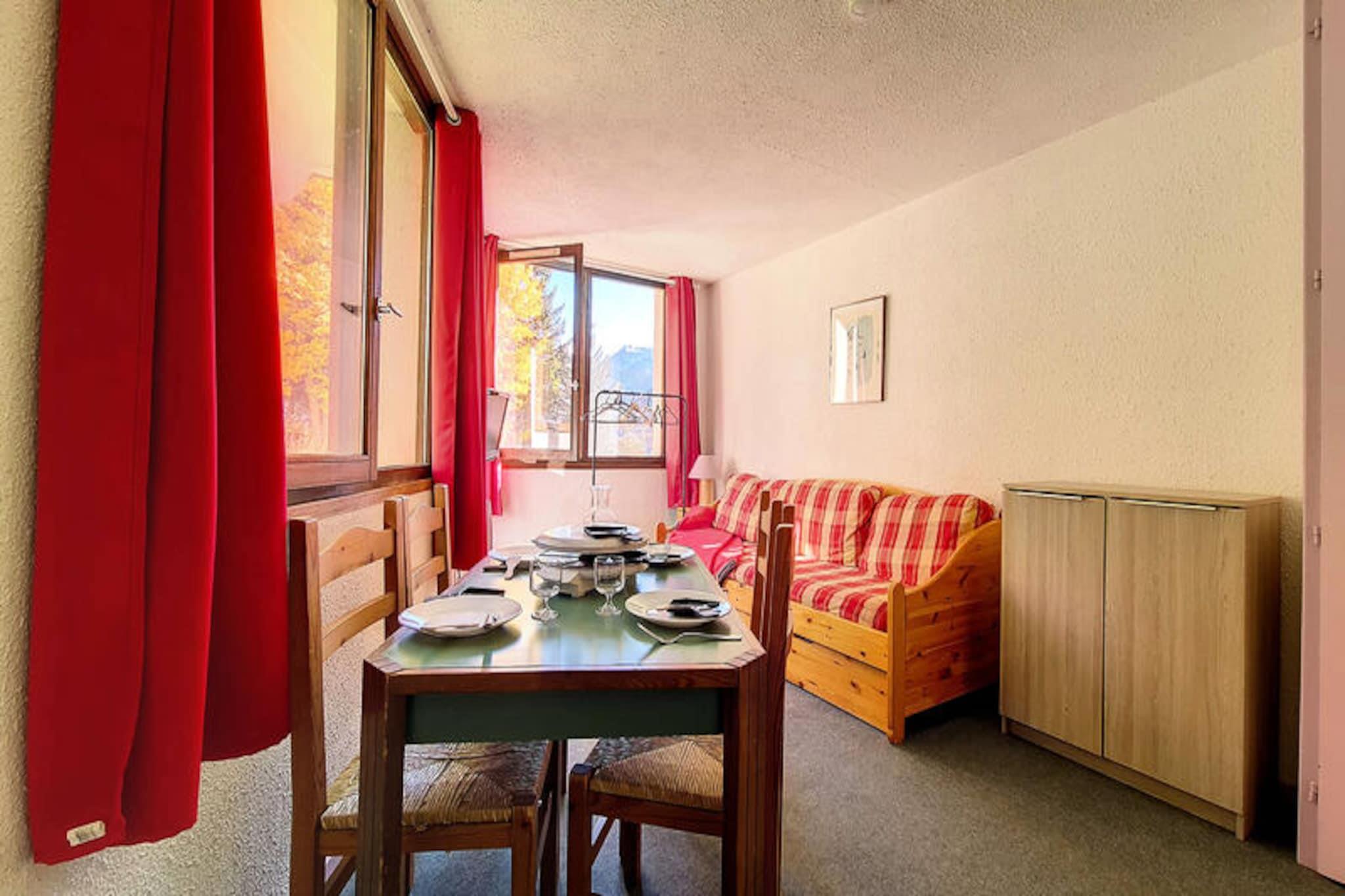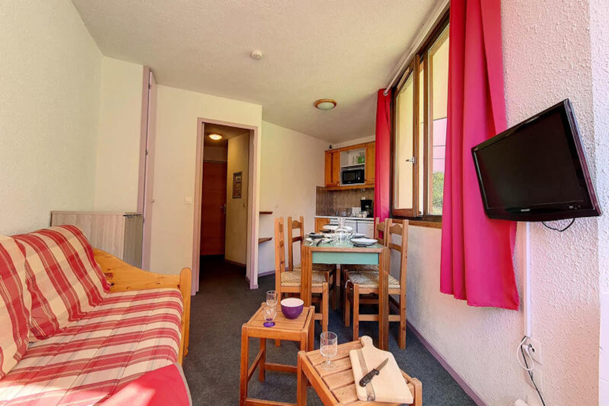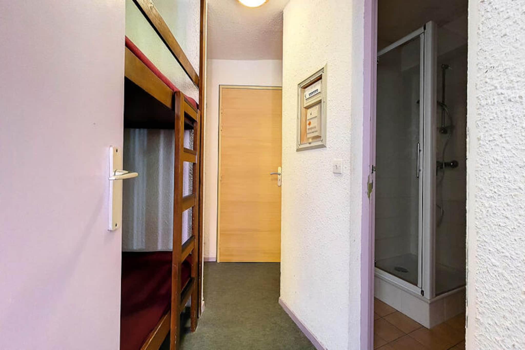 Højt over den maleriske Belleville-dal tilbyder denne charmerende studiolejlighed i Boedette D-residensen et idyllisk alpint tilflugtssted med ski-in/ski-out-adgang. Med en perfekt beliggenhed på Place des Bouquetins placerer residensen dig i hjertet af Les Menuires' pulserende vinterlandskab, hvor snedækkede tinder og spændende pister venter lige uden for din dør. Uanset om du er her for adrenalinsuset fra skiløb eller roen ved bjergudsigten, lover dette hyggelige tilflugtssted en uforglemmelig flugt. Det gennemtænkt designede 22 m² store studio har plads til op til fire gæster, hvilket gør det ideelt for par eller små familier. Opholdsstuen har en komfortabel enkelt sovesofa og en udtræksseng, mens en separat sovealkove med køjesenge sikrer privatliv og afslappende nætter. Det kompakte, men fuldt udstyrede køkken har keramisk kogeplade, mikrobølgeovn, køleskab, opvaskemaskine, kaffemaskine og elkedel, så du kan tilberede solide måltider efter en dag på pisterne. Et moderne badeværelse med bruser og separat toilet øger bekvemmeligheden, mens lejlighedens varme tæppebelagte gulve skaber en indbydende atmosfære. Gå udenfor og oplev gangbroen, der forbinder dig med det livlige Bruyères-distrikt, hvor et væld af faciliteter venter. Fra restauranter og butikker til en biograf, vandland, wellnesscenter og skiskole er alt, hvad du behøver, inden for rækkevidde. Familier vil elske kælkebanen og legepladsen, mens eventyrere kan udforske det nærliggende Croisette-distrikt, der ligger kun 15 minutters gang væk. Uanset om du søger eventyr eller afslapning, tilbyder denne studiolejlighed den perfekte base for at opleve magien i Les Menuires. Med sin uovertrufne beliggenhed, hyggelige interiør og adgang til faciliteter i verdensklasse begynder din alpine ferie her.
