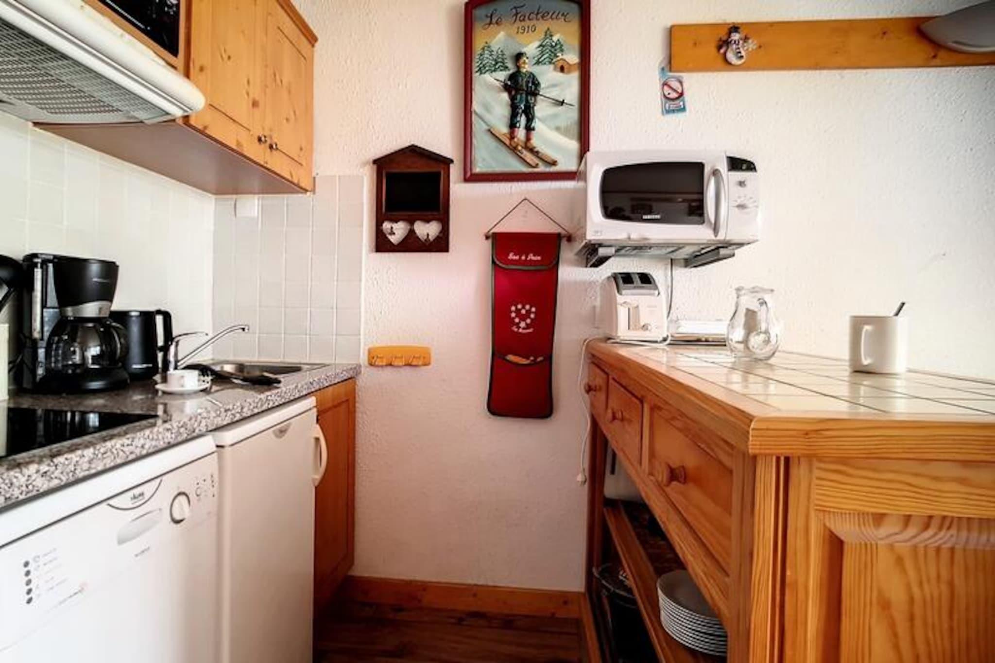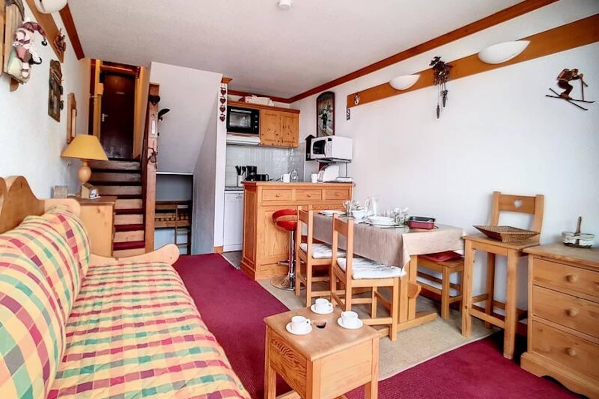 Højt over det pulserende Les Menuires-resort tilbyder Brelin-bygningen en rolig oase med betagende udsigt over det omkringliggende alpine landskab. Beliggende over La Croisette-distriktet kombinerer denne beliggenhed bekvemmelighed med ro og er tilgængelig via offentlige elevatorer, der kører døgnet rundt og forbinder dig med landsbyens hjerte. Uanset om du er her for vintersport eller sommereventyr, inviterer den sydvestvendte balkon i dette charmerende duplex-studio dig til at nyde solskinnet og beundre de majestætiske tinder. Dette hyggelige tilflugtssted er perfekt til par eller små familier og lover uforglemmelige bjergøjeblikke. \n\nDen 24 m² store studiolejlighed er omhyggeligt designet til at rumme op til fire gæster. Stuen har en enkelt sovesofa og en udtræksseng, mens kabinen under trappen har to enkeltkøjesenge, ideel til børn over seks år. Et moderne badeværelse med bruser og separat toilet sikrer komfort, mens det fuldt udstyrede køkken har keramiske kogeplader, miniovn, mikrobølgeovn, køleskab, opvaskemaskine, brødrister, kaffemaskine og elkedel - alt hvad du behøver for at tilberede solide måltider efter en dag med eventyr. Lejligheden er røgfri, har tæpper og tæpper for ekstra hygge. Der er betalt Wi-Fi, afhængigt af netværksdækning. \n\nSelve Brelin-bygningen huser butikker, skiliftbilletkontorer og skibokse, hvilket gør det utroligt bekvemt for gæsterne. Der er gratis parkering ved Côte Brune-liften, som ligger for foden af ??bygningen. Med sin førsteklasses beliggenhed har du nem adgang til pisterne og nærliggende attraktioner, hvilket sikrer, at hvert øjeblik af dit ophold er fyldt med spænding og lethed. \n\nUanset om du jagter puddersne på pisterne eller udforsker de naturskønne stier om sommeren, er denne duplex-studiolejlighed din port til Les Menuires vidundere. Lad den alpine charme og den enestående udsigt inspirere dit næste eventyr i de franske alper.