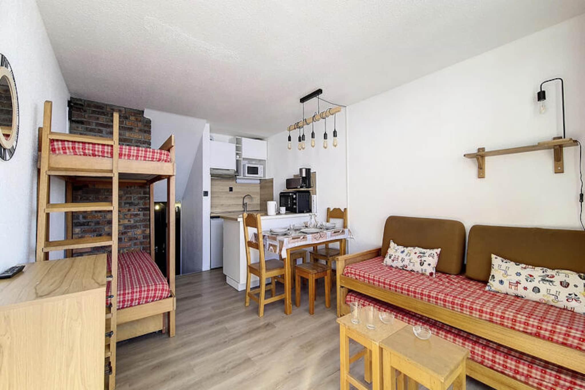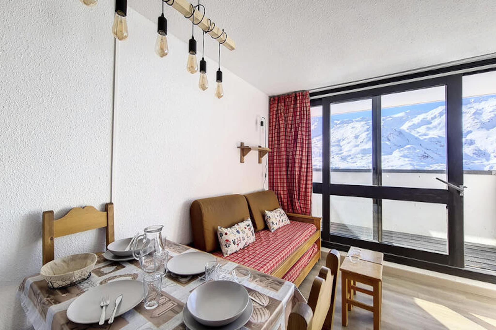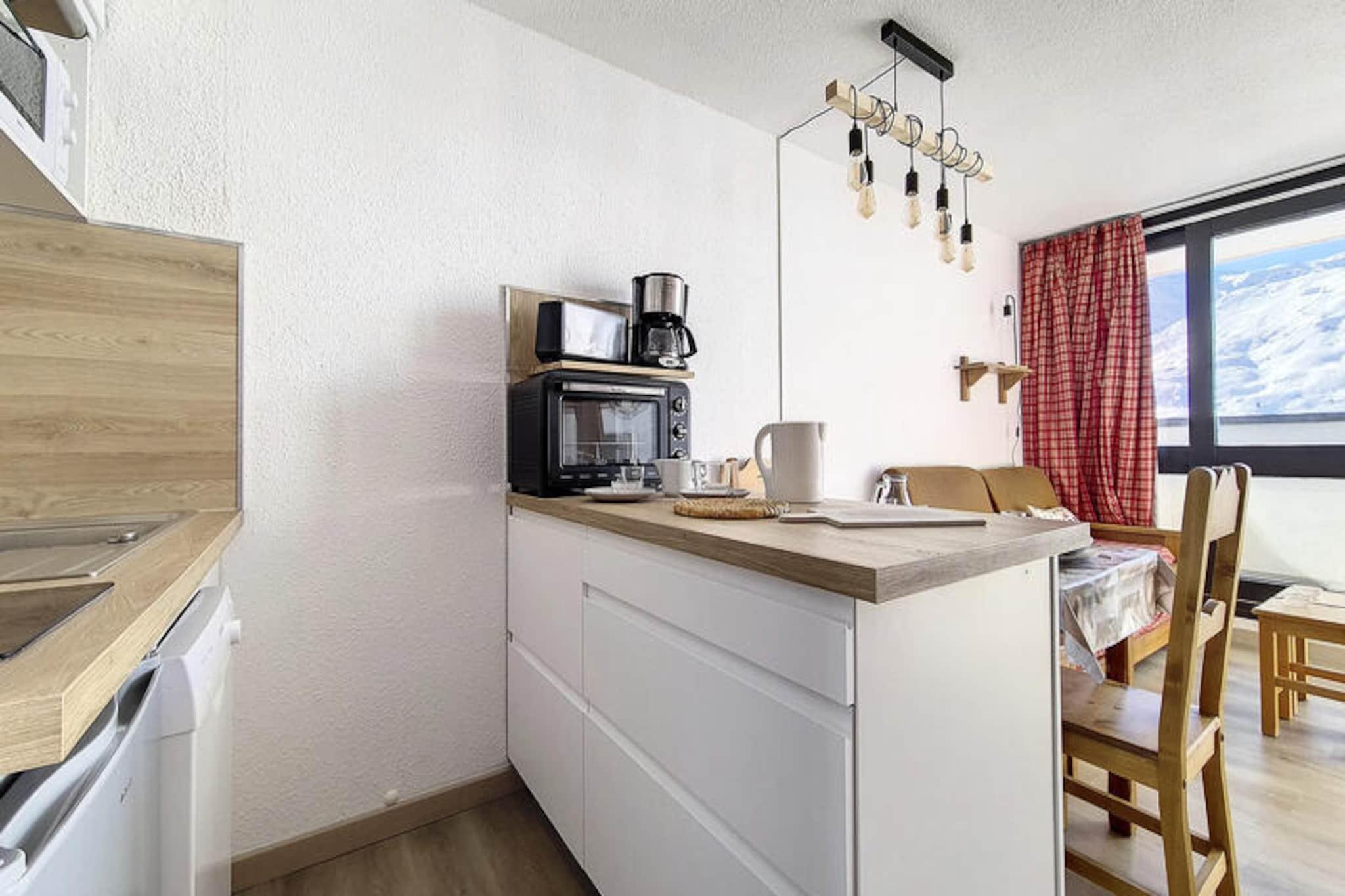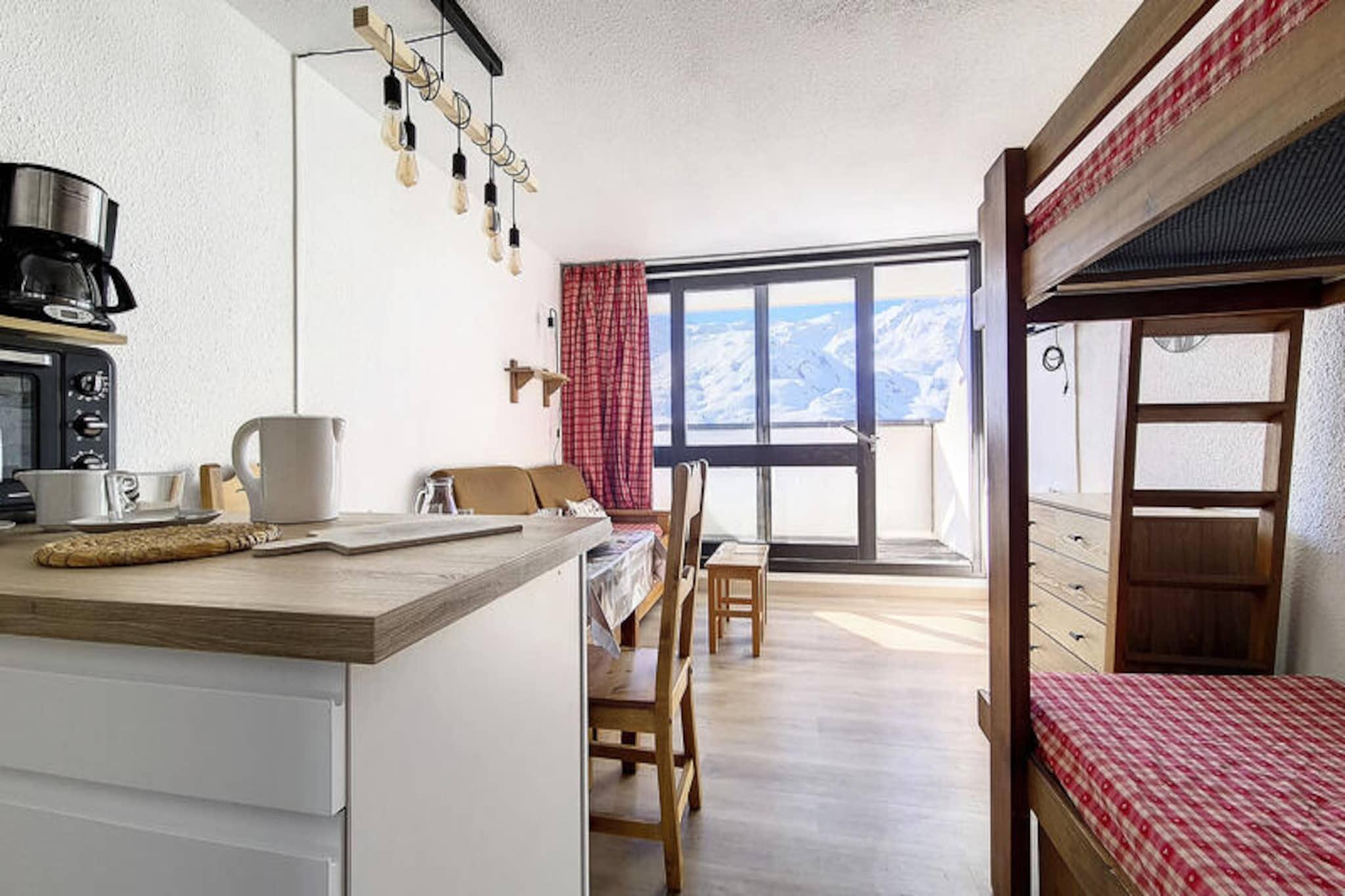 Højt over det travle Les Menuires-resort tilbyder Brelin-bygningen et unikt udsigtspunkt og direkte adgang til pisterne. Beliggende over La Croisette-distriktet er denne bekvemme beliggenhed forbundet med offentlige elevatorer, der er i drift døgnet rundt, hvilket sikrer nem bevægelse mellem hjertet af resortet og dit fredelige tilflugtssted. Fra den sydvestvendte balkon i denne hyggelige studiolejlighed kan du nyde den alpine charme og uforstyrret udsigt over de omkringliggende tinder badet i sollys hele dagen. Uanset om du er her for vintersport eller sommervandreture, er dette den perfekte base for dine bjergeventyr. \n\nDet 24 m² store studio er designet til op til fire gæster og er omhyggeligt indrettet for at maksimere komfort og funktionalitet. Stuen har to enkeltsenge, en enkelt sovesofa og en udtræksseng, hvilket gør den ideel til familier eller små grupper. Det kompakte køkken er udstyret med alt det nødvendige, herunder elektriske kogeplader, køleskab, miniovn, mikrobølgeovn, opvaskemaskine og små apparater som kaffemaskine, brødrister og elkedel. Efter en dag på pisterne kan du slappe af med et varmt brusebad på badeværelset, som har en hævet kant, og nyde varmen i den hyggelige opholdsstue udstyret med et tv. \n\nSelve Brelin-bygningen huser butikker, skiliftbilletkontorer og skibokse for ekstra bekvemmelighed. Der er gratis parkering ved Côte Brune-liften, der ligger for foden af ??bygningen, hvilket gør din ankomst og afrejse stressfri. Med betalt Wi-Fi-adgang og tæpper har du alt, hvad du behøver for et behageligt ophold. \n\nUanset om du er tiltrukket af spændingen ved skiløb, roen i alpine landskaber eller den pulserende atmosfære i Les Menuires, kombinerer denne studiolejlighed praktisk sans og charme for en uforglemmelig bjergferie.