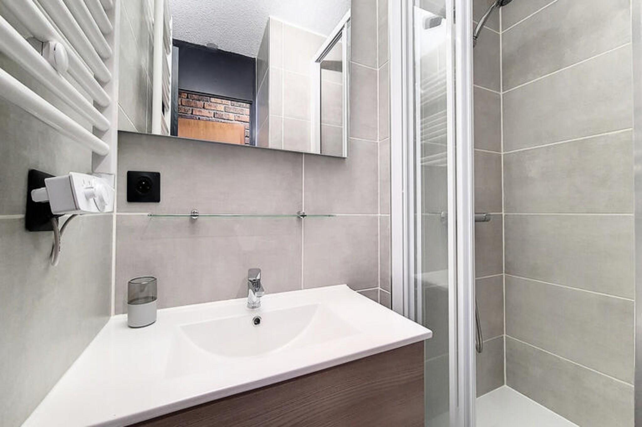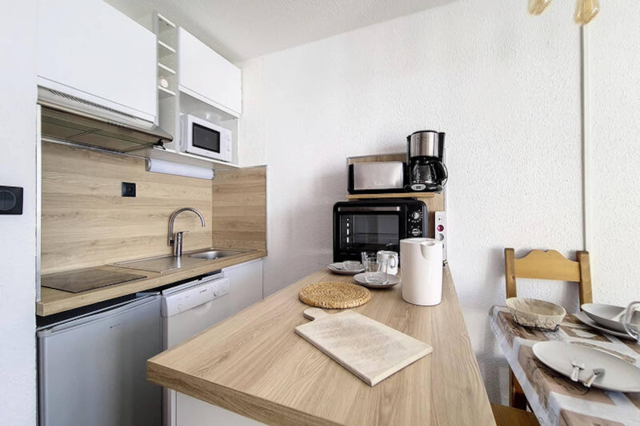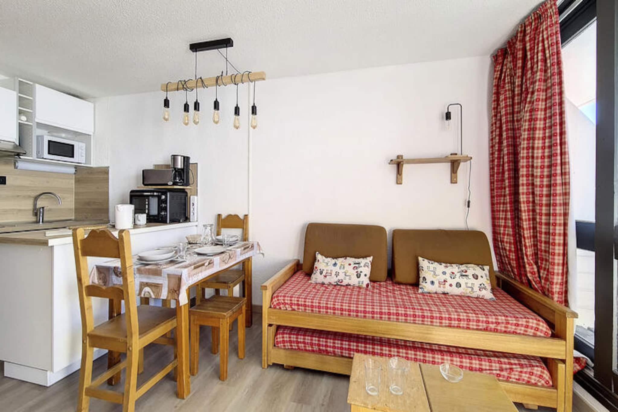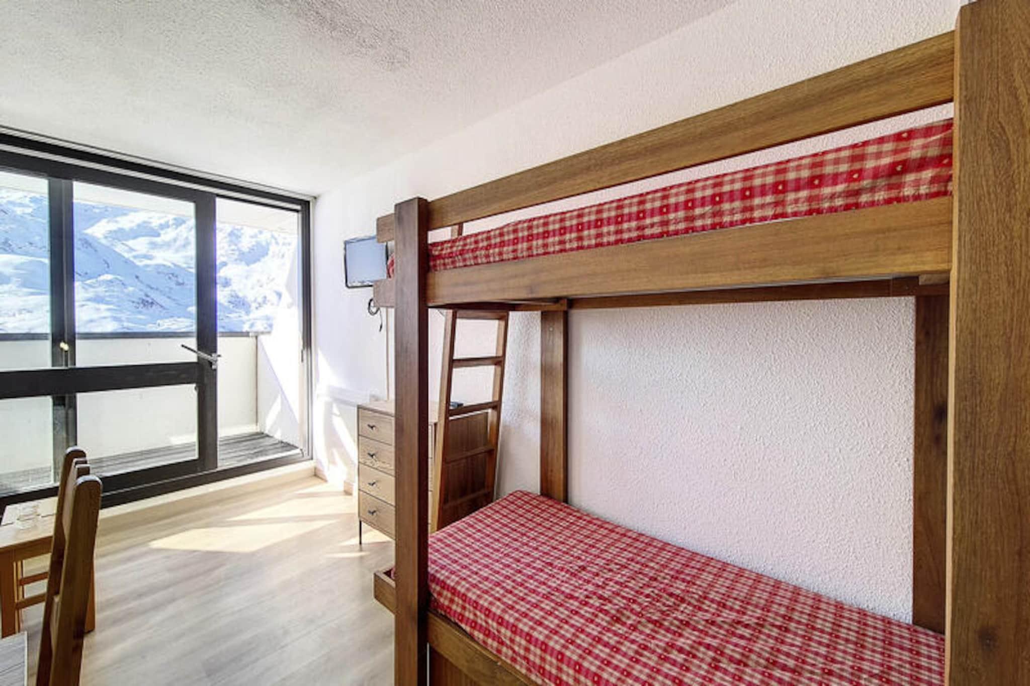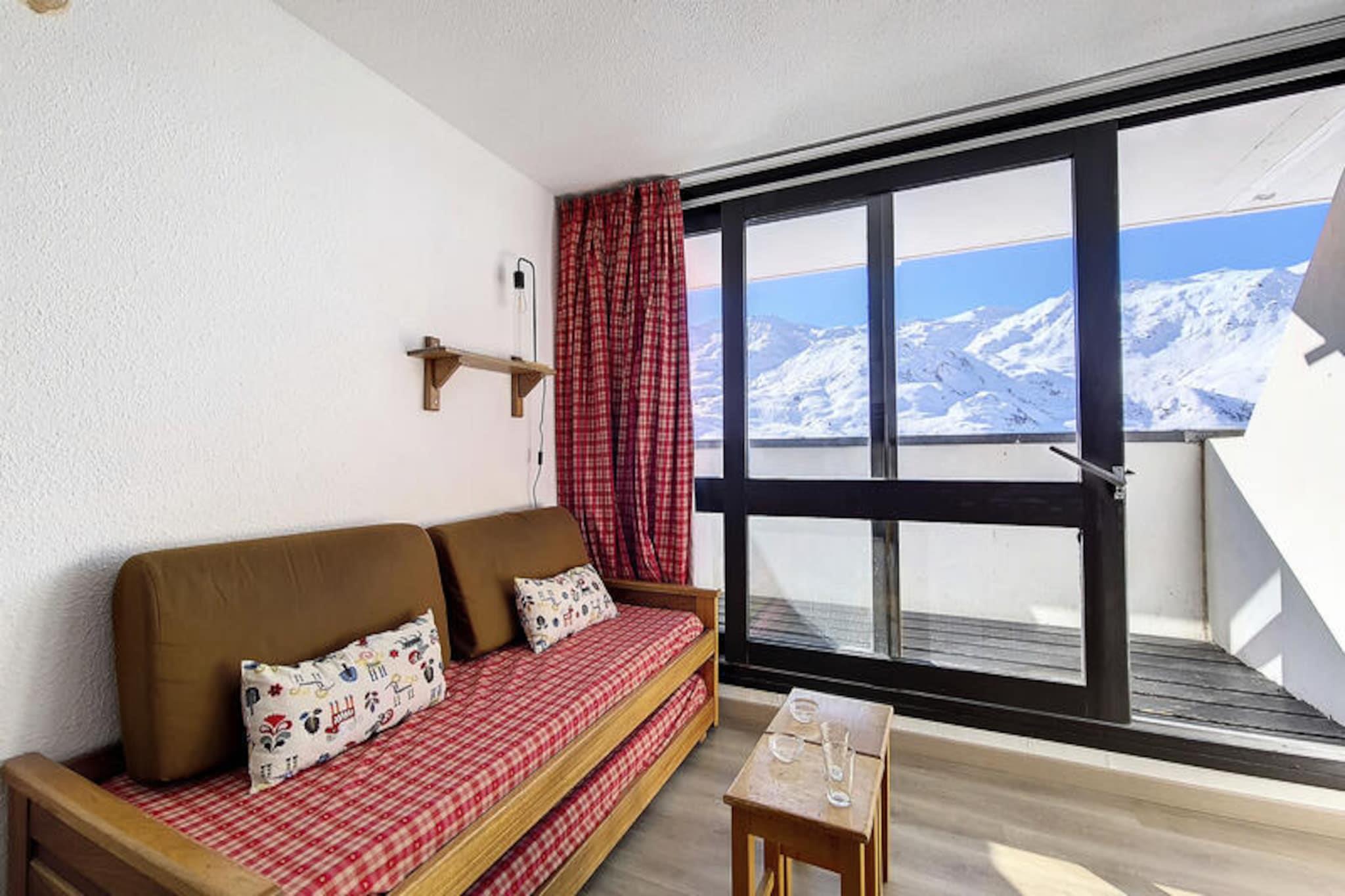 Højt over det travle Les Menuires-resort tilbyder Brelin-bygningen et unikt udsigtspunkt og direkte adgang til pisterne. Beliggende over La Croisette-distriktet er denne bekvemme beliggenhed forbundet med offentlige elevatorer, der er i drift døgnet rundt, hvilket sikrer nem bevægelse mellem hjertet af resortet og dit fredelige tilflugtssted. Fra den sydvestvendte balkon i denne hyggelige studiolejlighed kan du nyde den alpine charme og uforstyrret udsigt over de omkringliggende tinder badet i sollys hele dagen. Uanset om du er her for vintersport eller sommervandreture, er dette den perfekte base for dine bjergeventyr. \n\nDet 24 m² store studio er designet til op til fire gæster og er omhyggeligt indrettet for at maksimere komfort og funktionalitet. Stuen har to enkeltsenge, en enkelt sovesofa og en udtræksseng, hvilket gør den ideel til familier eller små grupper. Det kompakte køkken er udstyret med alt det nødvendige, herunder elektriske kogeplader, køleskab, miniovn, mikrobølgeovn, opvaskemaskine og små apparater som kaffemaskine, brødrister og elkedel. Efter en dag på pisterne kan du slappe af med et varmt brusebad på badeværelset, som har en hævet kant, og nyde varmen i den hyggelige opholdsstue udstyret med et tv. \n\nSelve Brelin-bygningen huser butikker, skiliftbilletkontorer og skibokse for ekstra bekvemmelighed. Der er gratis parkering ved Côte Brune-liften, der ligger for foden af ??bygningen, hvilket gør din ankomst og afrejse stressfri. Med betalt Wi-Fi-adgang og tæpper har du alt, hvad du behøver for et behageligt ophold. \n\nUanset om du er tiltrukket af spændingen ved skiløb, roen i alpine landskaber eller den pulserende atmosfære i Les Menuires, kombinerer denne studiolejlighed praktisk sans og charme for en uforglemmelig bjergferie.