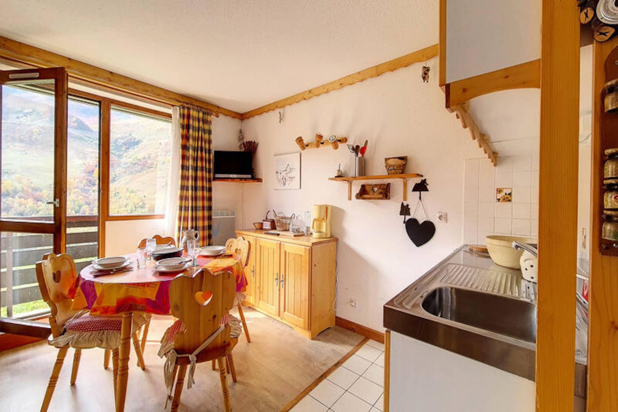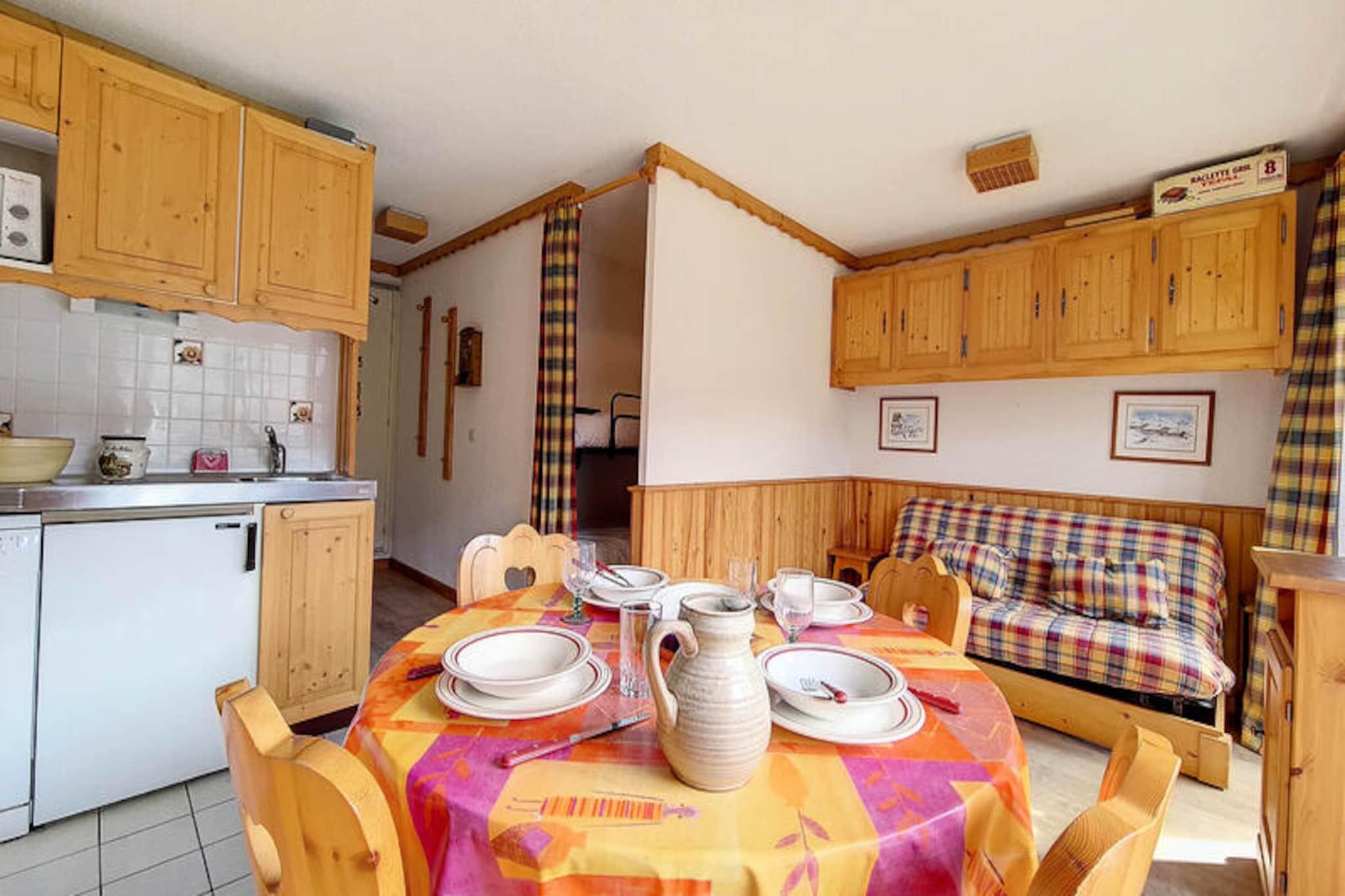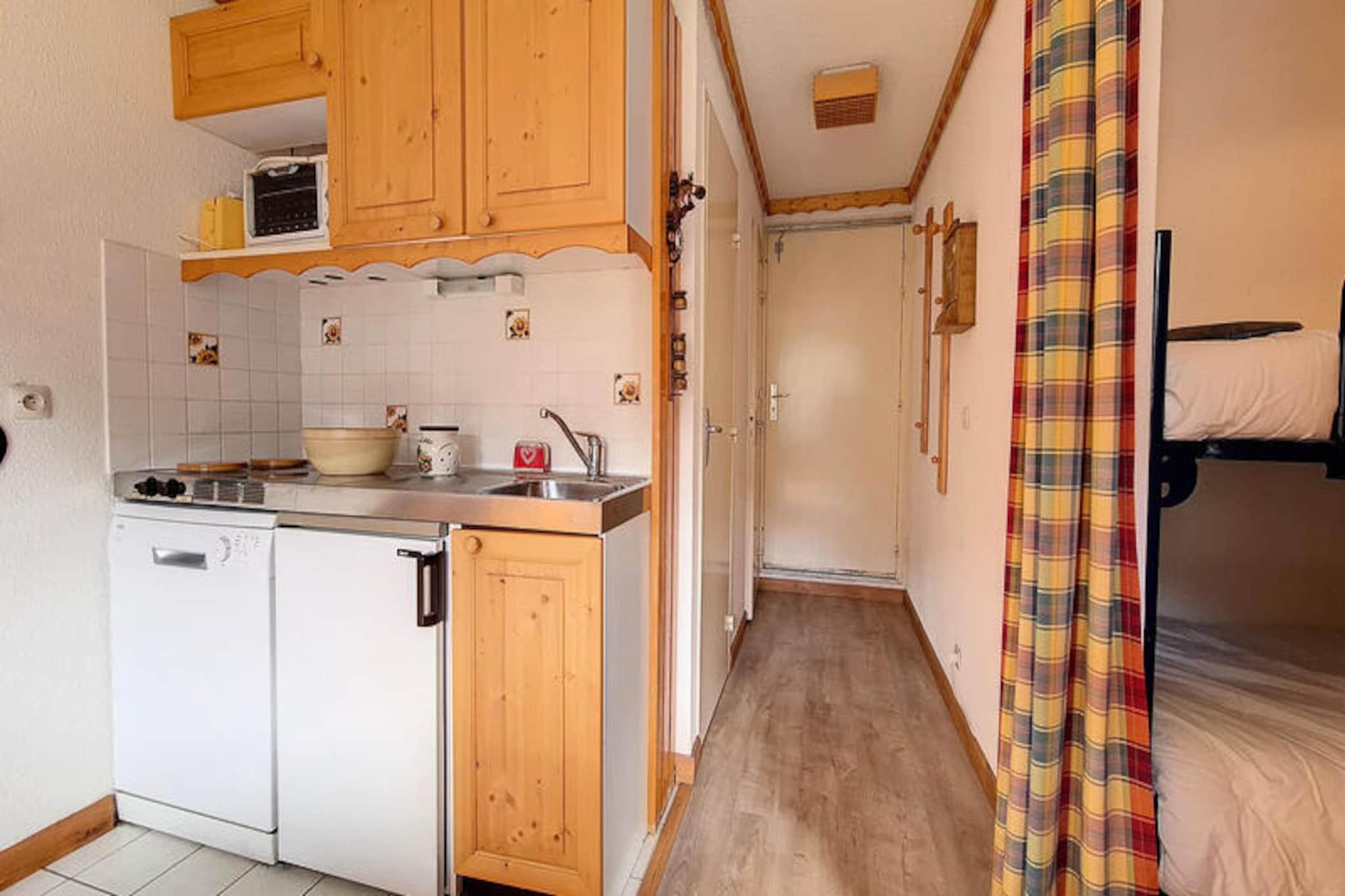 Hvor de uberørte skråninger i Les Menuires møder charmen ved alpint liv, tilbyder denne hyggelige studiolejlighed et perfekt tilflugtssted for både skientusiaster og naturelskere. Ejendommen ligger i Sarvan-residensen i Preyerand-distriktet og kan prale af direkte ski-in/ski-out-adgang fra sin vestvendte balkon, så du kan træde direkte ud på sneen og omfavne bjergenes magi. Med den gratis Preyerand-svævebane, der kører dagligt indtil sen aften, er det nemt at nå det centrale La Croisette-område, hvilket sikrer, at du altid er forbundet med hjertet af begivenhederne. \n\nIndenfor er det 25 m² store studio omhyggeligt designet til at rumme op til fire gæster. Opholdsstuen har en komfortabel sovesofa til to, mens en separat sovealkove med køjesenge tilbyder ekstra privatliv. Lejligheden er udstyret med moderne bekvemmeligheder, herunder et tv, et fuldt udstyret køkken med miniovn, opvaskemaskine, kaffemaskine og brødrister samt et badeværelse med badekar og separat toilet. Skibokse med kodet adgang giver bekvemmelighed, og lejligheden er røgfri for et friskt og indbydende miljø. \n\nUd over pisterne tilbyder Les Menuires en pulserende blanding af afterski-aktiviteter, spisemuligheder og lokale butikker, alt sammen inden for gåafstand. Uanset om du udforsker det store skiområde Les Trois Vallées eller nyder en fredelig aften på din balkon, lover den betagende alpine udsigt og den friske bjergluft et uforglemmeligt ophold. \n\nVælg dette charmerende studie på grund af dets uovertrufne beliggenhed, hyggelige atmosfære og problemfri adgang til en af ??verdens mest berømte skidestinationer. Perfekt til par eller små familier, der søger en blanding af eventyr og afslapning i de franske alper.