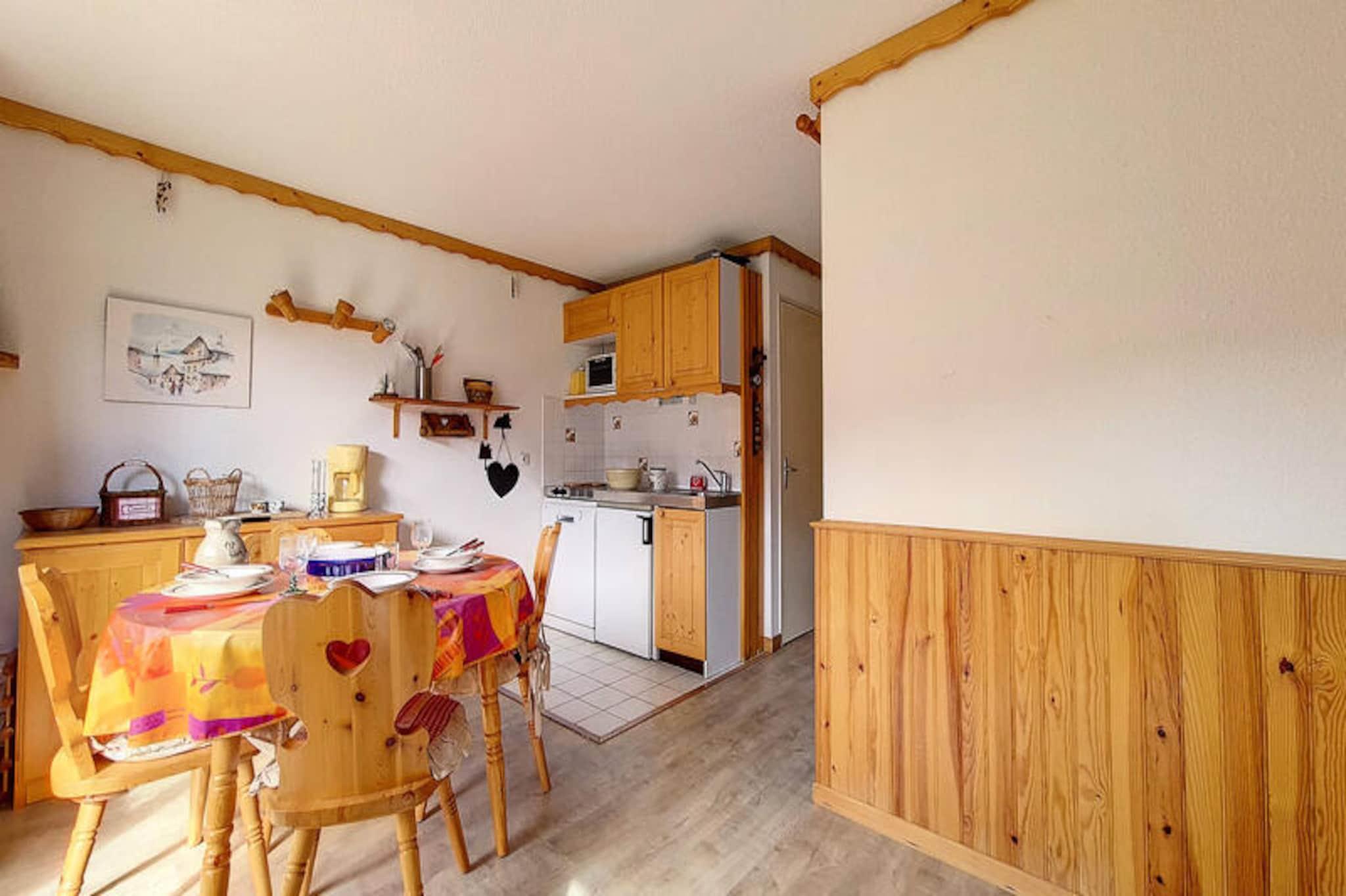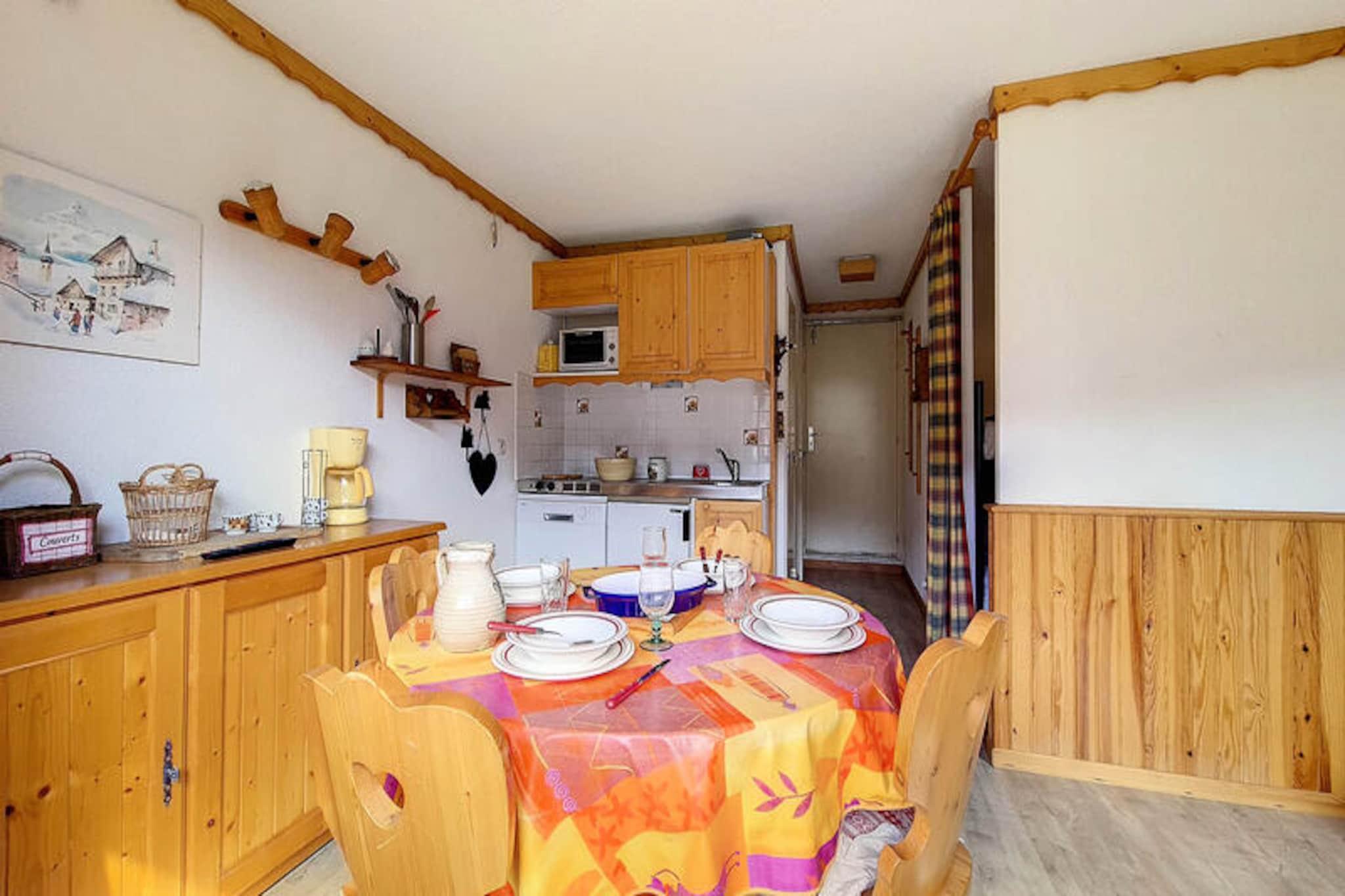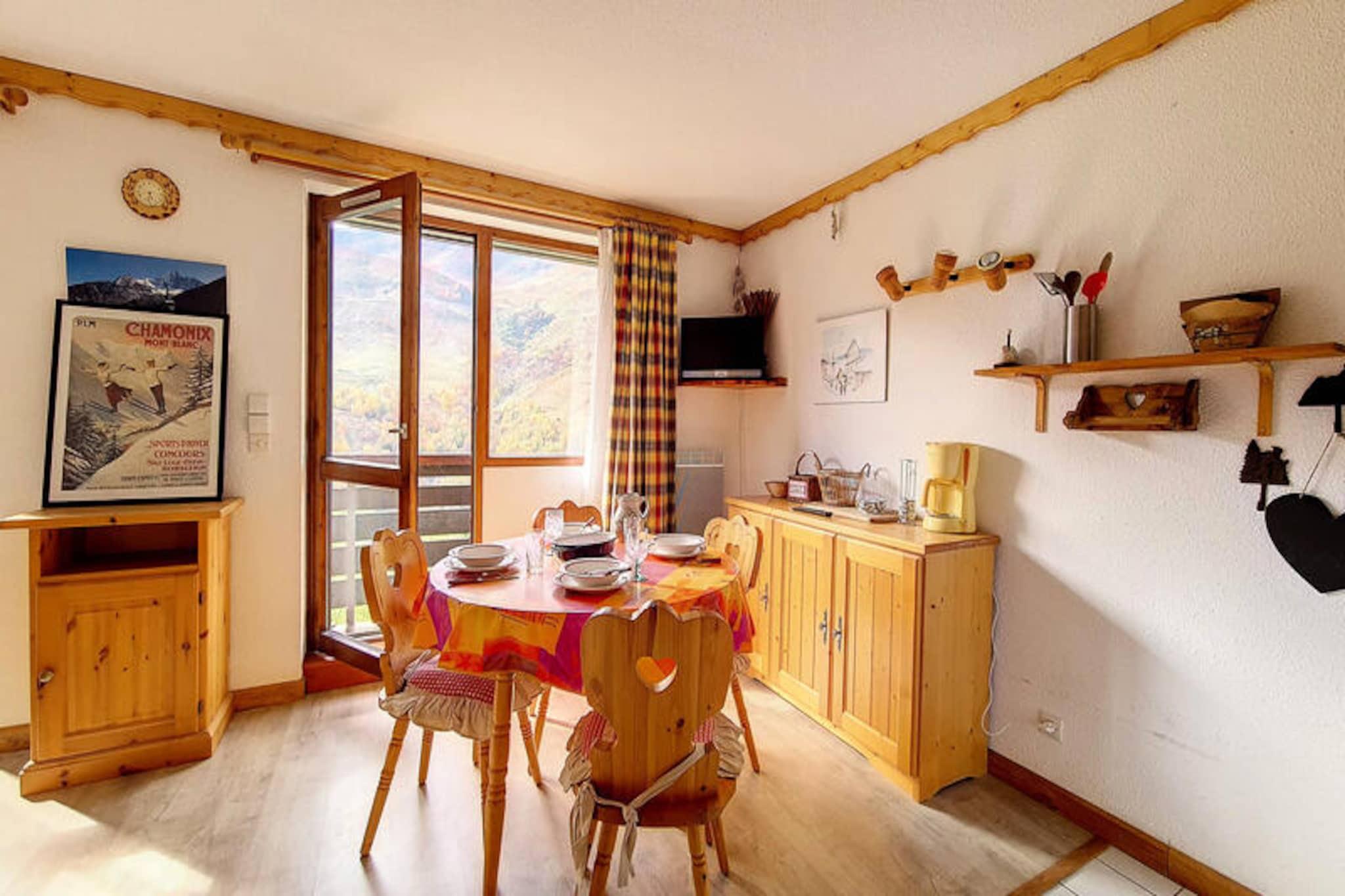 Hvor de uberørte skråninger i Les Menuires møder charmen ved alpint liv, tilbyder denne hyggelige studiolejlighed et perfekt tilflugtssted for både skientusiaster og naturelskere. Ejendommen ligger i Sarvan-residensen i Preyerand-distriktet og kan prale af direkte ski-in/ski-out-adgang fra sin vestvendte balkon, så du kan træde direkte ud på sneen og omfavne bjergenes magi. Med den gratis Preyerand-svævebane, der kører dagligt indtil sen aften, er det nemt at nå det centrale La Croisette-område, hvilket sikrer, at du altid er forbundet med hjertet af begivenhederne. \n\nIndenfor er det 25 m² store studio omhyggeligt designet til at rumme op til fire gæster. Opholdsstuen har en komfortabel sovesofa til to, mens en separat sovealkove med køjesenge tilbyder ekstra privatliv. Lejligheden er udstyret med moderne bekvemmeligheder, herunder et tv, et fuldt udstyret køkken med miniovn, opvaskemaskine, kaffemaskine og brødrister samt et badeværelse med badekar og separat toilet. Skibokse med kodet adgang giver bekvemmelighed, og lejligheden er røgfri for et friskt og indbydende miljø. \n\nUd over pisterne tilbyder Les Menuires en pulserende blanding af afterski-aktiviteter, spisemuligheder og lokale butikker, alt sammen inden for gåafstand. Uanset om du udforsker det store skiområde Les Trois Vallées eller nyder en fredelig aften på din balkon, lover den betagende alpine udsigt og den friske bjergluft et uforglemmeligt ophold. \n\nVælg dette charmerende studie på grund af dets uovertrufne beliggenhed, hyggelige atmosfære og problemfri adgang til en af ??verdens mest berømte skidestinationer. Perfekt til par eller små familier, der søger en blanding af eventyr og afslapning i de franske alper.