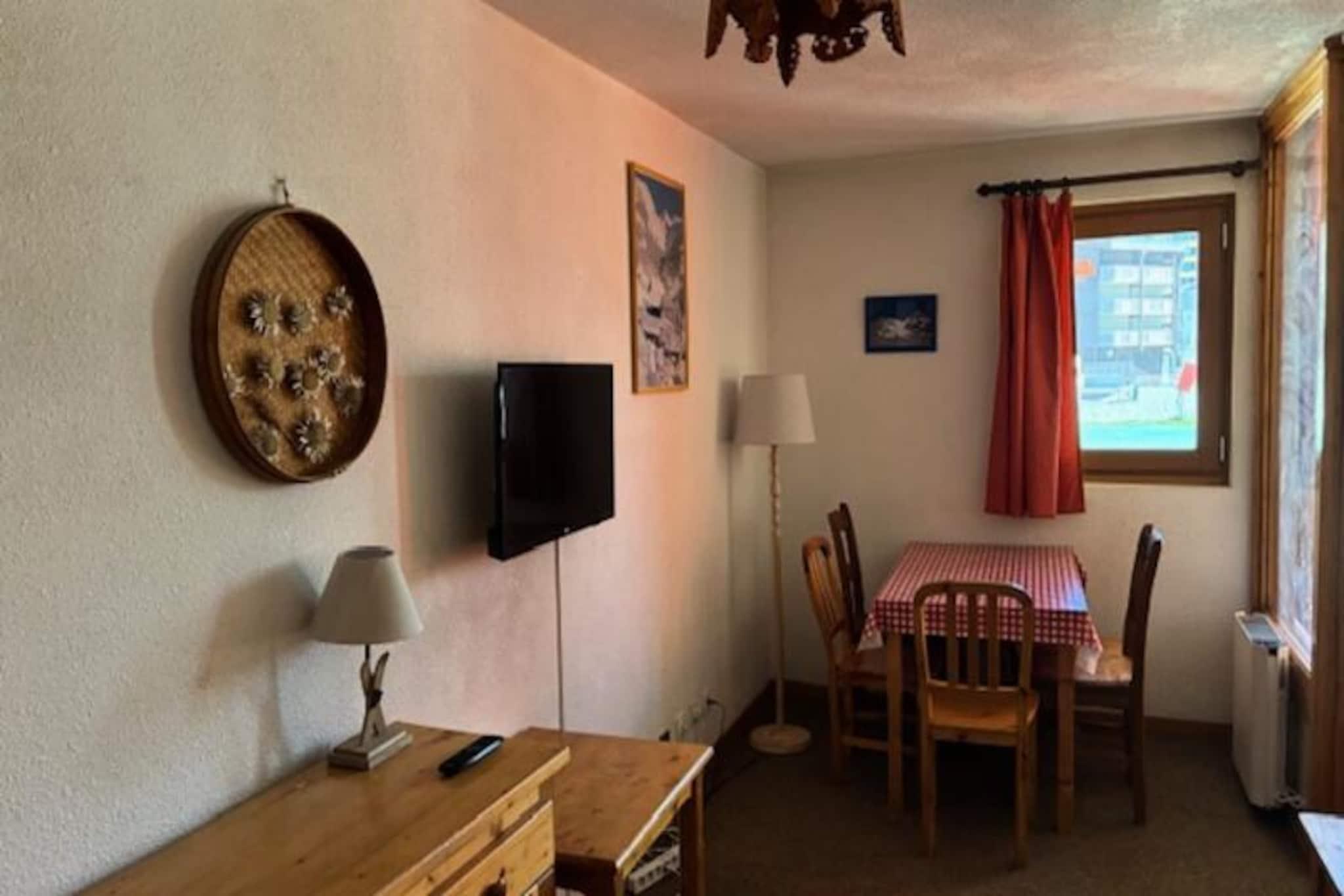 I det pulserende Caron-distrikt i Val Thorens tilbyder denne hyggelige toværelseslejlighed et perfekt alpint tilflugtssted for op til fire gæster. Beliggende i Eskival-residensen befinder du dig i hjertet af feriestedet, omgivet af et livligt udvalg af butikker, restauranter og essentielle tjenester såsom turistkontoret, skiskole og endda en bowlingbane. Med direkte adgang til pisterne er denne ejendom en drøm for skientusiaster, der er ivrige efter at komme i sneen uden forsinkelse. Lejligheden, der ligger på første sal med elevatoradgang, har en sydvendt veranda og balkon, der inviterer dig til at nyde bjergsolen og den fantastiske udsigt over alperne. Indenfor er stuen udstyret med en udtrækssovesofa, der kan laves om til to enkeltsenge, mens soveværelset tilbyder en komfortabel dobbeltseng. Tekøkkenet er veludstyret med ovn, komfur, opvaskemaskine, køleskab og emhætte, hvilket gør det nemt at tilberede måltider efter en dag med eventyr. Et separat badeværelse med badekar og håndvask samt et separat toilet sikrer bekvemmelighed og privatliv for alle gæster. Træd udenfor, og du bliver straks fordybet i Val Thorens dynamiske atmosfære. I stueetagen huser boligen endda en Skiset/Goistchel GS2 sportsbutik til alt dit udstyr. Uanset om du udforsker pisterne, nyder lokale restauranter eller benytter dig af de nærliggende børnekælkebaner, er alt kun et stenkast væk. For dem, der ankommer i bil, kan der lejes garagepladser i boligen, hvilket giver ekstra bekvemmelighed. Uanset om du er her for skiløb i verdensklasse, den pulserende afterskiing-scene eller blot for at slappe af i den friske bjergluft, tilbyder denne lejlighed i Eskival-boligen den perfekte base for en uforglemmelig alpin ferie.