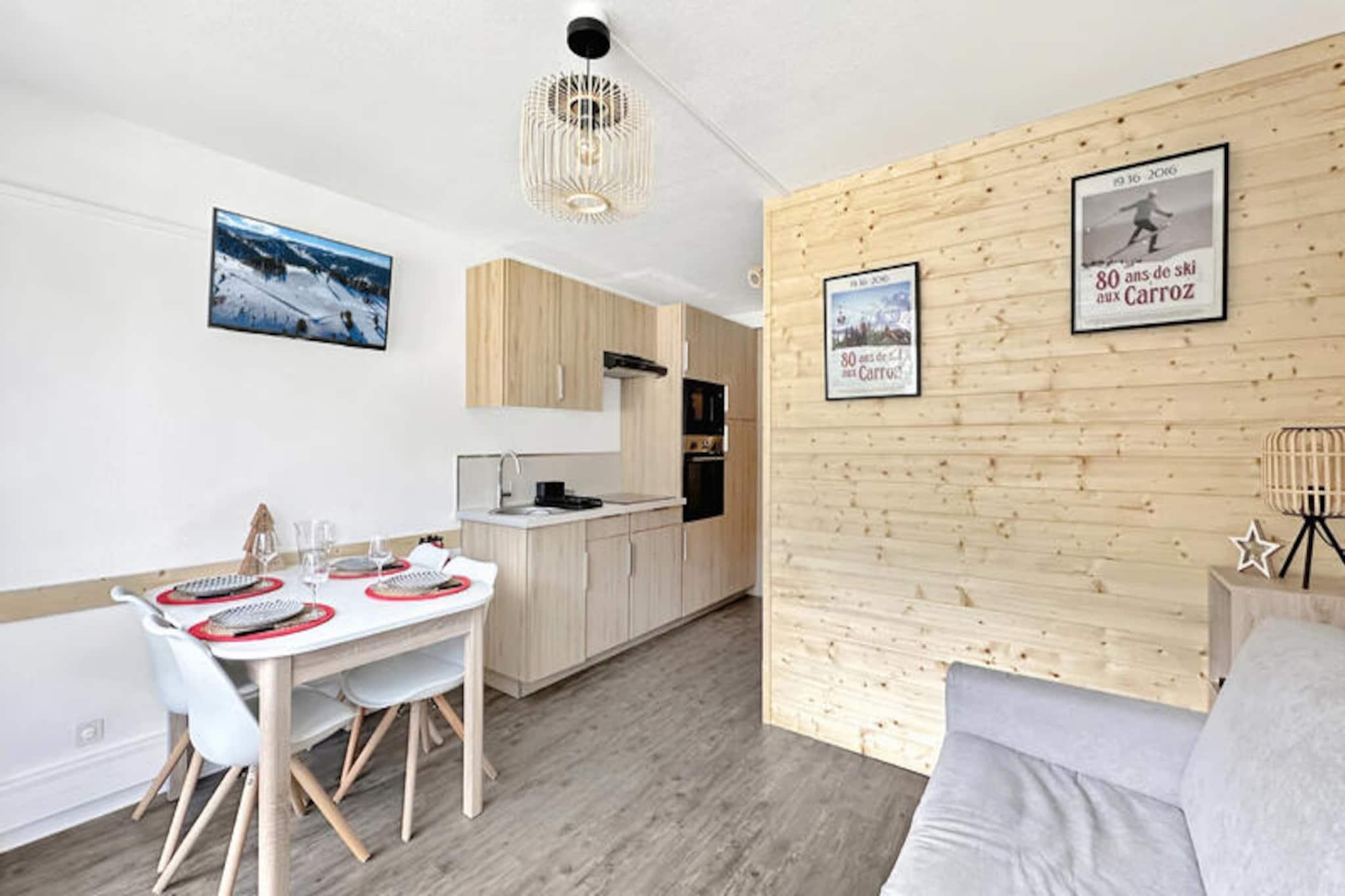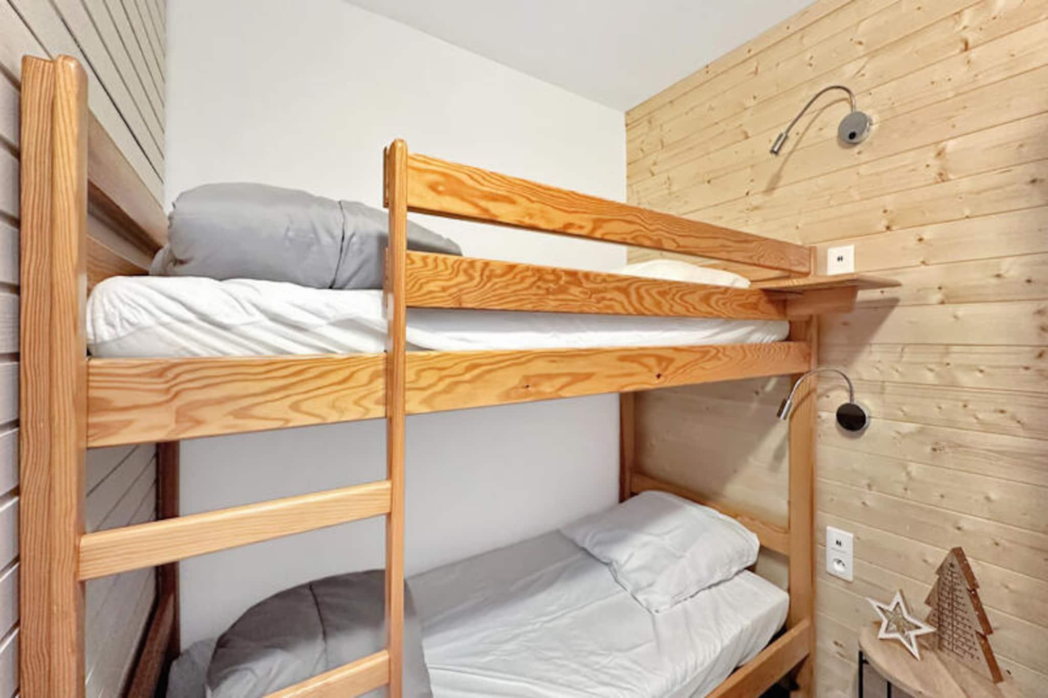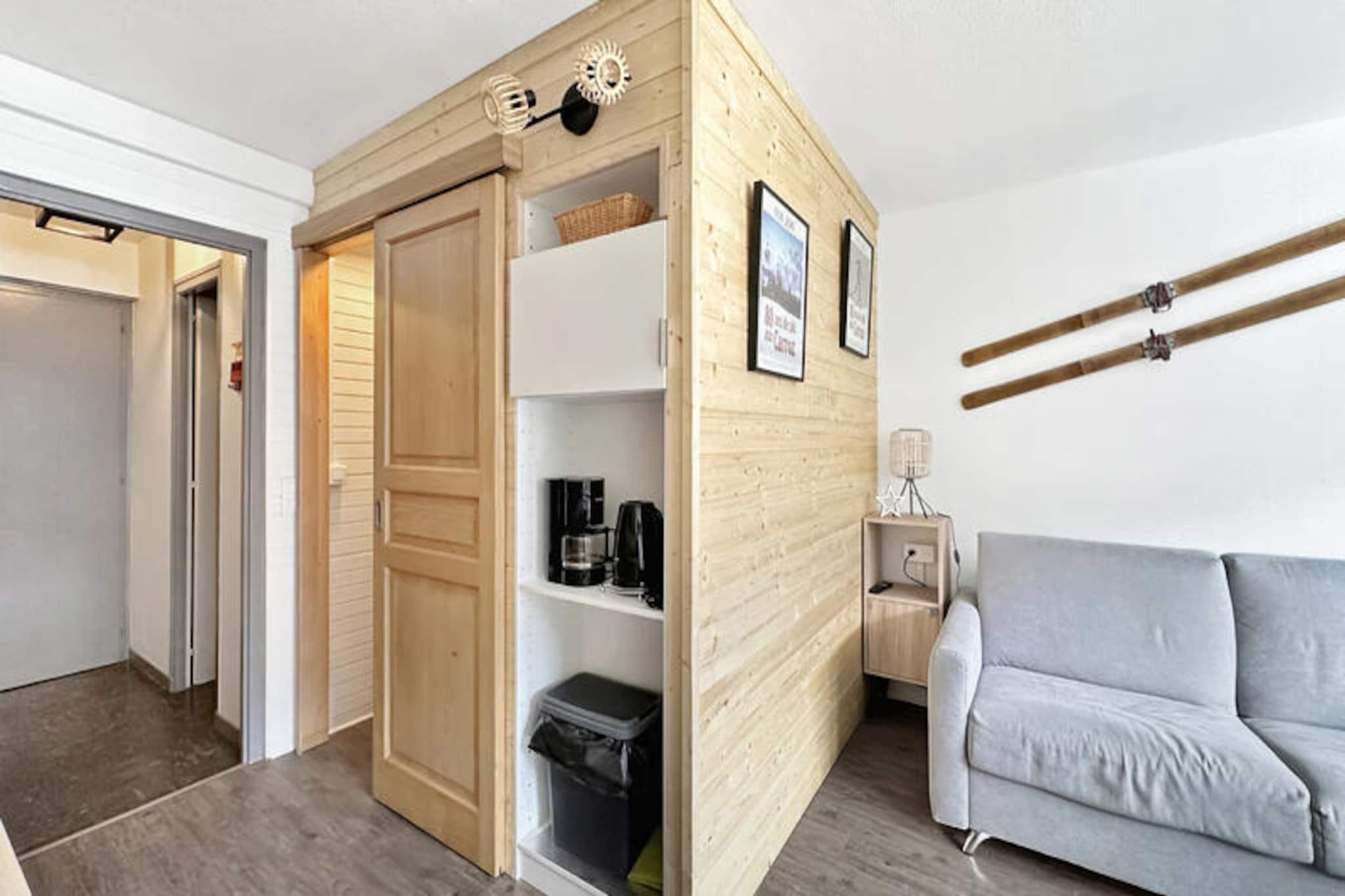 I hjertet af den charmerende alpelandsby inviterer dette smukt renoverede og solrige studio dig til at opleve det perfekte bjergtilflugtssted. Beliggende kun 5 minutters gang fra skibussen, tilbyder det både bekvemmelighed og en hyggelig atmosfære, ideelt for par eller små familier, der søger en mindeværdig ferie i de franske alper. Studioets smagfulde design og sans for detaljer skaber en varm og indbydende atmosfære, der blander moderne komfort med alpin charme. Dette lyse studio på første sal er på 25 m² og har plads til op til fire gæster. Opholdsstuen har en Rapido-sovesofa af høj kvalitet med en premiummadras, der sikrer afslappende nætter efter dages eventyr. Et separat soveområde med to køjesenge giver ekstra komfort og privatliv. Det fuldt udstyrede køkken med et stort køleskab, ovn, mikrobølgeovn, induktionskogeplade, elkedel og brødrister gør det nemt at tilberede lækre måltider. Badeværelset er omhyggeligt designet og tilbyder moderne bekvemmeligheder for din bekvemmelighed. Et dedikeret skiskab sikrer, at dit udstyr er sikkert opbevaret og klar til brug. Træd udenfor og fordyb dig i det pulserende landsbyliv med charmerende butikker, restauranter og nem adgang til skibussen, der forbinder dig med regionens pister i verdensklasse. Uanset om du er her for at stå på ski, vandre eller blot slappe af, danner det omkringliggende alpine landskab en fantastisk kulisse for dine eventyr. Dette studie er den perfekte base for at udforske de franske alper og tilbyder en harmonisk blanding af komfort, stil og tilgængelighed. Lad den friske bjergluft og de maleriske omgivelser inspirere din næste uforglemmelige ferie.