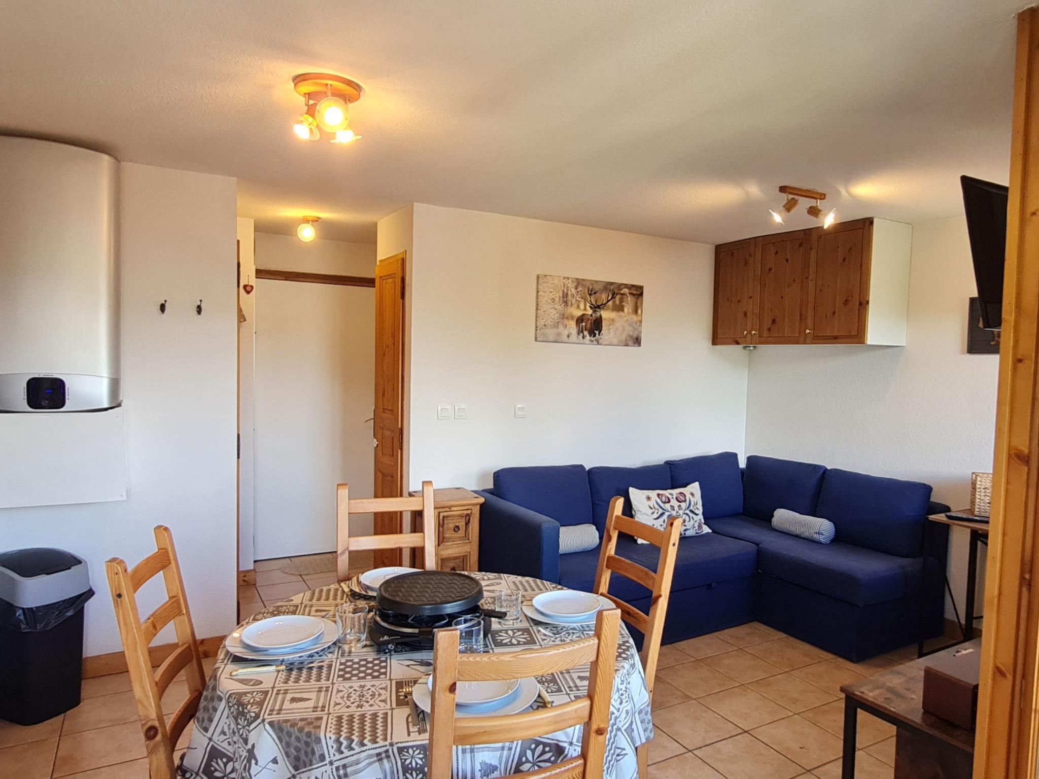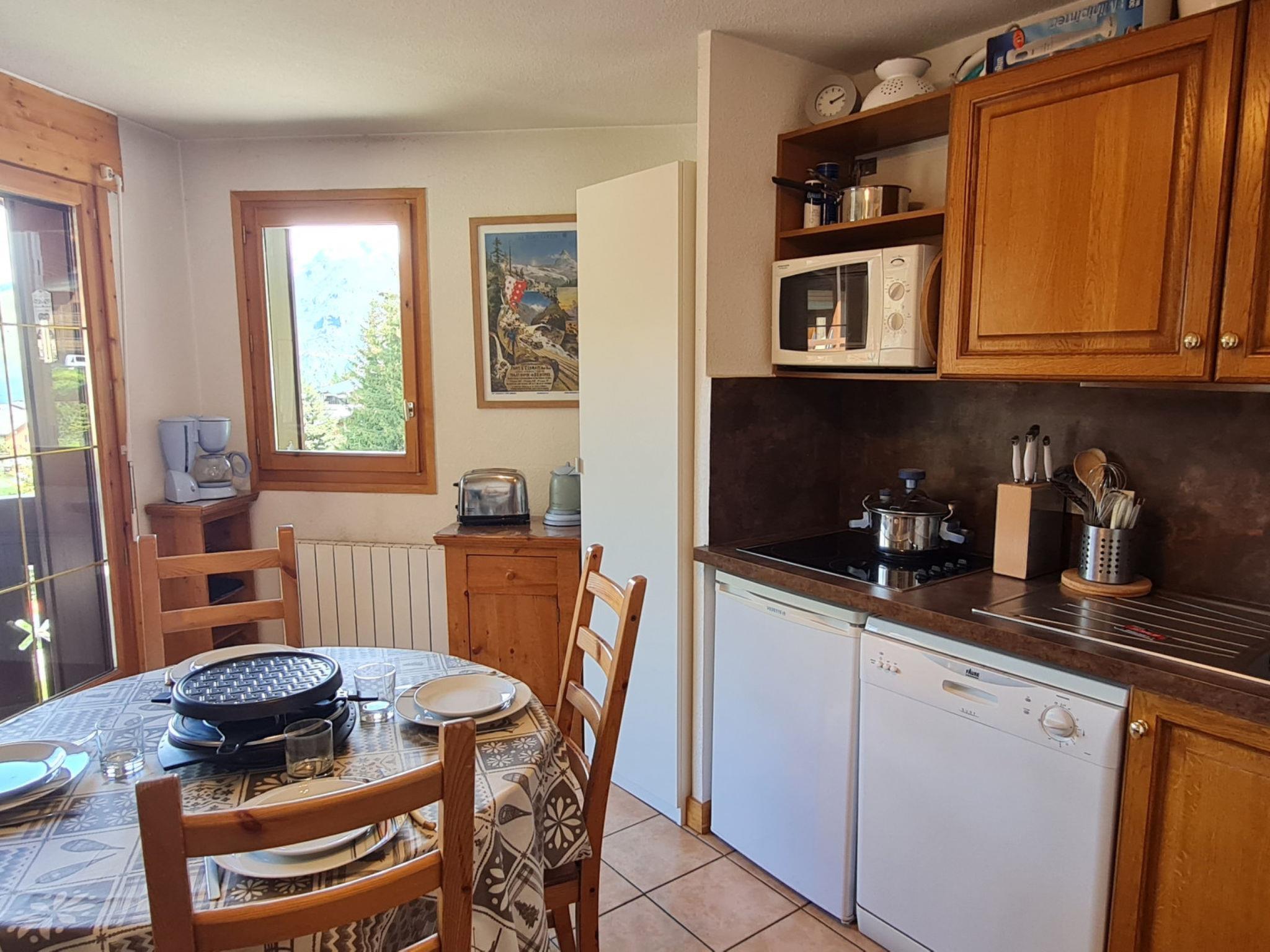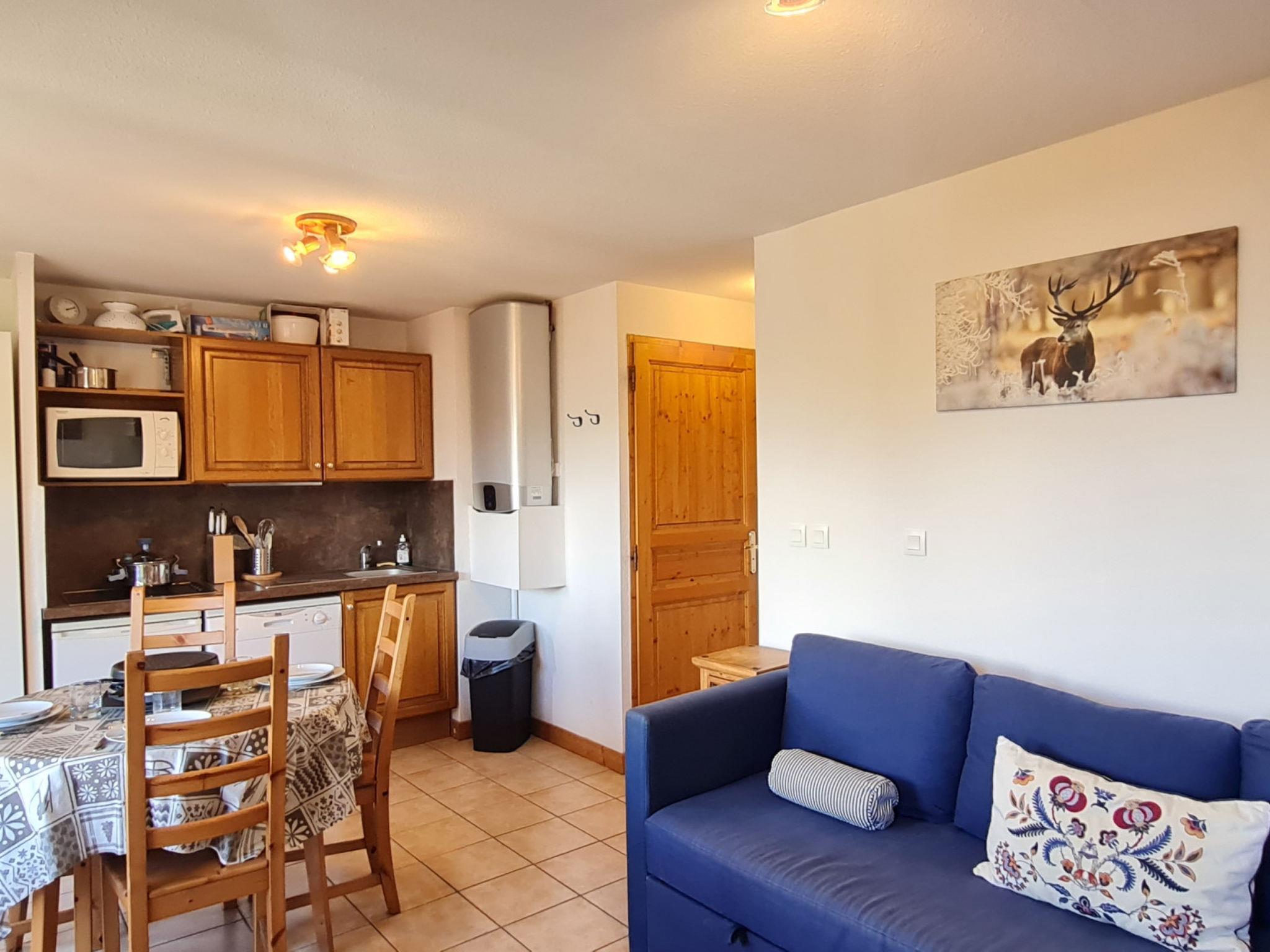 "Chalets d'Or D", 1-room studio 23 m2 on 2nd floor. Object suitable for 4 adults. Living room with 1 sofabed and 1 x 2 bunk beds, 1 pull-out bed and TV. Open kitchen (2 hot plates, dishwasher, toaster, kettle, microwave, electric coffee machine). Shower/WC. Balcony. Facilities: iron. Parking (1 car). Please note: non-smokers only. Offer by a commercial proprietor according to Art. 155, IV, CGI 38253002825WF