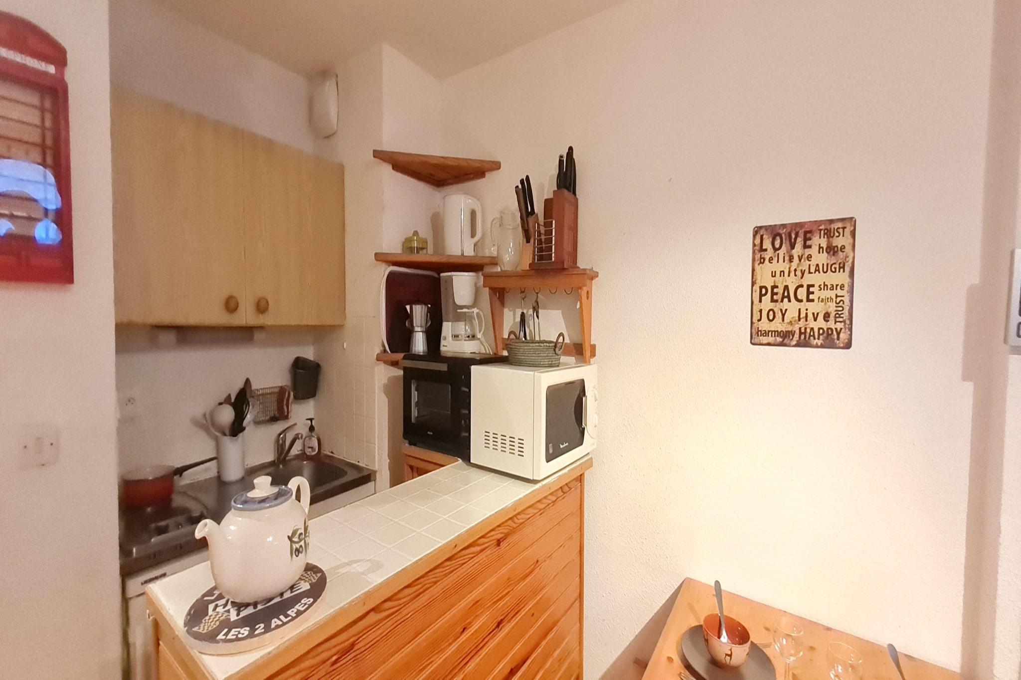 Denne hyggelige og lyse lejlighed i Les Deux Alpes tilbyder komfortabel indkvartering for op til fire gæster. Lejligheden har et soveværelse og en rummelig planløsning på 30 m², perfekt til en lille familie eller gruppe. Beliggende i en familievenlig zone i et smukt bjergområde, er lejligheden udstyret med elvarme, et tv og en radio til underholdning. En privat balkon tilføjer charmen og tilbyder et sted at slappe af og nyde den friske bjergluft. Bekvemt beliggende kun 50 meter fra byens centrum og en restaurant, vil gæsterne have nem adgang til spisemuligheder og lokale faciliteter. Skisportsstedet ligger kun 150 meter væk, hvilket giver hurtig og nem adgang til pisterne for skiløb og snowboarding. Ejendommen er beliggende i et fredeligt og familievenligt område, ideelt til både afslapning og udendørs eventyr. Lejligheden har også et åbent køkken, fuldt udstyret med vigtige apparater såsom køleskab, mikroovn, kaffemaskine, kedel og køkkenredskaber. Det inkluderer også tallerkener og bestik for en problemfri oplevelse med selvforplejning. Uanset om du er her for en vinterferie eller bare for at nyde de fantastiske omgivelser, tilbyder denne lejlighed den perfekte base for dit ophold.