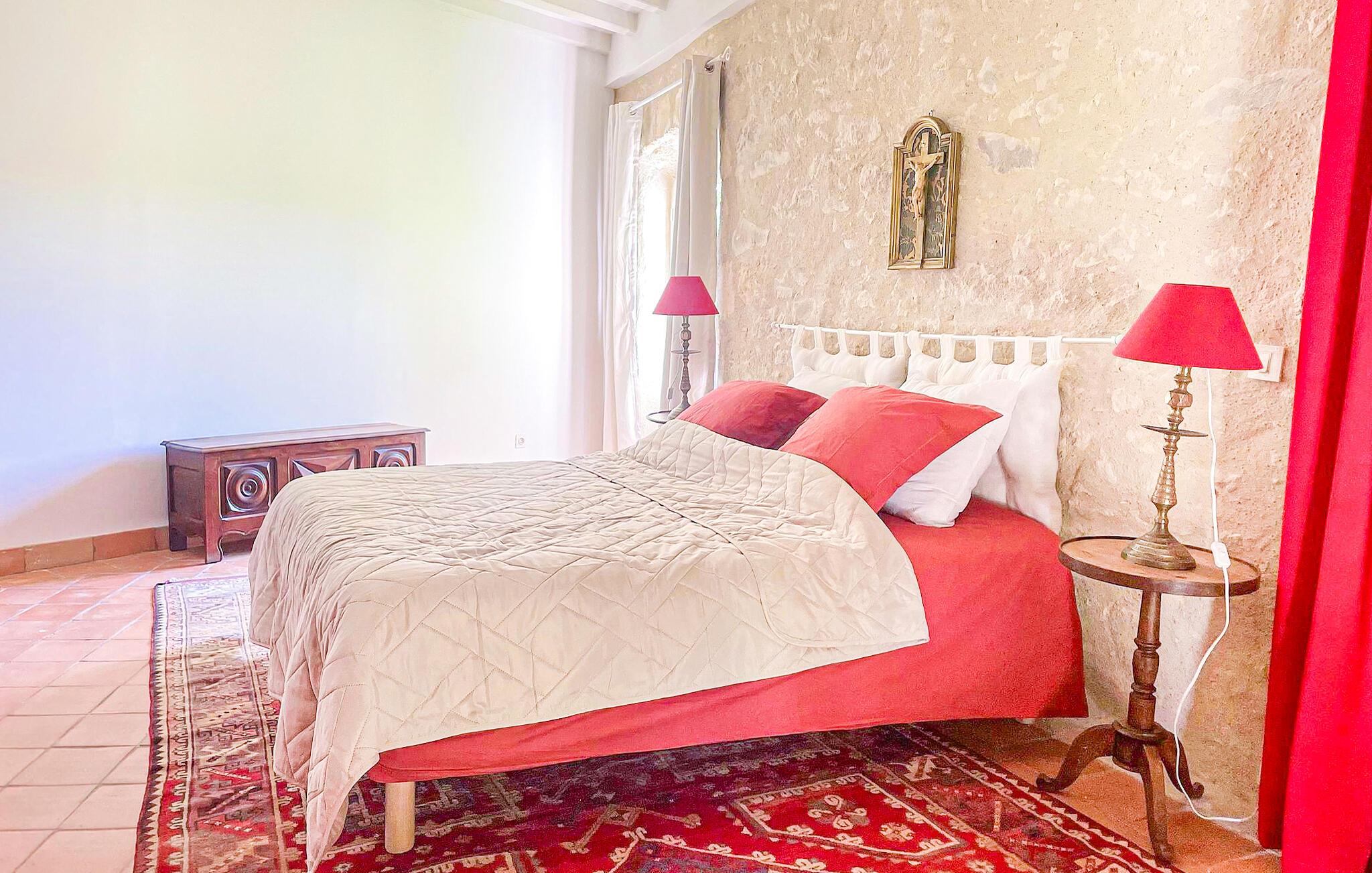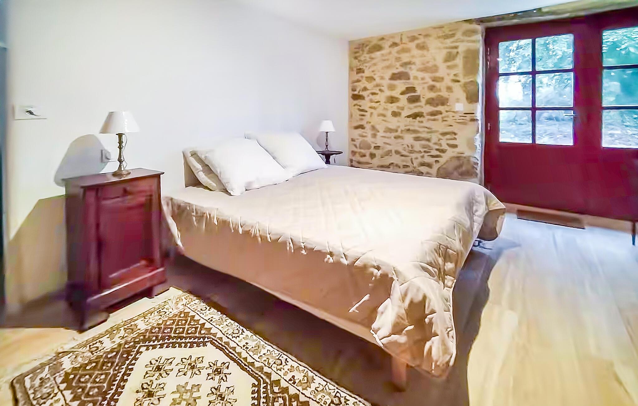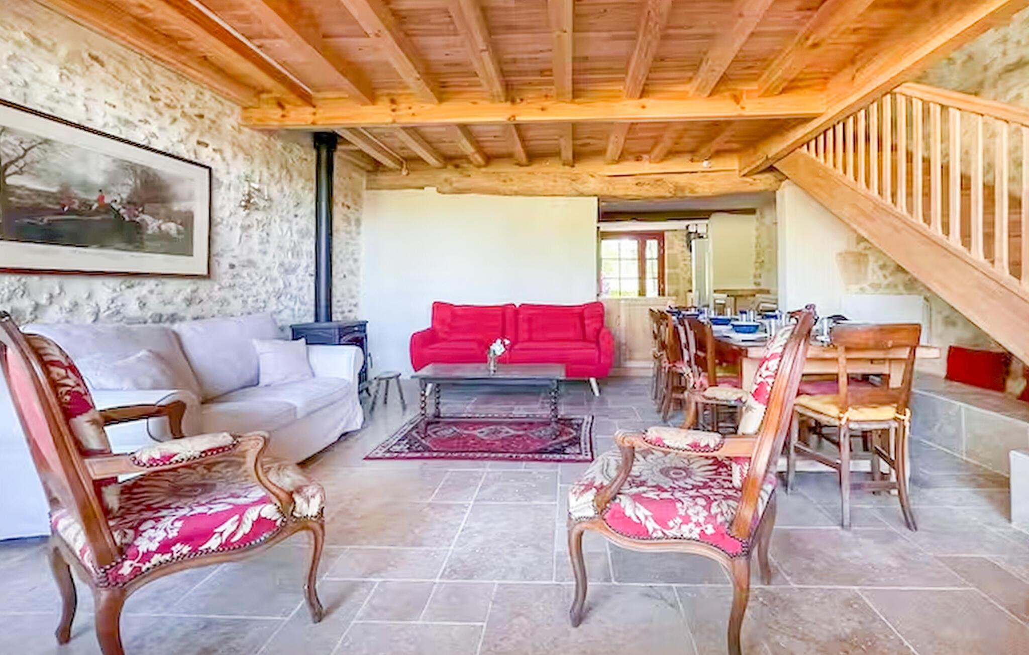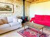 Oplev den autentiske karakter i dette rummelige landsted. Naturstensvægge, lyse værelser og synlige træbjælker giver interiøret en varm og indbydende atmosfære. Slap af på de komfortable sofaer i opholdsstuen og nyd udsigten over haven gennem de store vinduer. Find sammen omkring det store træbord og nyd lange måltider med venner og familie. Køkkenet lægger op til at tilberede regionale produkter. Ovenpå venter en lys stue under tagudhænget, komplet med sofa og fjernsyn.