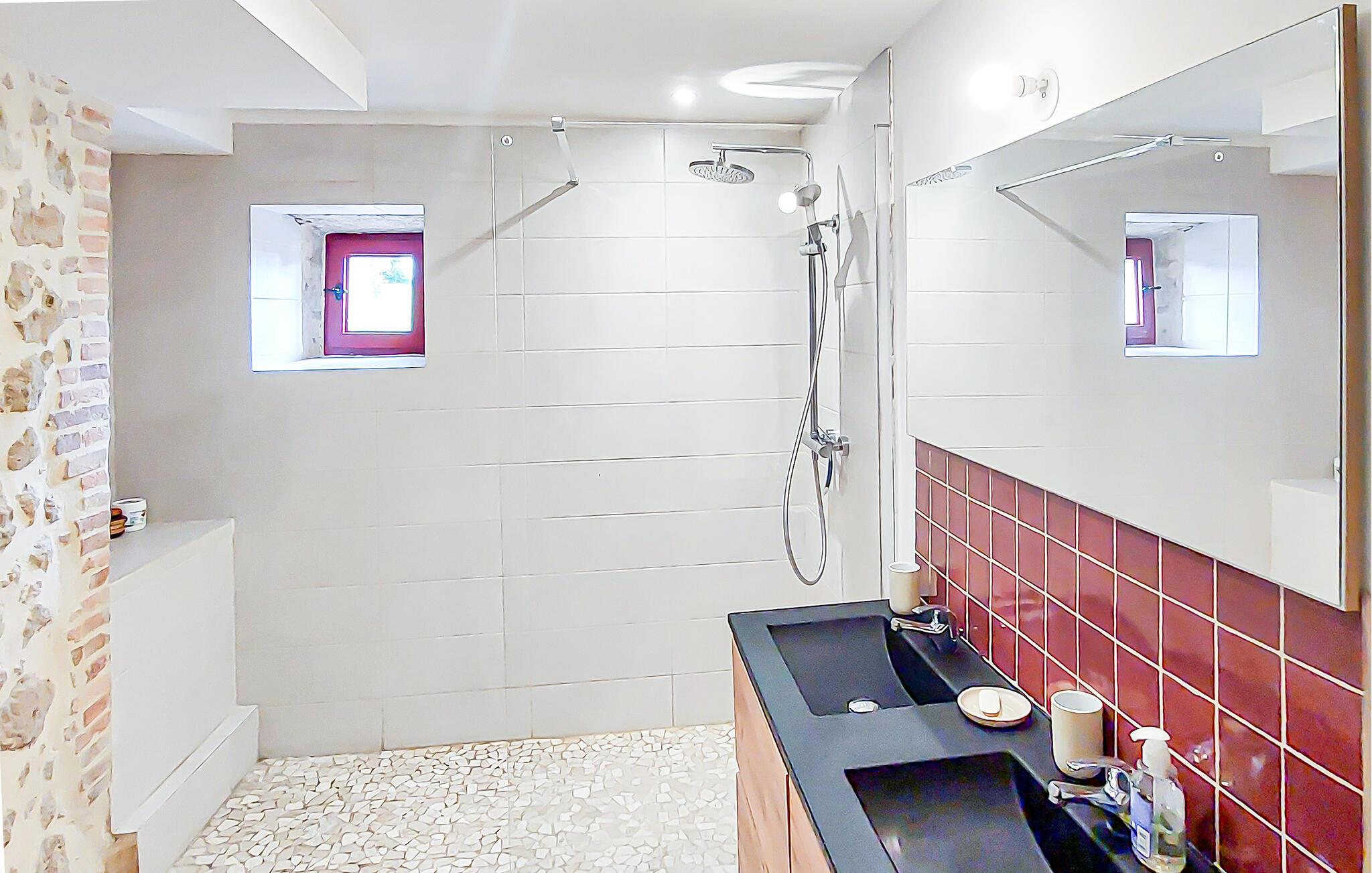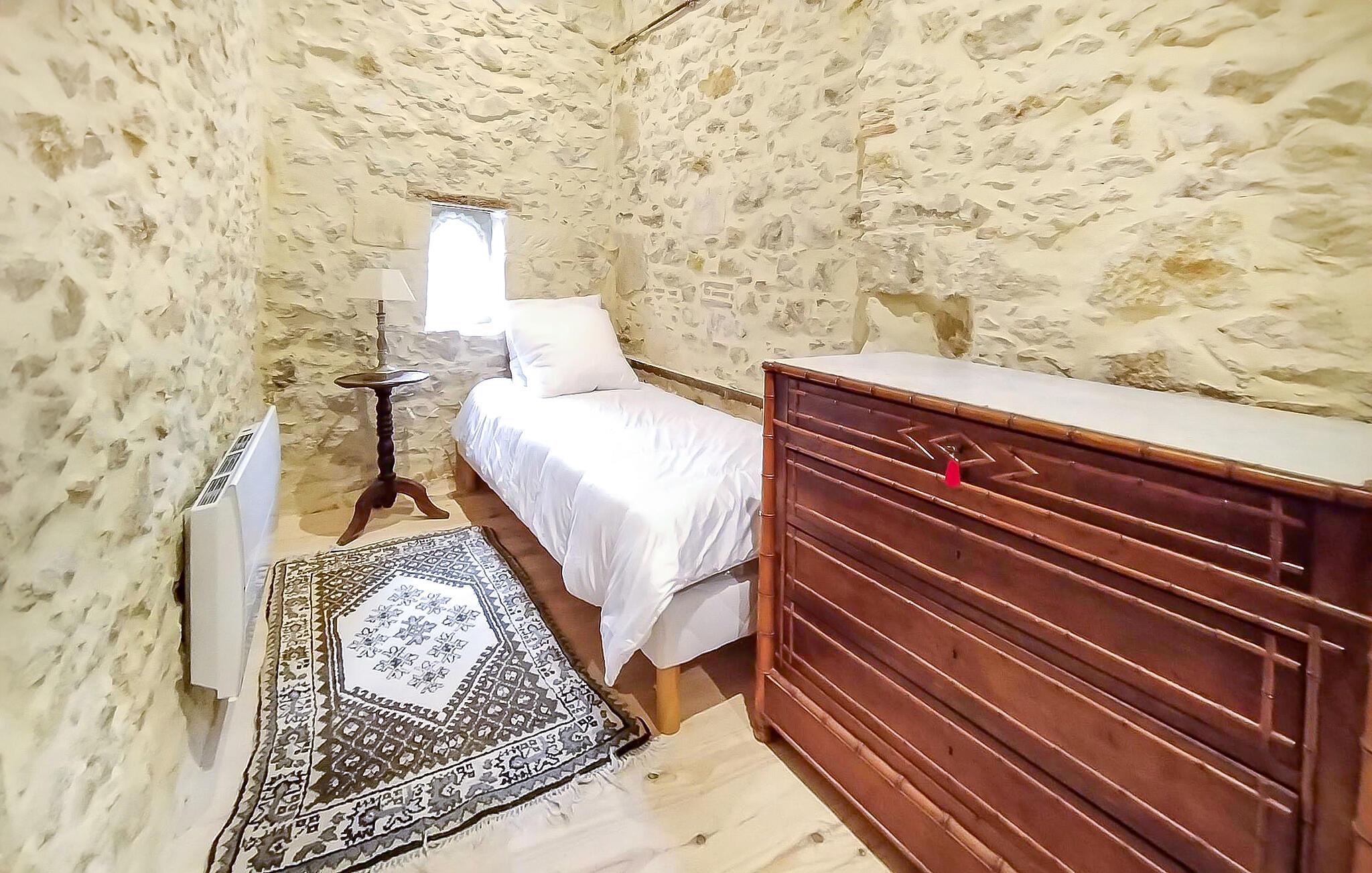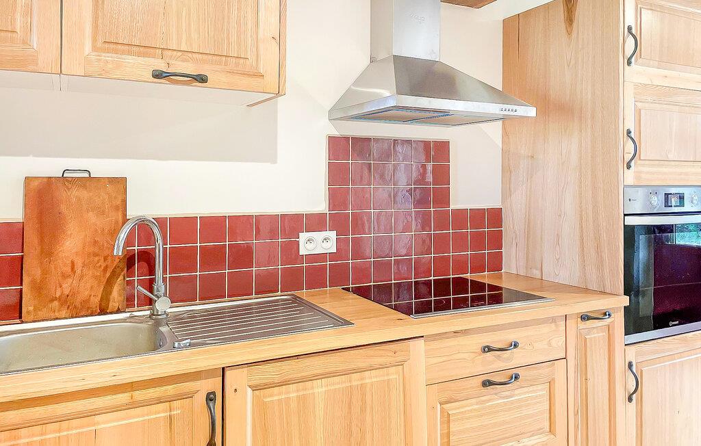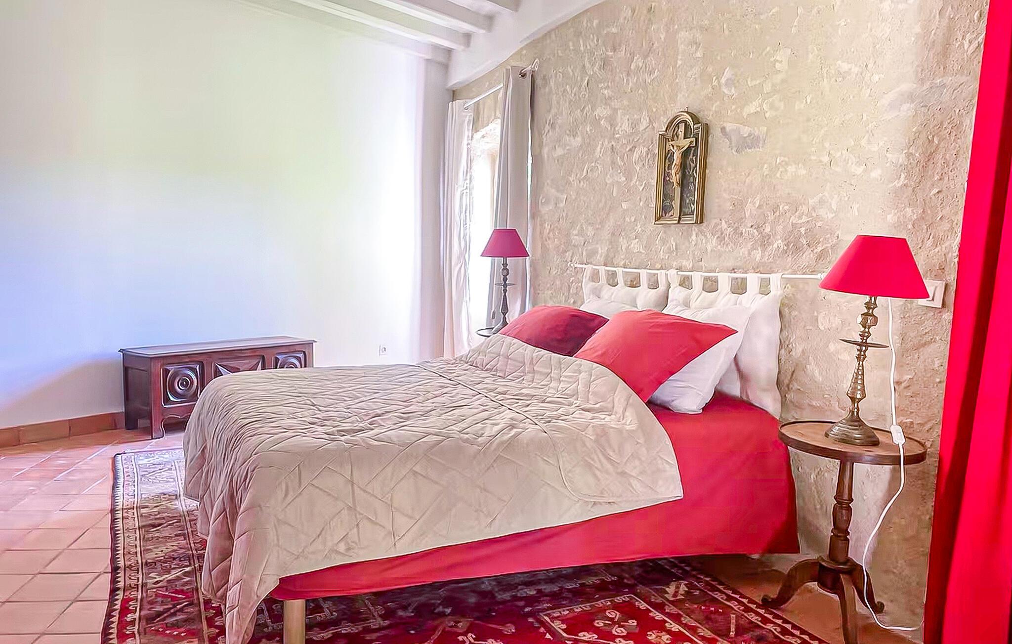 Oplev den autentiske karakter i dette rummelige landsted. Naturstensvægge, lyse værelser og synlige træbjælker giver interiøret en varm og indbydende atmosfære. Slap af på de komfortable sofaer i opholdsstuen og nyd udsigten over haven gennem de store vinduer. Find sammen omkring det store træbord og nyd lange måltider med venner og familie. Køkkenet lægger op til at tilberede regionale produkter. Ovenpå venter en lys stue under tagudhænget, komplet med sofa og fjernsyn.