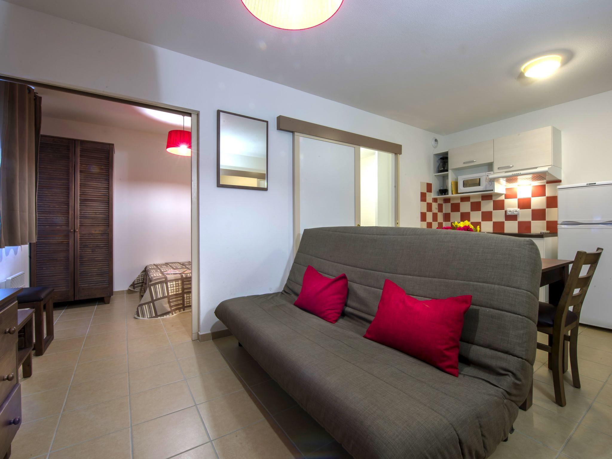 "Les Clos du Rocher", 2-room apartment 27 m2. Bright, simple furnishings: living/sleeping room with 1 double sofabed, dining table and satellite TV. Exit to the balcony, to the terrace. 1 room with 1 french bed and bath/WC. Kitchenette (2 ceramic glass hob hotplates, kettle, microwave, electric coffee machine). Electric heating. Balcony or terrace. Terrace furniture, balcony furniture. Facilities: children's high chair, baby cot. Internet (WiFi, extra). Please note: maximum 1 pet/ dog allowed. Smoke alarm, fire extinguisher.