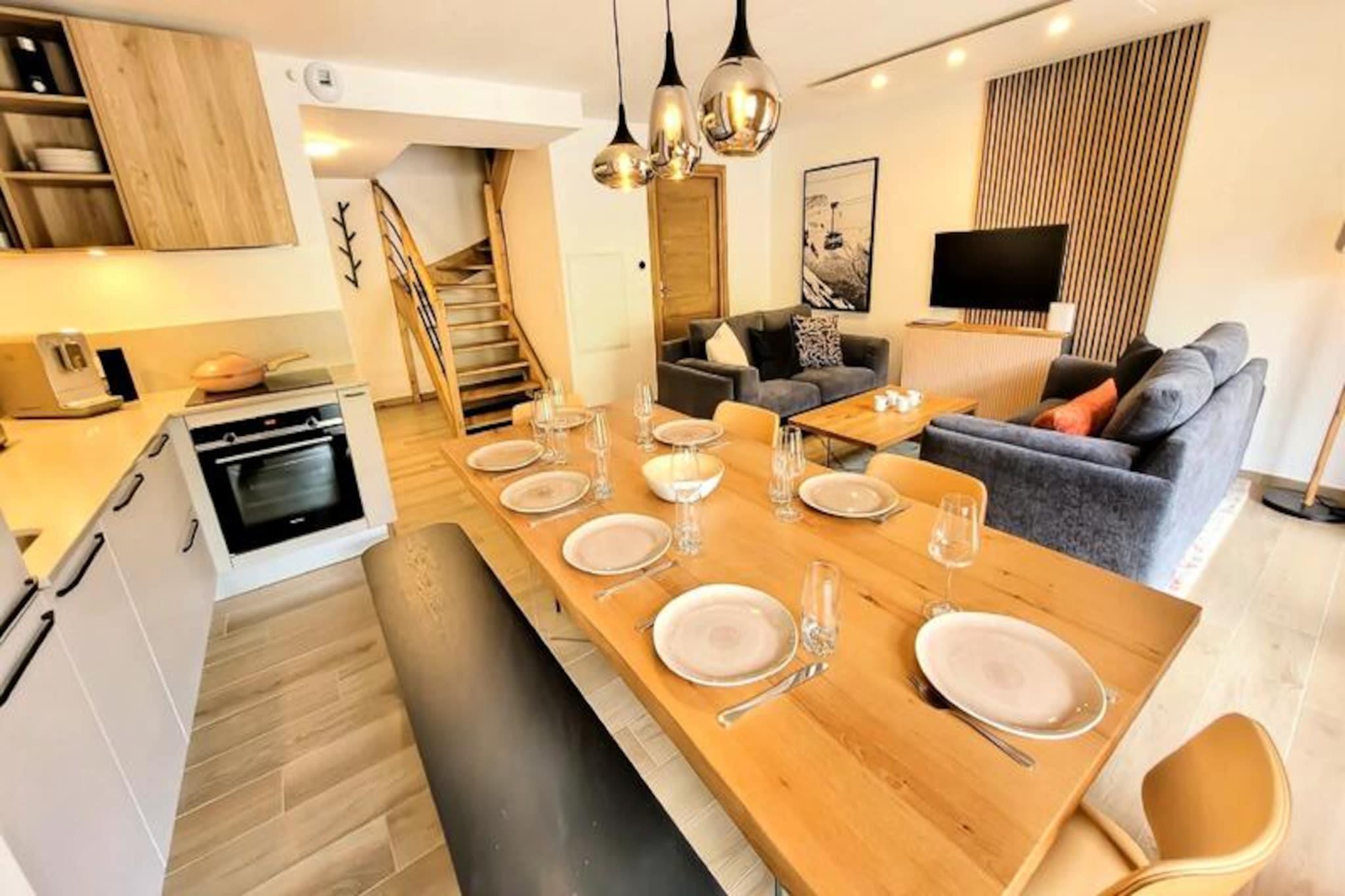 Højt over de maleriske skråninger i de franske alper tilbyder denne elegante duplexlejlighed et roligt tilflugtssted kun en kort gåtur fra landsbyens pulserende hjerte. Forestil dig morgener med at nippe til kaffe på den vestvendte balkon, der ligger på en unik stoleliftbænk, mens du nyder den uhindrede udsigt over de omkringliggende tinder. Med gratis shuttlebusser i nærheden og skiløjper kun 450 meter væk er dine alpine eventyr altid inden for rækkevidde. Uanset om du er her for vinterspænding eller sommerro, kombinerer denne bolig bekvemmelighed med charme. \n\nLejligheden er på 76 m² og har komfortabel plads til op til otte gæster fordelt på fire gennemtænkt designede soveværelser. Den åbne stue har et fuldt udstyret køkken, perfekt til at tilberede solide måltider efter en dag på pisterne. Luksuriøse faciliteter, herunder Smart TV'er, Wi-Fi og en raclettegrill, sikrer et hyggeligt og moderne ophold. To stilfulde badeværelser med håndklædetørrer tilføjer et strejf af luksus, mens ovenlysvinduet i soveområdet skaber en varm og indbydende atmosfære. Familier og grupper vil sætte pris på fleksibiliteten i sovearrangementet, fra køjesenge til rummelige dobbeltværelser. \n\nBeliggende kun 500 meter fra landsbyens centrum finder du butikker, restauranter og den berømte ESF franske skiskole inden for gåafstand. Om sommeren kan du udforske de nærliggende vandrestier, cykle gennem alpine enge eller blot slappe af og nyde den betagende natur. Den underjordiske garage og den fælles cykelopbevaring gør det nemt at nyde naturen, mens gratis rengøring og sengetøj sikrer et stressfrit ophold. \n\nUanset om du søger eventyr eller afslapning, tilbyder denne ejendom den perfekte blanding af komfort, stil og tilgængelighed. Skab varige minder i hjertet af Alperne, hvor hvert øjeblik føles som et postkort, der kommer til live.