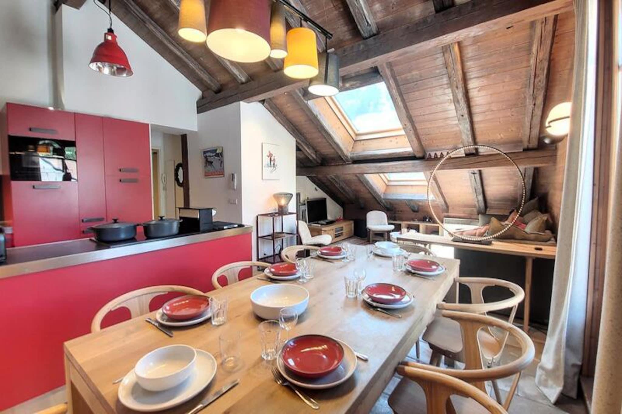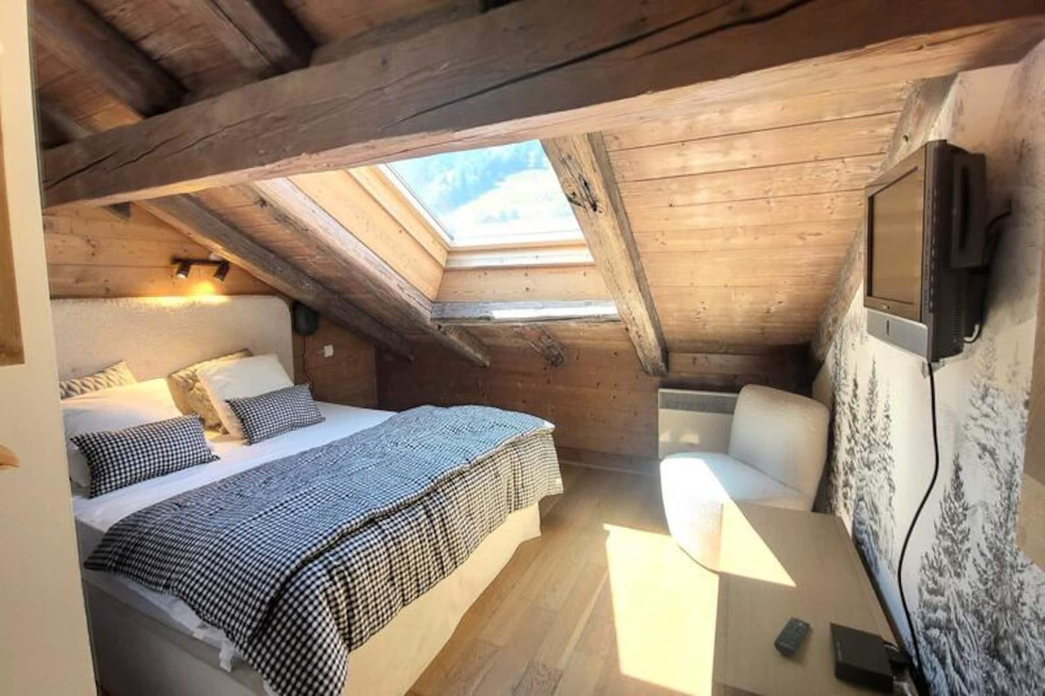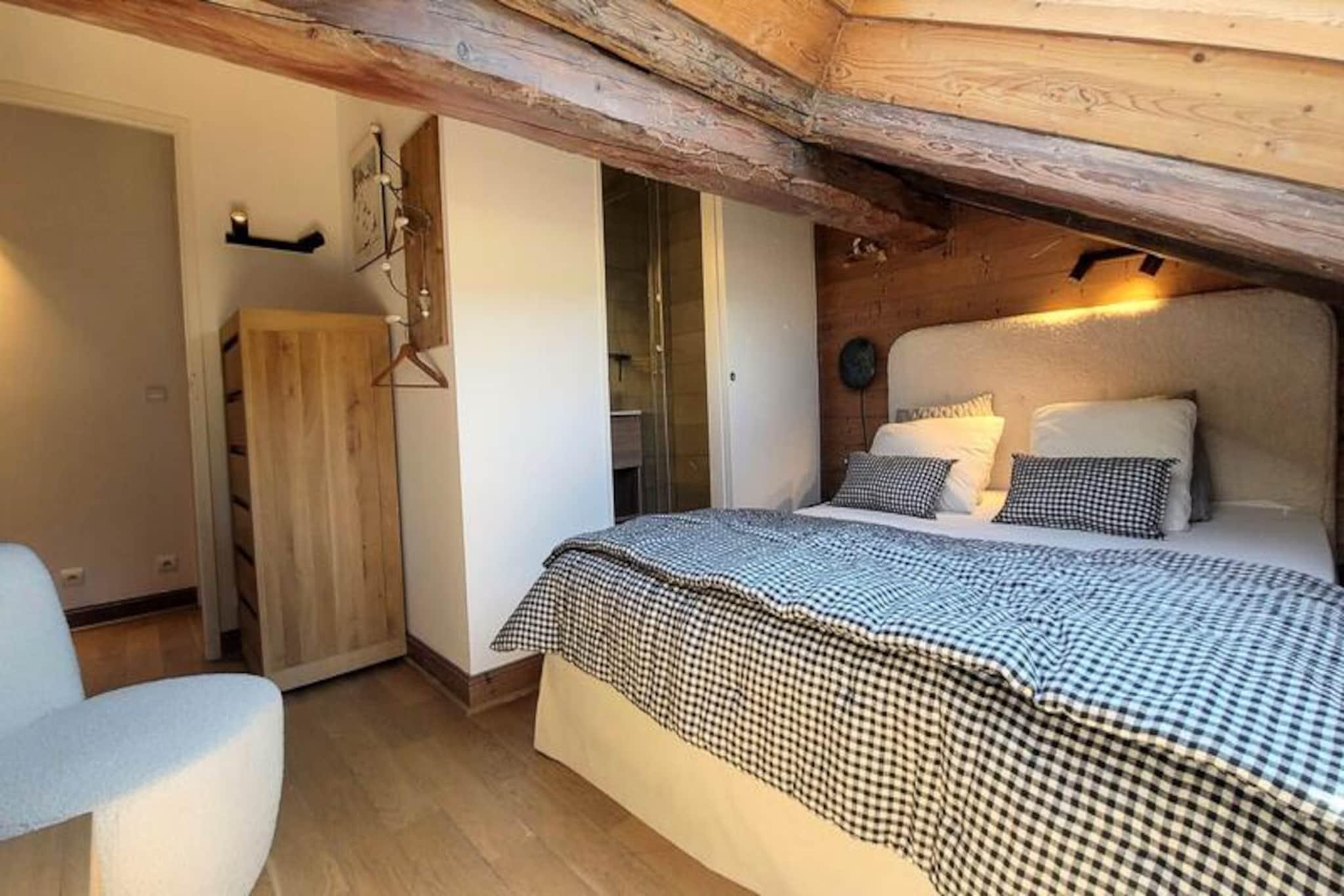 I hjertet af den charmerende gamle landsby Les Gets tilbyder denne penthouselejlighed et roligt tilflugtssted kun få skridt fra det pulserende lokale liv og Mont Cherys skiløjper. Forestil dig at vågne op til den maleriske udsigt over landsbyen fra din stue, med den blide summen af ??alpeliv omgivende dig. Uanset om du er her for vintersport eller sommereventyr, blander denne bolig autentisk savoyardsk charme med moderne komfort for at skabe en uforglemmelig ferieoplevelse. \n\nDenne 5-værelses lejlighed strækker sig over 70 m² boligareal og i alt 95 m² og er omhyggeligt designet til op til otte gæster. Beliggenheden på tredje sal, der er tilgængelig med elevator, sikrer privatliv og ro. Den rummelige stue har et fuldt udstyret køkken, en hyggelig spiseplads og en skrånende stue oplyst af et ovenlysvindue. Fire soveværelser med eget badeværelse giver rigelig komfort, herunder en master suite med vestvendt udsigt, perfekt til afslapning efter en dag med udforskning. Moderne bekvemmeligheder såsom individuel opvarmning, fjernsyn i alle værelser og en brændeovn bidrager til den varme og indbydende atmosfære. \n\nTræd udenfor, og du befinder dig kun 100 meter fra landsbyens centrum og 150 meter fra de nærmeste skiløjper. Butikker, restauranter og den franske skiskole ligger alle inden for gåafstand, hvilket gør denne beliggenhed ideel til bekvemmelighed og eventyr. Om sommeren forvandles området til et paradis for vandrere og cyklister, med stier, der snor sig gennem betagende alpine landskaber. \n\nUanset om du søger spændende skidage, rolige bjergture eller blot et hyggeligt sted at genoprette forbindelsen med dine kære, lover denne penthouselejlighed i Les Gets en ferie fyldt med komfort, charme og uforglemmelige minder.
