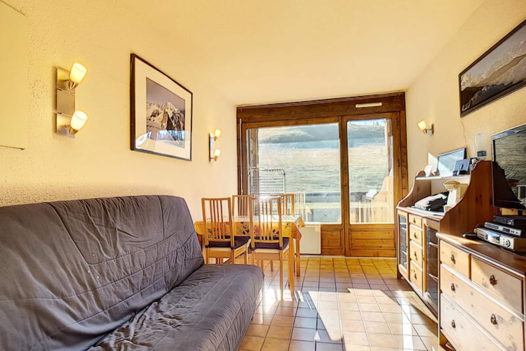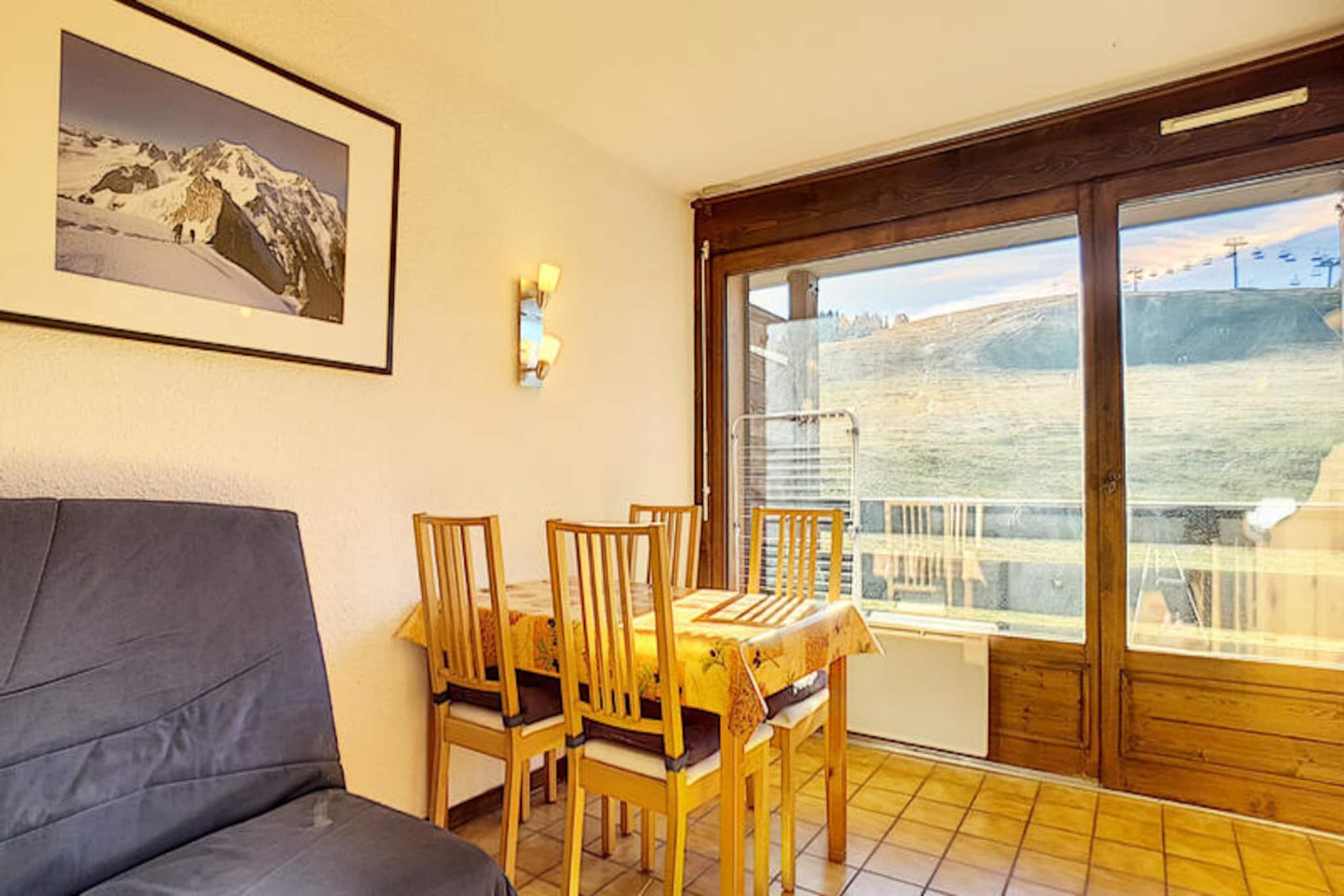 Højt over den charmerende landsby Les Gets tilbyder denne hyggelige studiolejlighed på 28 m² et perfekt tilflugtssted for bjergentusiaster. Kun 60 meter fra skiløjperne på Plateau des Chavannes kan du nemt træde ud og omfavne det alpine eventyr. Den sydøstvendte balkon tilbyder et roligt sted at nyde den betagende udsigt over snedækkede pister og majestætiske tinder, hvilket gør hvert øjeblik uforglemmeligt. Uanset om du er her for spændingen ved skiløb eller roen i bjerglivet, lover denne studiolejlighed et mindeværdigt ophold. \n\nIndvendigt er lejligheden omhyggeligt designet til at maksimere komfort og funktionalitet. En sovealkove med en køjeseng og en sovesofa i stuen sikrer rigelig plads til op til fire gæster. Det moderne brusebad og separat toilet tilføjer bekvemmelighed, mens det fuldt udstyrede køkken med køleskab, mikrobølgeovn, ovn, opvaskemaskine og kaffemaskine inviterer dig til at tilberede solide måltider efter en dag på pisterne. Yderligere faciliteter såsom vaskemaskine, tv og internetadgang sikrer en problemfri og afslappende oplevelse. \n\nUd over pisterne ligger den pulserende bymidte kun 4 kilometer væk, og den er let tilgængelig via gratis shuttlebusser, der kører dag og nat. Her finder du et udvalg af restauranter, butikker og lokale attraktioner. Om sommeren forvandles Les Gets til et paradis for udendørsaktiviteter med højdepunkter som den naturskønne Les Gets golfbane og den rolige Lac des Écoles. \n\nMed sin uovertrufne beliggenhed, moderne faciliteter og charme året rundt er denne lejlighed den perfekte base for din bjergferie. Uanset om du jagter puddersne om vinteren eller udforsker alpine stier om sommeren, tilbyder Les Gets noget særligt for enhver smag.